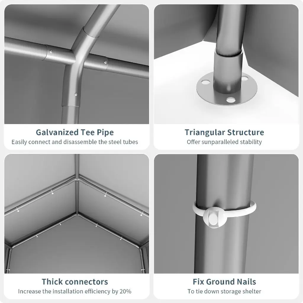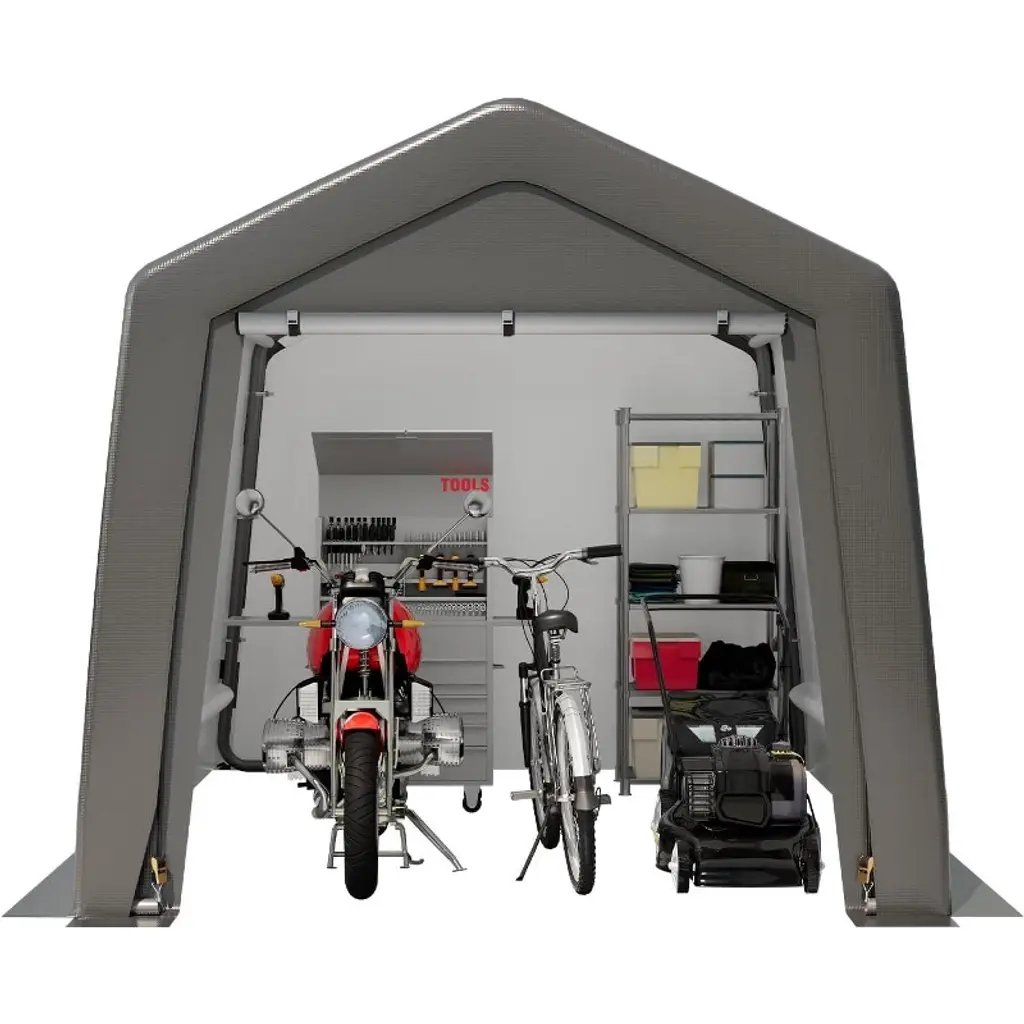 This heavy-duty outdoor storage tent features thick iron pipes and waterproof 7.08 mil PE tarp, it offers excellent waterproofing, UV, and snow resistance, ensuring long-term protection for motorcycles and other items. The removable rolled-up door provides flexible access and ventilation, while the easy assembly makes it perfect for quick setups. Versatile in use, it serves as a motorcycle shelter, tool shed, or utility room for all your outdoor storage needs. Key Features:Reinforced structures with 1.46 inch spray coating iron pipe , study base plateAII weather tarp that is anti-UV, anti- snow and waterproofNo additional tools required to assemblyUtility portable garage to protect all your belongs Specification: Material: iron & 7.08 mil PE tarpSize(ft): 6x6x7/6x8x7/7x10x7.36/7x12x7.36/10x10x7.36/10x15x8 Notes:Do not place this item for extended periods of time in extreme weather, strong winds, blizzards, or storms. Please clear the snow in winter in a timely manner. For long-term use and safety, please ensure the use of ropes and ground anchors to maintain stability.