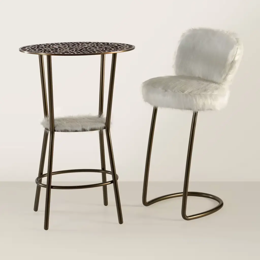 A testament to traditional artisanal craftsmanship combined with an elegant contemporary style, this stool or side table boasts a sleek and singular silhouette. Part of the '70s Collection, it is fashioned of bronze powder paint-finished steel, and features a distinctive top made with melted aluminum. Completed with a lower top upholstered with white-beige fabric. Please consult the Concierge for further details.