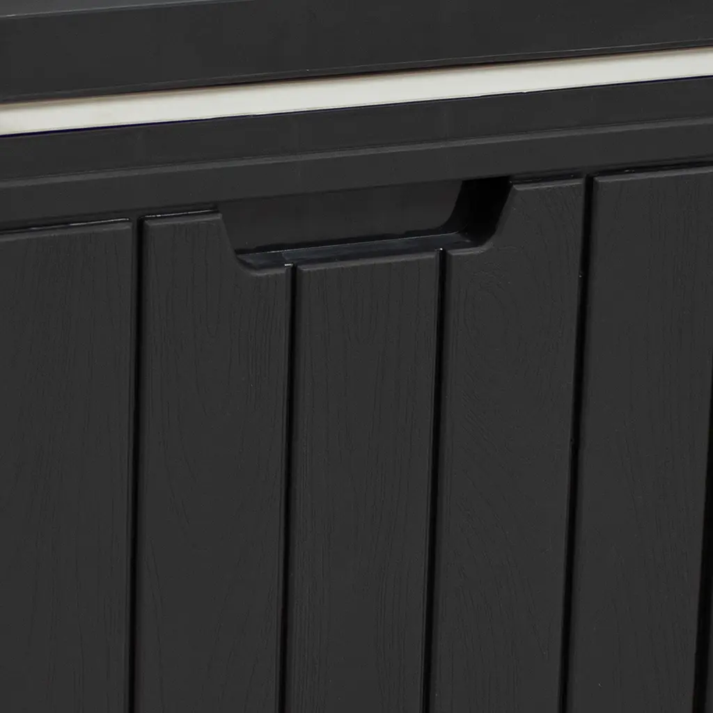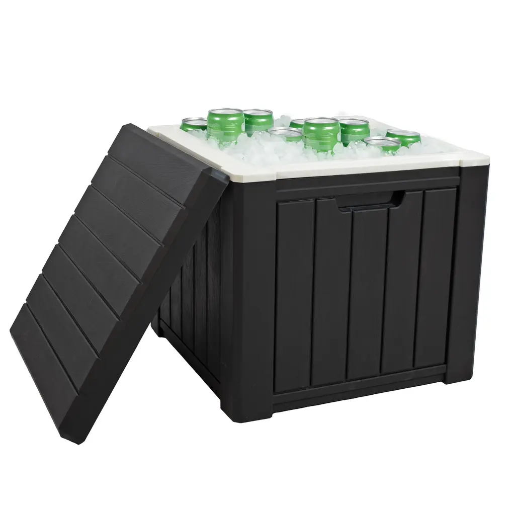 SKU: TST-752 9-Gallon Outdoor Beverage Cooler for Patio - Polypropylene Resin - Black Serve up crisp, cool drinks on a hot day with this stylish and convenient 9-gallon outdoor side table beverage cooler. Made from durable polypropylene resin, this deck box cooler is durable enough to resist the outdoor elements and sturdy enough to be used as extra seating or as a side table. The top lid is capable of supporting up to 110 lbs. The cooler can hold up to 40 12-ounce beverage cans so there will always be enough drinks for everyone. It will keep the drinks cool for up to 6 hours. The embedded handles on either side of the box make it easy to lift and move from place to place. It is a wonderful addition to the patio, deck, or near the pool during the next barbecue, picnic, or outdoor party. It features a sophisticated wood-like appearance in classic black to complement any decor style. Features: Additional Details: The digital images we display have the most accurate color possible. However, due to differences in computer monitors, we cannot be responsible for variations in color between the actual product and your screen.