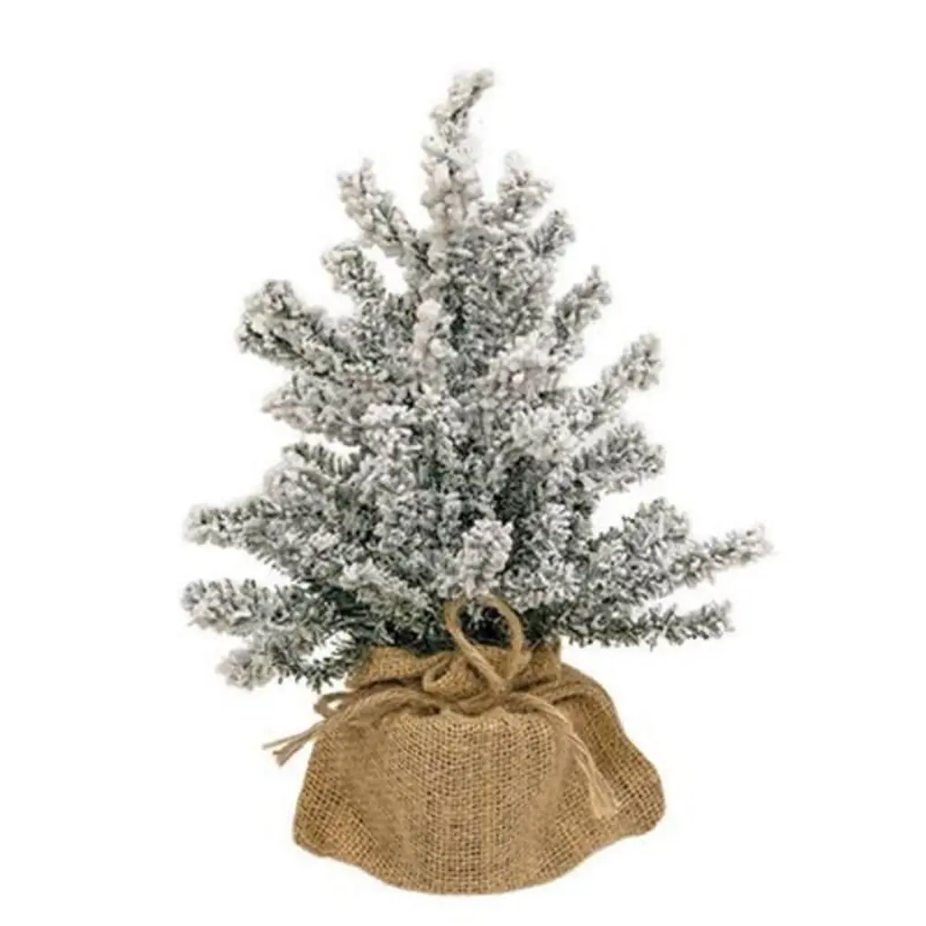 This adorable tree is perfect for decorating in small spaces. It features delicately flocked tips creating a snowy winter feel. Add this to your mantles, or side tables for a winter wonderland touch to your holiday decor. Features: Unlit 15 tips Flock gives the effect of freshly fallen snow Comes in a red burlap covered base Accented with a flocked pine cone Recommended for indoor use Dimensions: 9"H x 4.5"W x 1.75"D Material(s): plastic/burlapNote: Branches are compressed for shipment, and need to be fluffed out upon arrival to look like the photo.