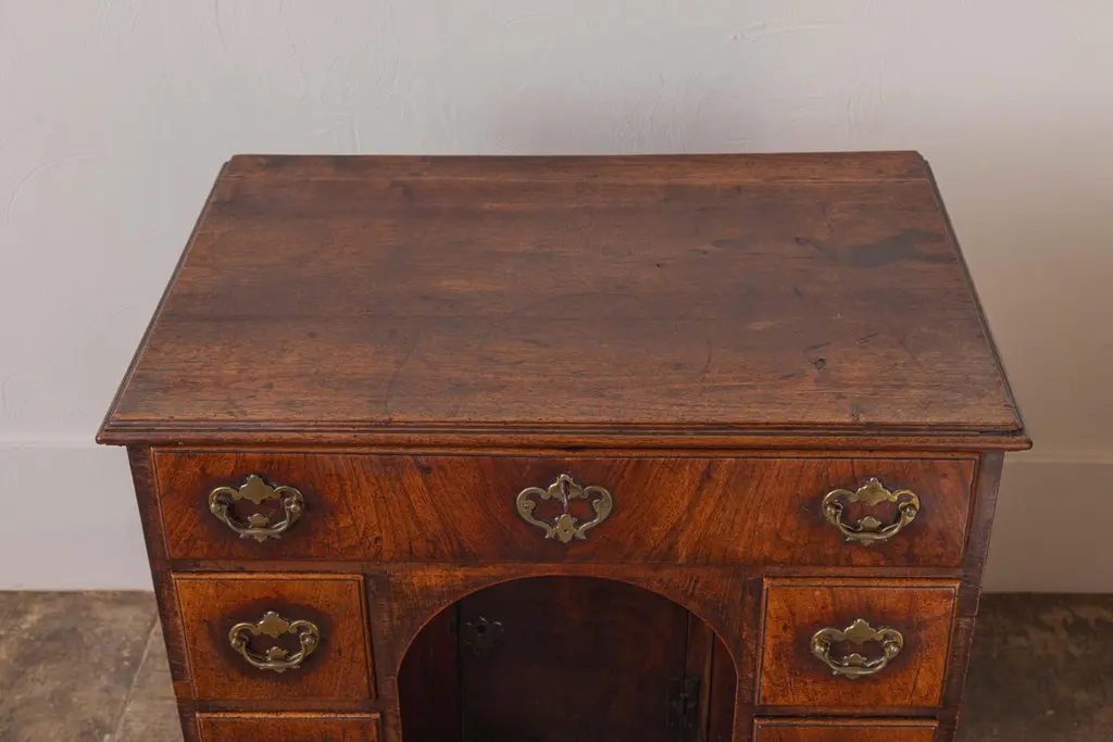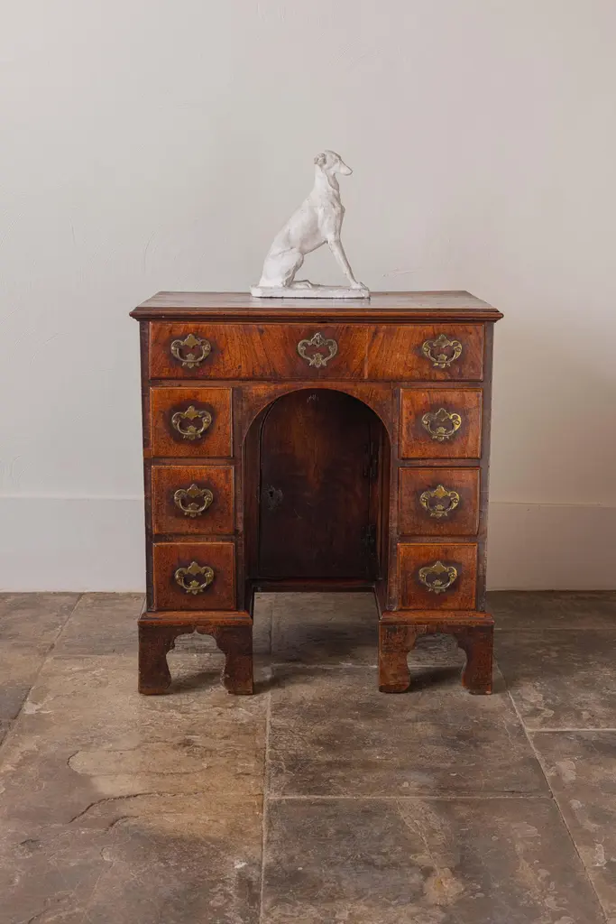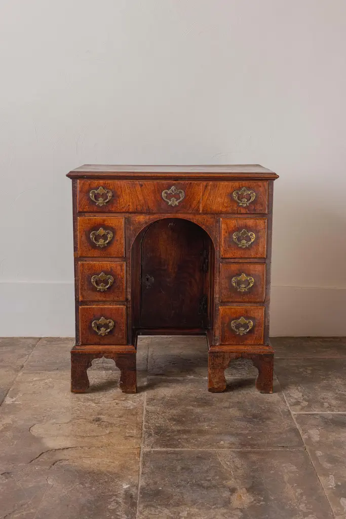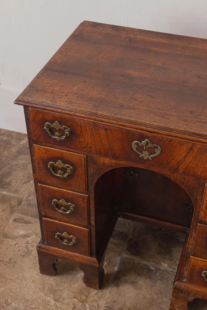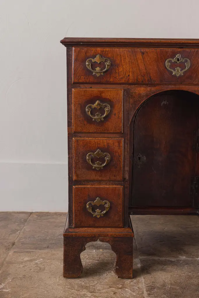 A perfect, small Georgian kneehole desk on raised ogee bracket feet with key. In particularly good condition for its age, retaining its batwing handles. Where this once would have sat in a gentleman’s dressing room or study, today it would make a lovely small desk or bedside table.England, circa 1750