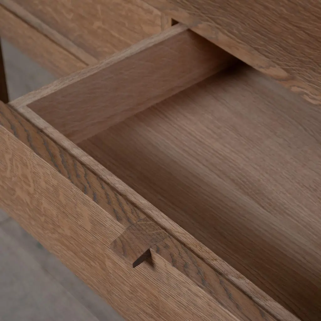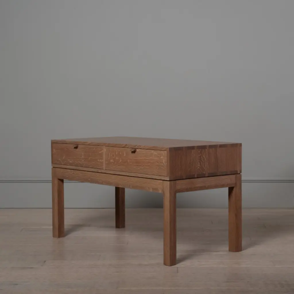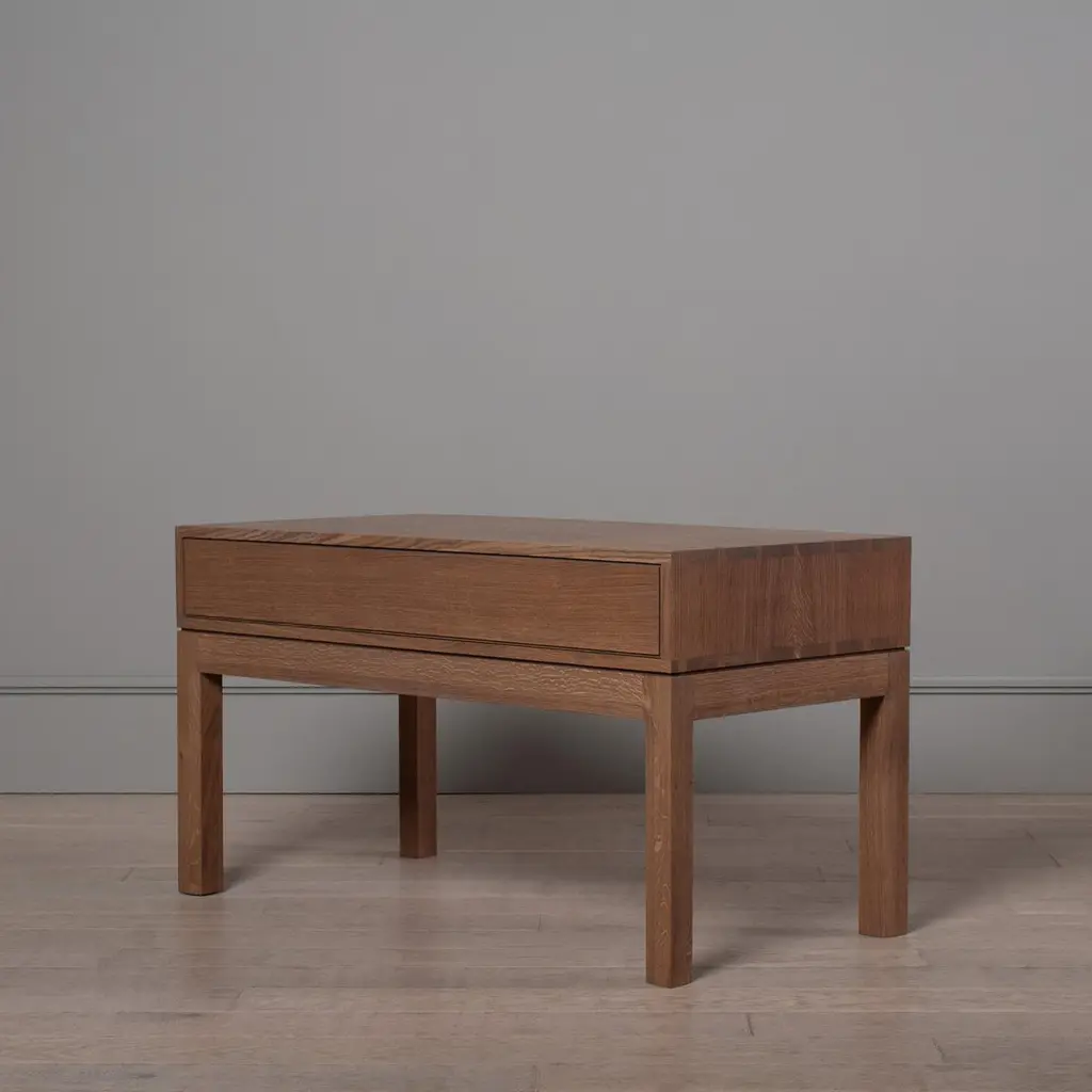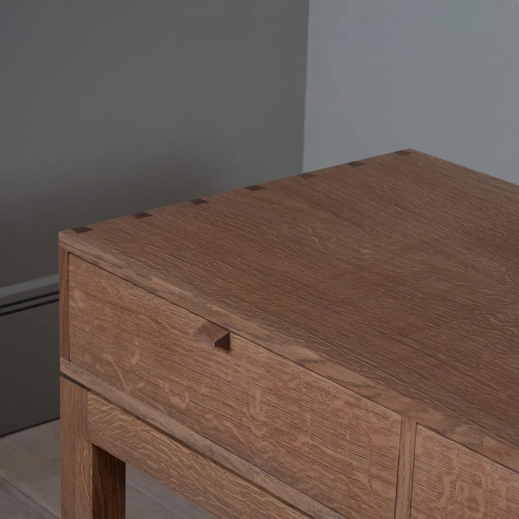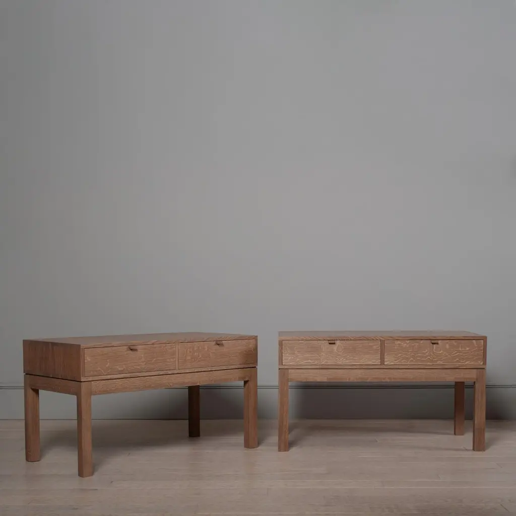 A pair of very large proportion 2 drawer handcrafted night stands (or end tables). The main upper box is detailed with exposed hand-cut dovetail jointing and shadow rebate. It comprises of 2 spacious traditional dovetail jointed drawers and a slight curve design is cut into and around the legs and follows along the facia. The rear has a traditional insert panel.A substantial piece of furniture that is built to last.This particular version has been finished with a very gentle ash grey oil. However, finishes can be requested to requirements.Designed and handmade by our highly skilled craftspeople in England. Hand finished in very durable oils. These are constructed from the finest English quartersawn oak.This is a contemporary modernist design with Scandinavian influences utilising authentic and traditional English furniture craftsmanship and fine timbers.These can be made to your custom dimensions/bespoke design if required. Also available in American black walnut.Contact us for international shipping quotations.We design bold and distinctive pieces of furniture – our main objective is combining the design alongside the natural beauty and properties of the raw materials.These timbers and materials are very carefully chosen for each specific design - maintaining our focus on the benefits, visual impact and strengths of what we use. Our regular use of English Quartersawn Oak is one case in point. It has been the beloved timber of fine furniture makers across the world for centuries. It is costly to produce but gives huge benefits and rewards such as its striking medullary rays and superb stability qualities. By utilising these wonderful and naturally occurring features with our contemporary designs we aim to continue creating some very distinct, tactile and idiosyncratic pieces.These are all completely handmade, in very small numbers, by our skilled craftspeople in England.