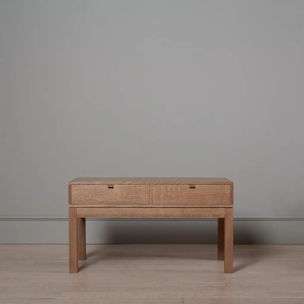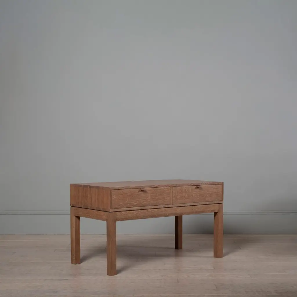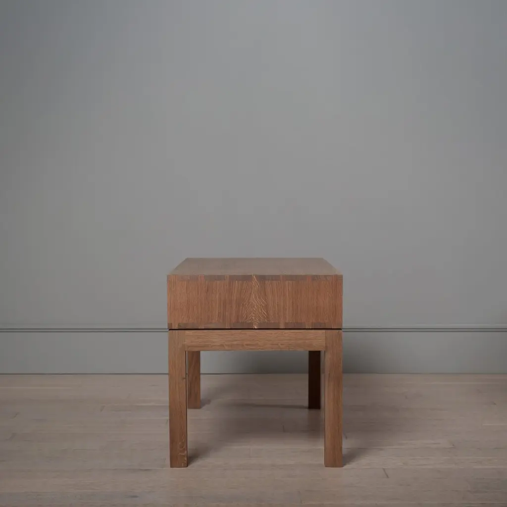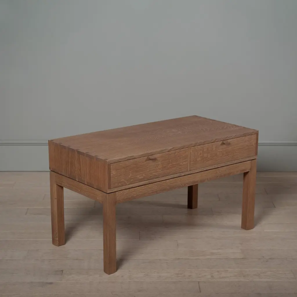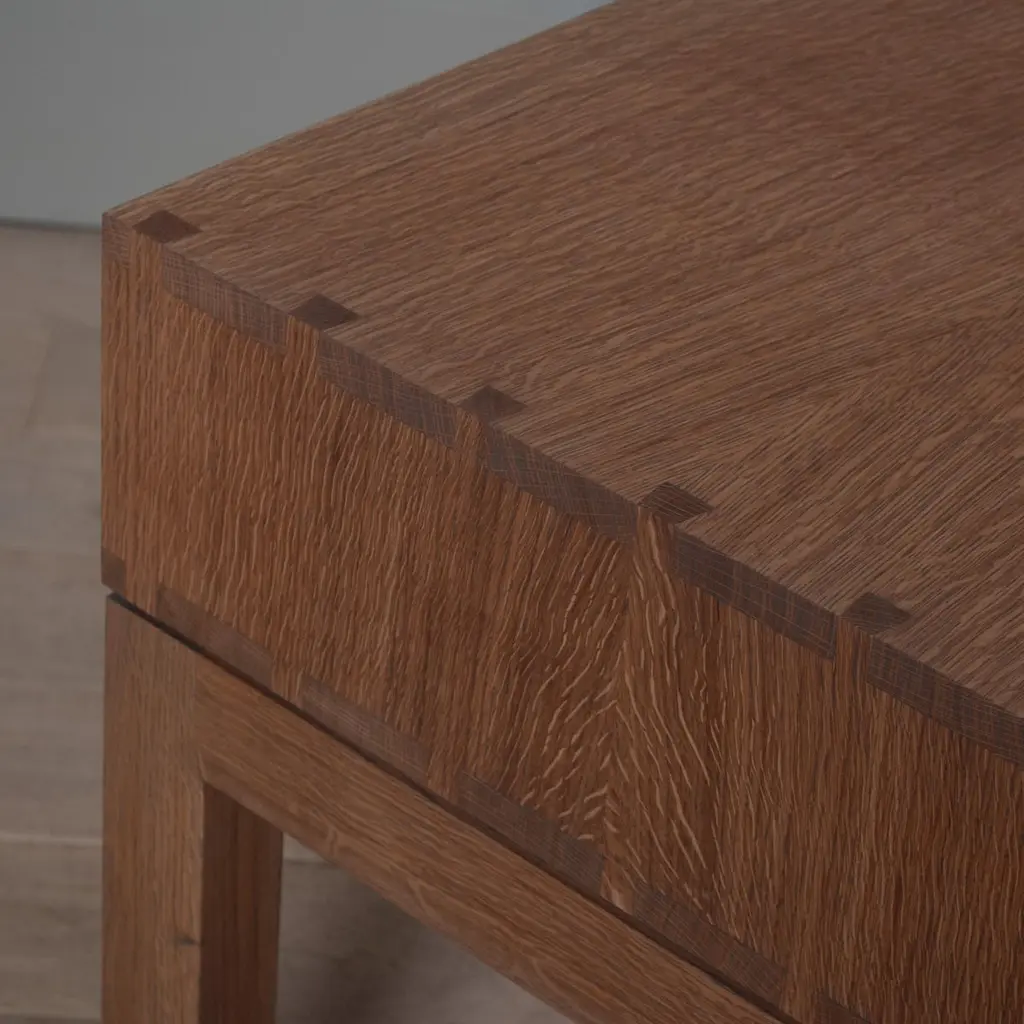 A pair of very large proportion 2 drawer handcrafted night stands (or end tables). The main upper box is detailed with exposed hand-cut dovetail jointing and shadow rebate. It comprises of 2 spacious traditional dovetail jointed drawers and a slight curve design is cut into and around the legs and follows along the facia. The rear has a traditional insert panel.A substantial piece of furniture that is built to last.This particular version has been finished with a very gentle ash grey oil. However, finishes can be requested to requirements.Designed and handmade by our highly skilled craftspeople in England. Hand finished in very durable oils. These are constructed from the finest English quartersawn oak.This is a contemporary modernist design with Scandinavian influences utilising authentic and traditional English furniture craftsmanship and fine timbers.These can be made to your custom dimensions/bespoke design if required. Also available in American black walnut.Contact us for international shipping quotations.We design bold and distinctive pieces of furniture – our main objective is combining the design alongside the natural beauty and properties of the raw materials.These timbers and materials are very carefully chosen for each specific design - maintaining our focus on the benefits, visual impact and strengths of what we use. Our regular use of English Quartersawn Oak is one case in point. It has been the beloved timber of fine furniture makers across the world for centuries. It is costly to produce but gives huge benefits and rewards such as its striking medullary rays and superb stability qualities. By utilising these wonderful and naturally occurring features with our contemporary designs we aim to continue creating some very distinct, tactile and idiosyncratic pieces.These are all completely handmade, in very small numbers, by our skilled craftspeople in England.