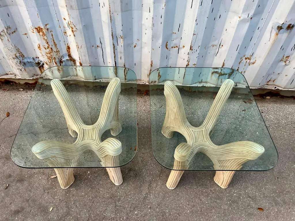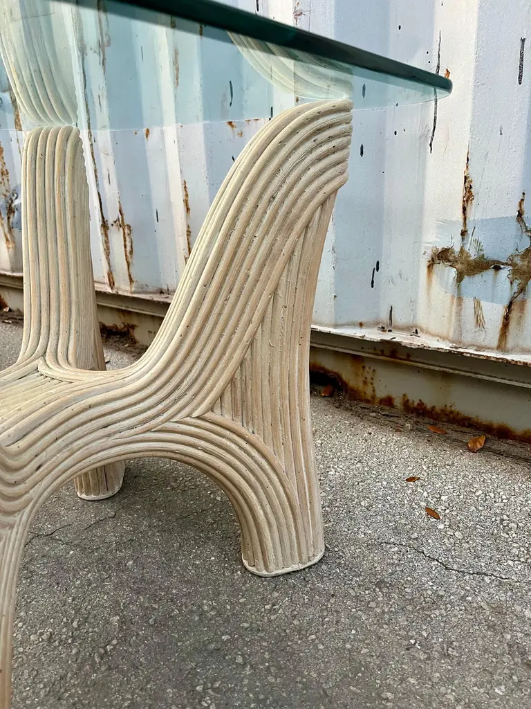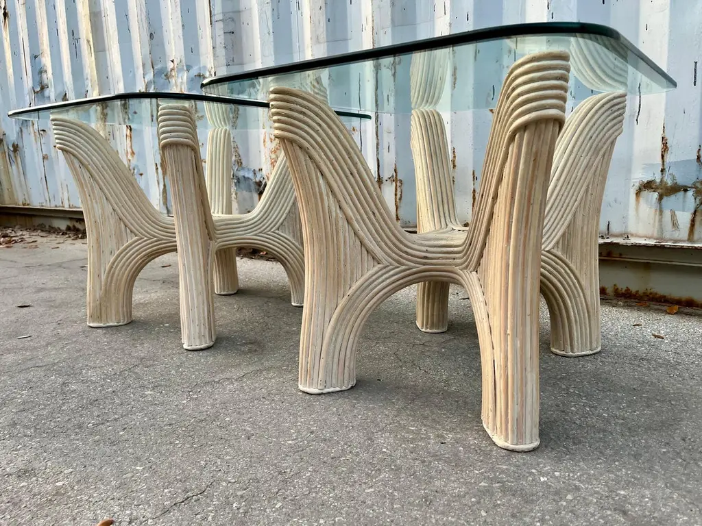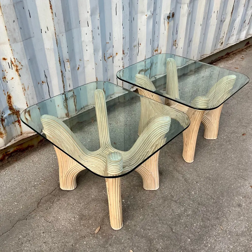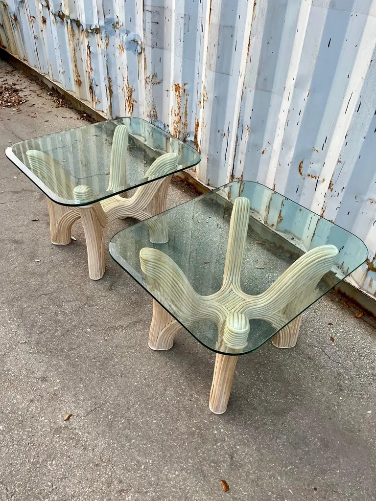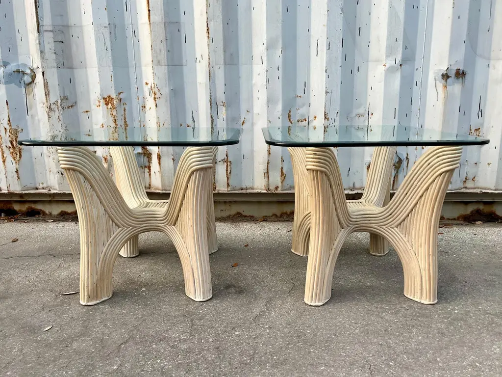 A Pair of Vintage Pencil Reed Coastal Style Rattan End Tables. Circa 1980s Feature pencil reed veneered bases with beveled glass tops. It is in excellent, near-mint condition with very minor signs of wear and age. Please see close-up pictures for more details.Dimensions W 30" x D 25" x H 21" Please check the matching coffee table also listed in our store.