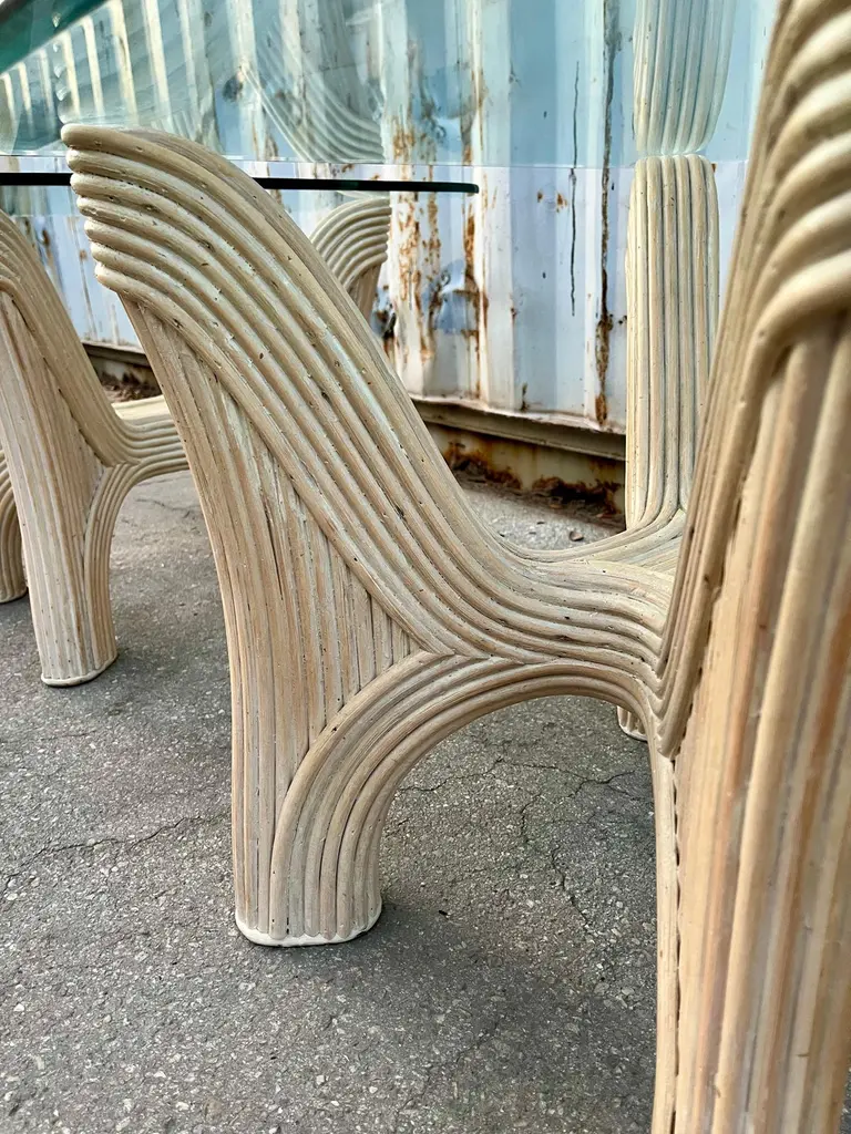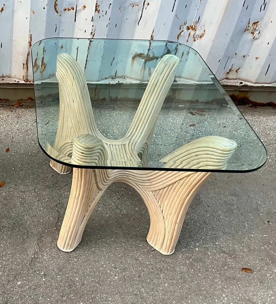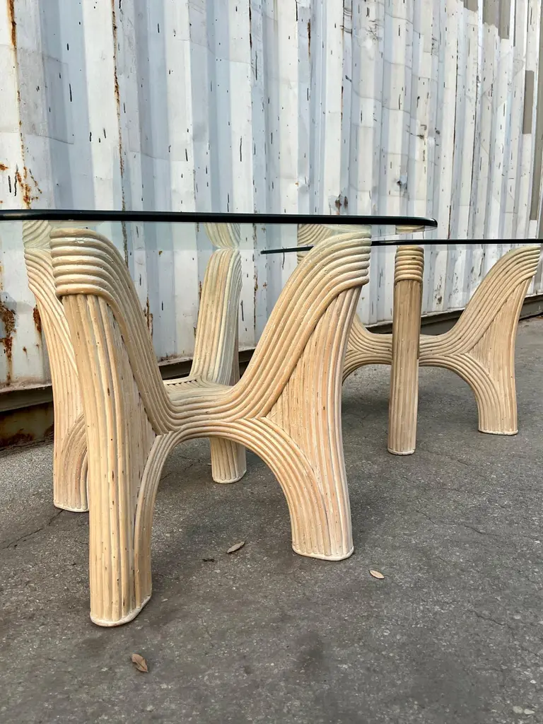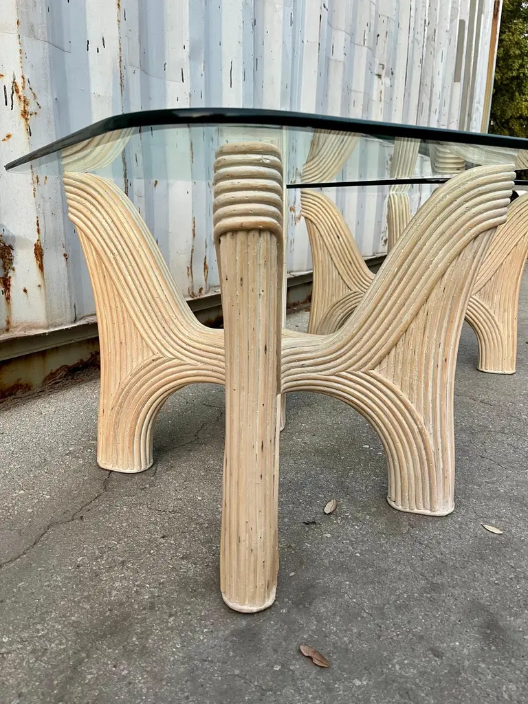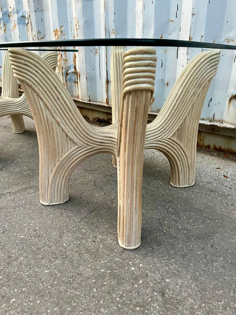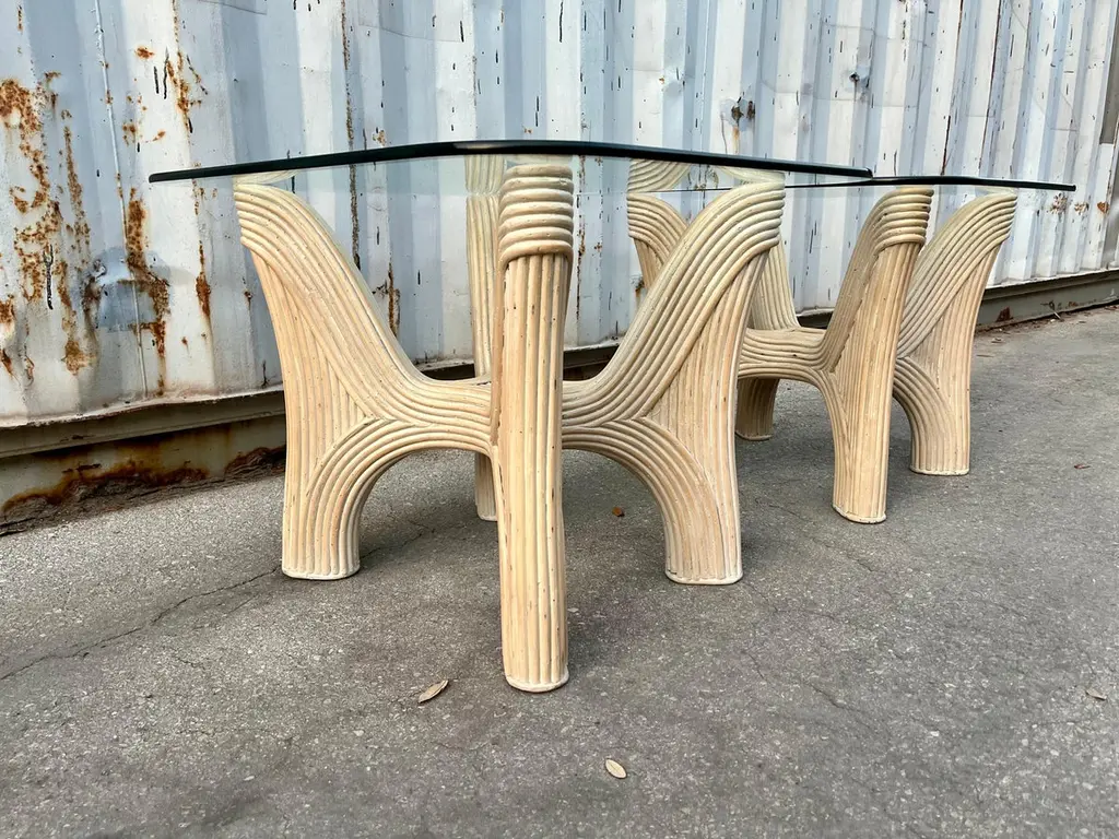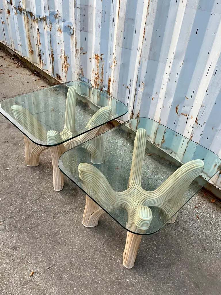 A Pair of Vintage Pencil Reed Coastal Style Rattan End Tables. Circa 1980s Feature pencil reed veneered bases with beveled glass tops. It is in excellent, near-mint condition with very minor signs of wear and age. Please see close-up pictures for more details.Dimensions W 30" x D 25" x H 21" Please check the matching coffee table also listed in our store.