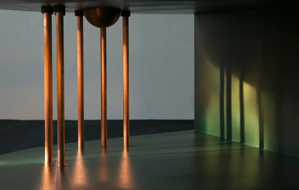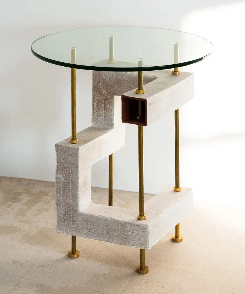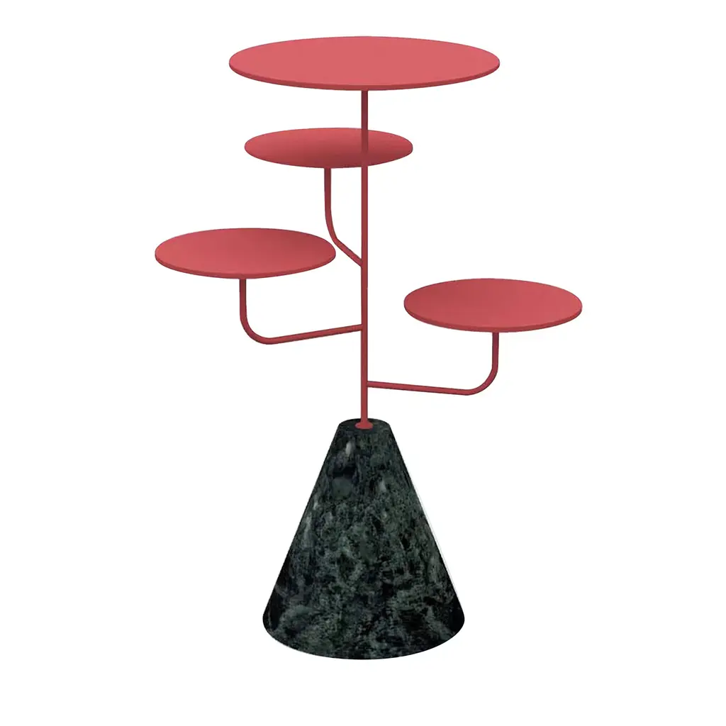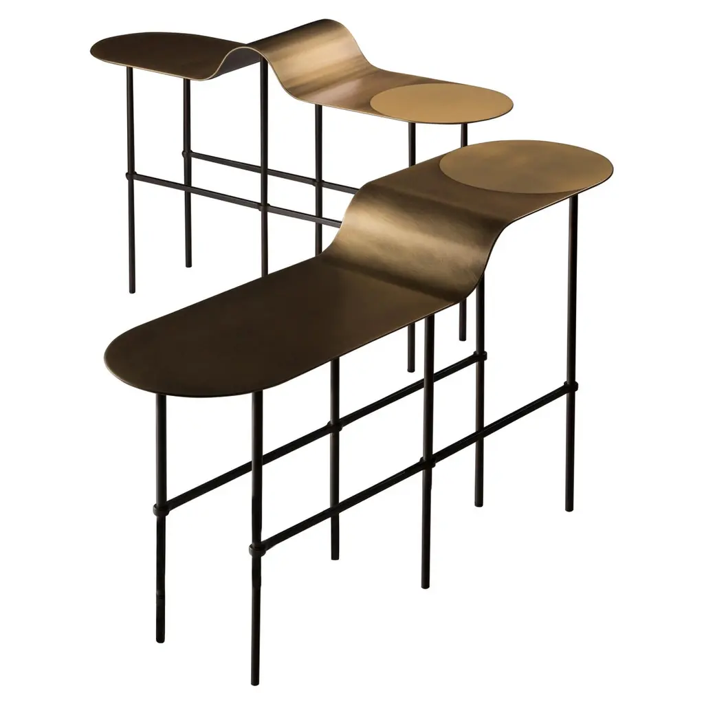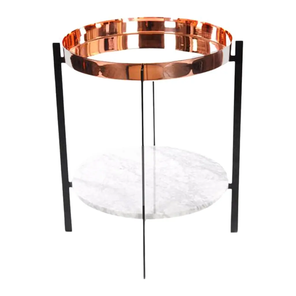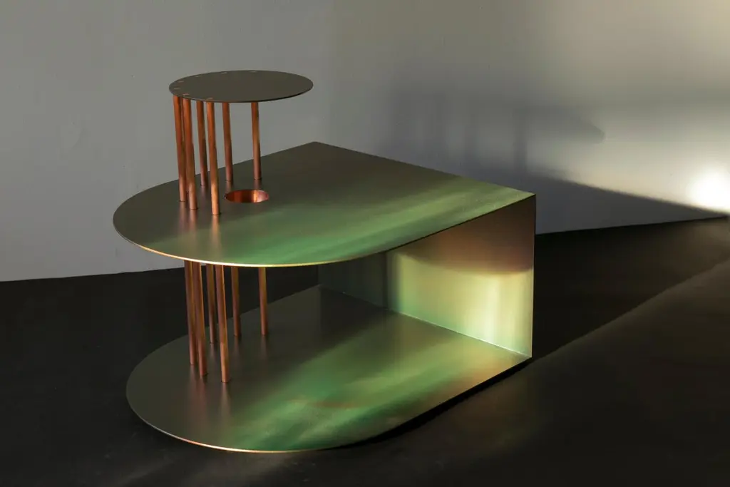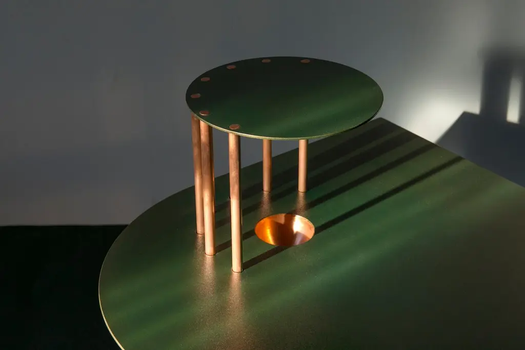 A Penny For Your Thoughts Side Table pairs raw copper with welded steel for an elegant and honest piece of design. The powder-coated steel body is pierced by 5/8" thick solid copper rods, left exposed on the top shelf almost like inlaid pennies. These rods support the weight of the steel, creating a strong surface throughout without sacrificing the visual lightness of the 1/8" steel sheet. The powder-coating combines the natural green and red hues of copper that have an almost chameleon-like effect depending on how the light hits it. There is an integrated copper salt well inset in the piece, though jewelry or small objects work just wellMicah Rosenblatt is a Brooklyn-based designer and metalworker. He specializes in sculptural furniture that pairs industrial forms with a whimsical edge.