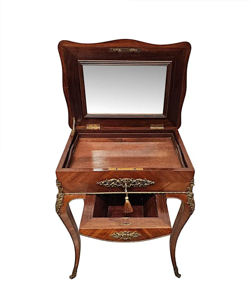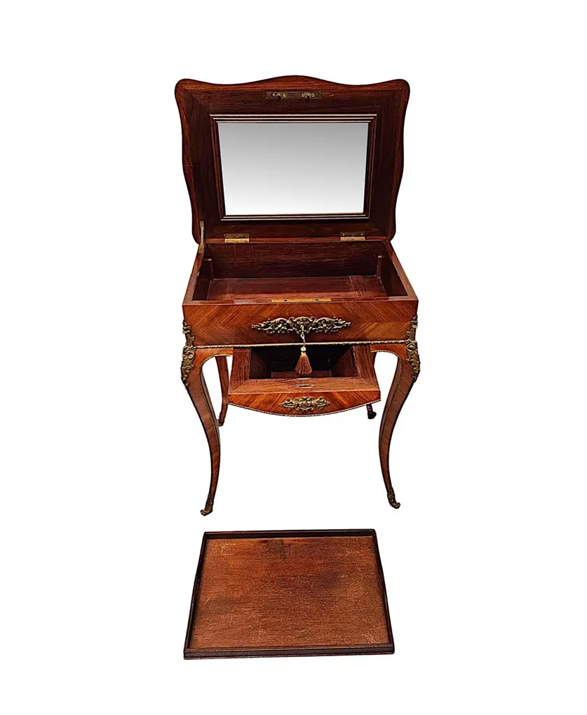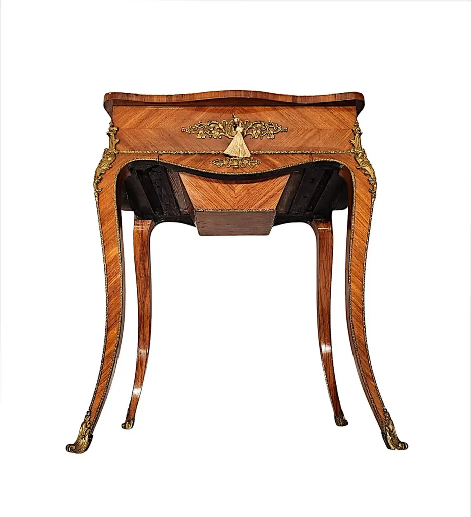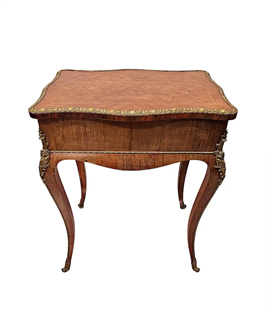 A very fine 19th Century kingwood side table or ladies work box. This fabulous piece is of exceptional quality, beautifully hand carved, fitted with finely cast ormolu mounts with stunning foliate motif detail and is quarter veneered throughout with beautifully rich patination and fine grain. The well figured serpentine line inlaid and quarter veneered ormolu framed top of rectangular form with centred diamond parquetry detail to the central reserve opens upwards to reveal a mirror glass plate set within a reeded border. The fitted section below features a removable tray with fret cut carrying handles to each side above a storage compartment. Raised over an elegantly simple serpentine frieze with centred ormolu mounts and fitted with single pull out work drawer with decorative ormolu escutcheon and key. Supported on slender, gracefully tapering cabriole leg with featuring further ormolu mounts to the knee and foliate cast sabot foot.