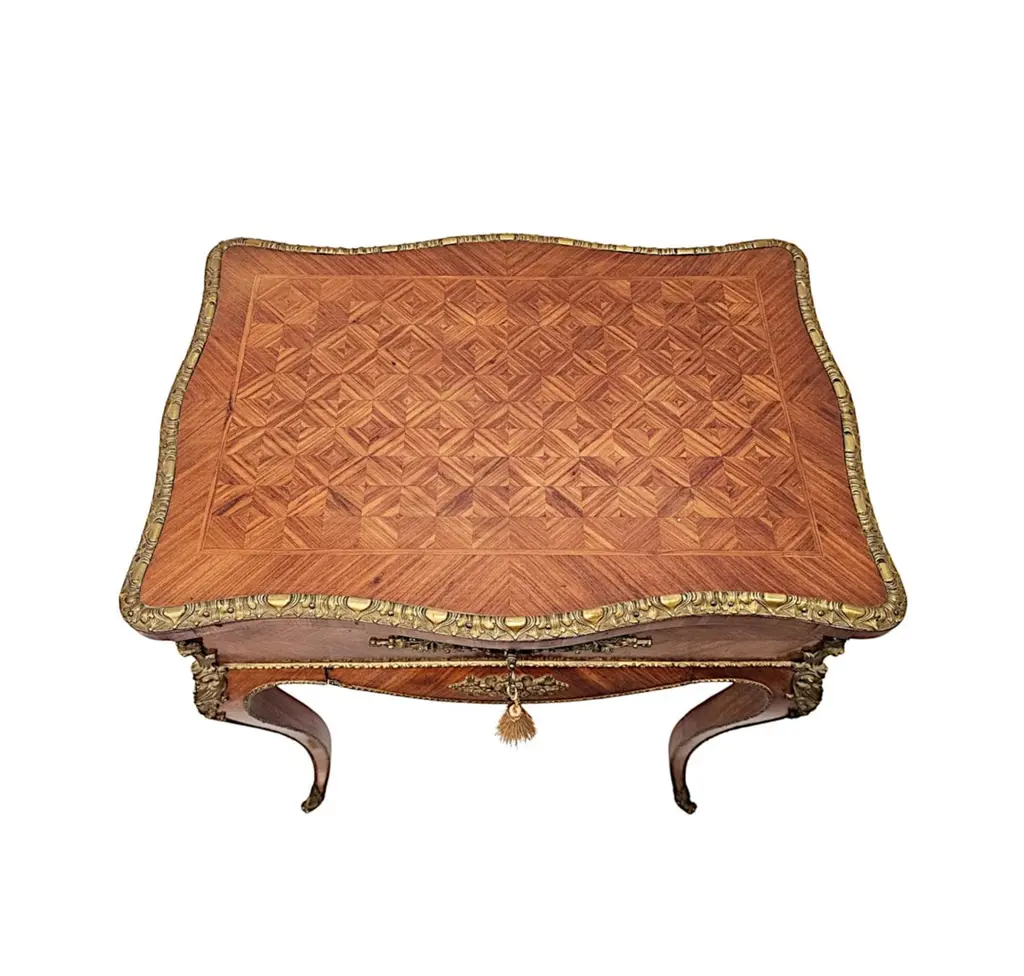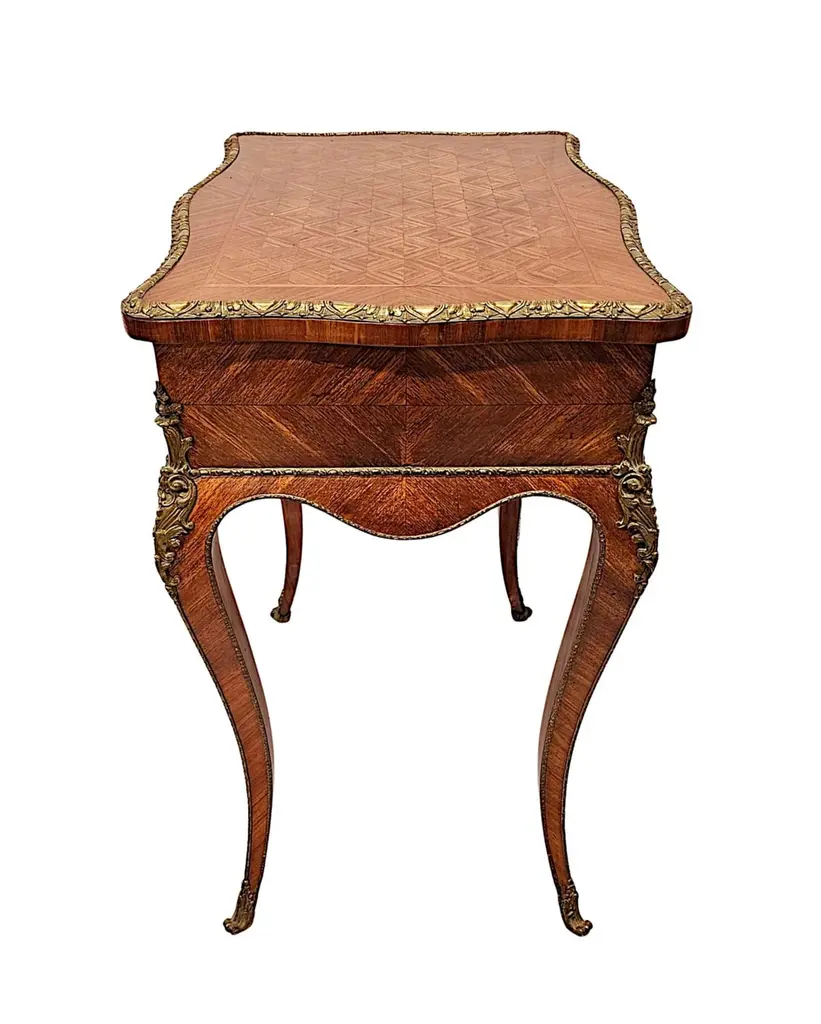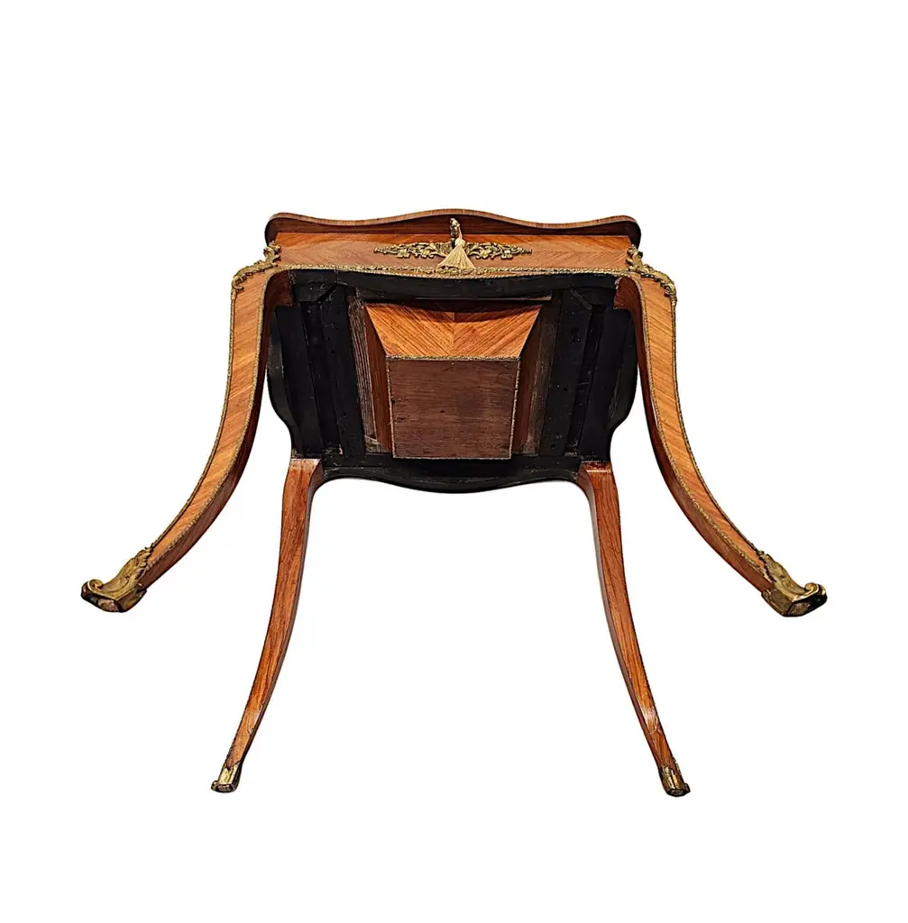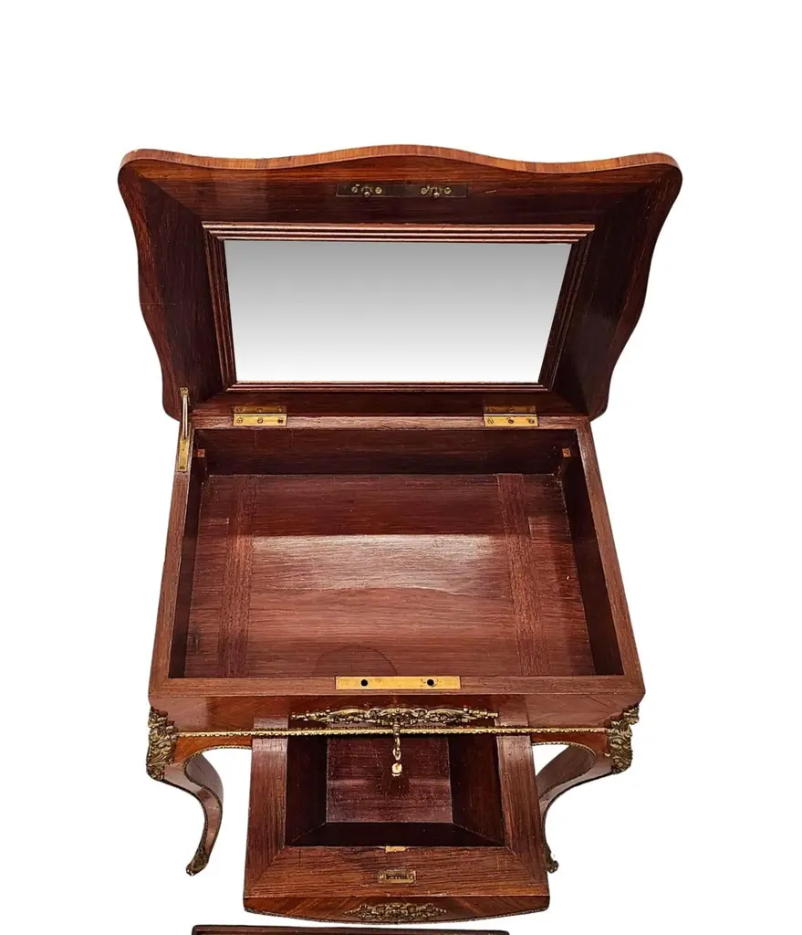 A very fine 19th Century kingwood side table or ladies work box. This fabulous piece is of exceptional quality, beautifully hand carved, fitted with finely cast ormolu mounts with stunning foliate motif detail and is quarter veneered throughout with beautifully rich patination and fine grain. The well figured serpentine line inlaid and quarter veneered ormolu framed top of rectangular form with centred diamond parquetry detail to the central reserve opens upwards to reveal a mirror glass plate set within a reeded border. The fitted section below features a removable tray with fret cut carrying handles to each side above a storage compartment. Raised over an elegantly simple serpentine frieze with centred ormolu mounts and fitted with single pull out work drawer with decorative ormolu escutcheon and key. Supported on slender, gracefully tapering cabriole leg with featuring further ormolu mounts to the knee and foliate cast sabot foot.