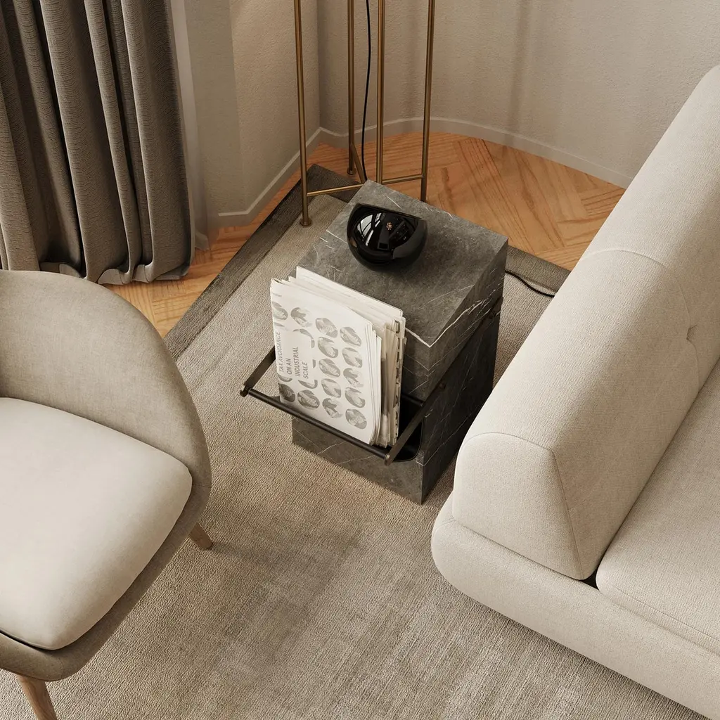 A contemporary side table, crafted from solid marble with intricate natural patterns. Its sculptural design offers dual purpose as a side table as well as providing a unique way to organise and display your favourite magazines or books.The black texture of the leather pouch contrasts sharply with the smooth, cool marble, adding visual depth to the piece while providing practical functionality. This design is not only aesthetically pleasing but also highly functional, making it a beautiful focal point in any living room or study.Available in various marble colour options!Please note, Marble is a natural material and often displays great variations in background colour, veining distribution and veining pattern therefore expect slight variations in the veining and tones upon purchase.Dimensions:45.53151 cm
