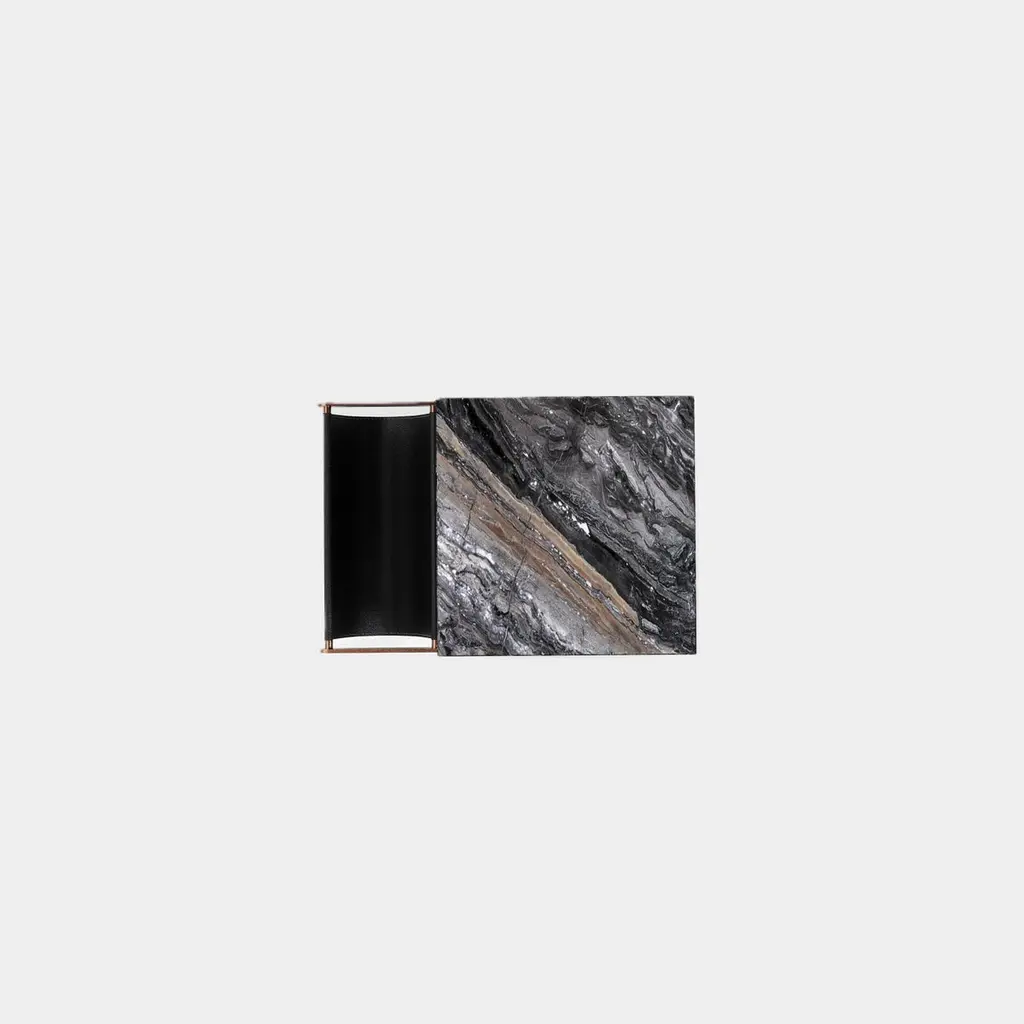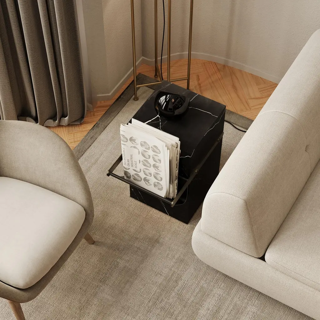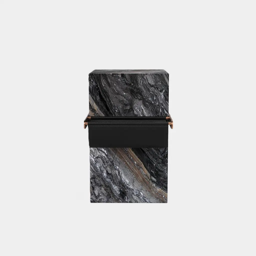 A contemporary side table, crafted from solid marble with intricate natural patterns. Its sculptural design offers dual purpose as a side table as well as providing a unique way to organise and display your favourite magazines or books.The black texture of the leather pouch contrasts sharply with the smooth, cool marble, adding visual depth to the piece while providing practical functionality. This design is not only aesthetically pleasing but also highly functional, making it a beautiful focal point in any living room or study.Available in various marble colour options!Please note, Marble is a natural material and often displays great variations in background colour, veining distribution and veining pattern therefore expect slight variations in the veining and tones upon purchase.Dimensions:45.53151 cm