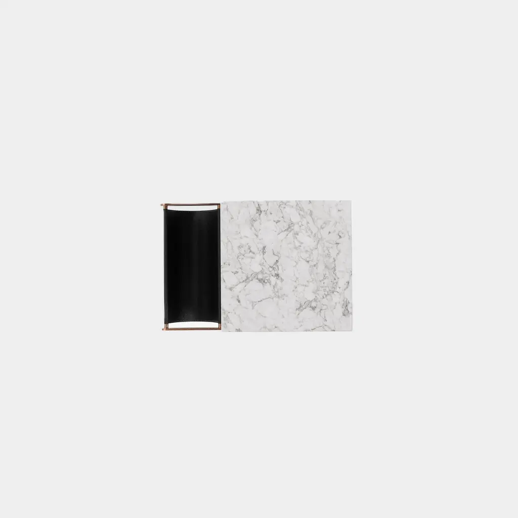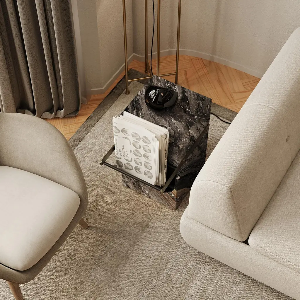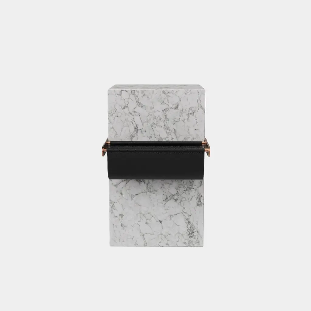A contemporary side table, crafted from solid marble with intricate natural patterns. Its sculptural design offers dual purpose as a side table as well as providing a unique way to organise and display your favourite magazines or books.The black texture of the leather pouch contrasts sharply with the smooth, cool marble, adding visual depth to the piece while providing practical functionality. This design is not only aesthetically pleasing but also highly functional, making it a beautiful focal point in any living room or study.Available in various marble colour options!Please note, Marble is a natural material and often displays great variations in background colour, veining distribution and veining pattern therefore expect slight variations in the veining and tones upon purchase.Dimensions:45.53151 cm