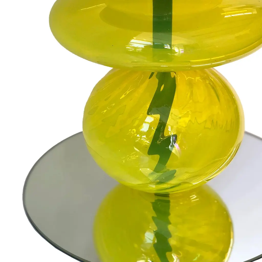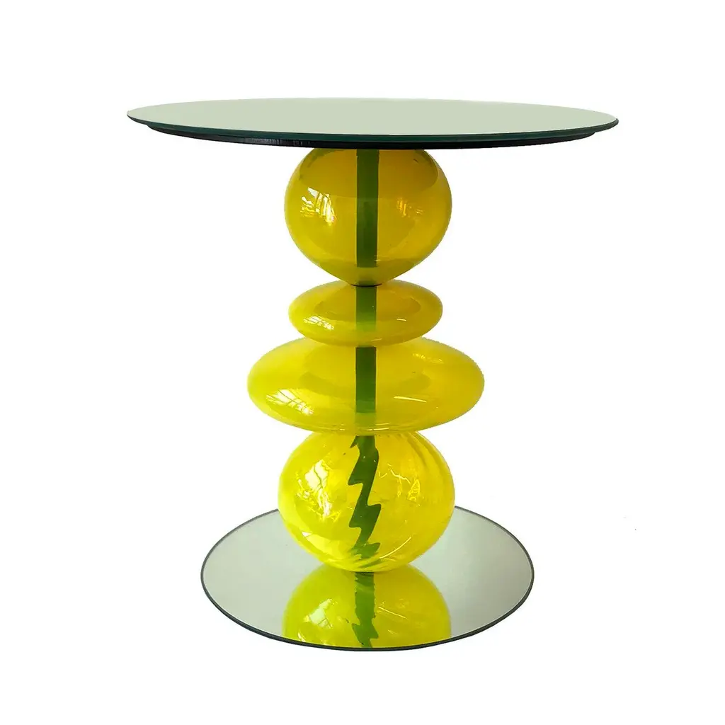 Our Abacus Pieces were intellectually conceived as vertical timelines with each sphere representing a time period or moment. Each “moment in time” is stacked on the next to create a visual composition that illustrates the beauty of collective experiences one may enjoy over a lifetime. Each piece is made to order and no two will ever be the same. Each tower is made of pieces blown by hand using multiple traditional glass blowing techniques in accordance with traditional Murano glass making craftsmanship. 16.25”W x 16.25”D x 20.25”H Glass, Orb, Table, Accent, Furniture, Drink table, Martini table, Occasional table, snack table, art, round , colorful, hand-blown, custom, sculptural furniture, Pantone, small