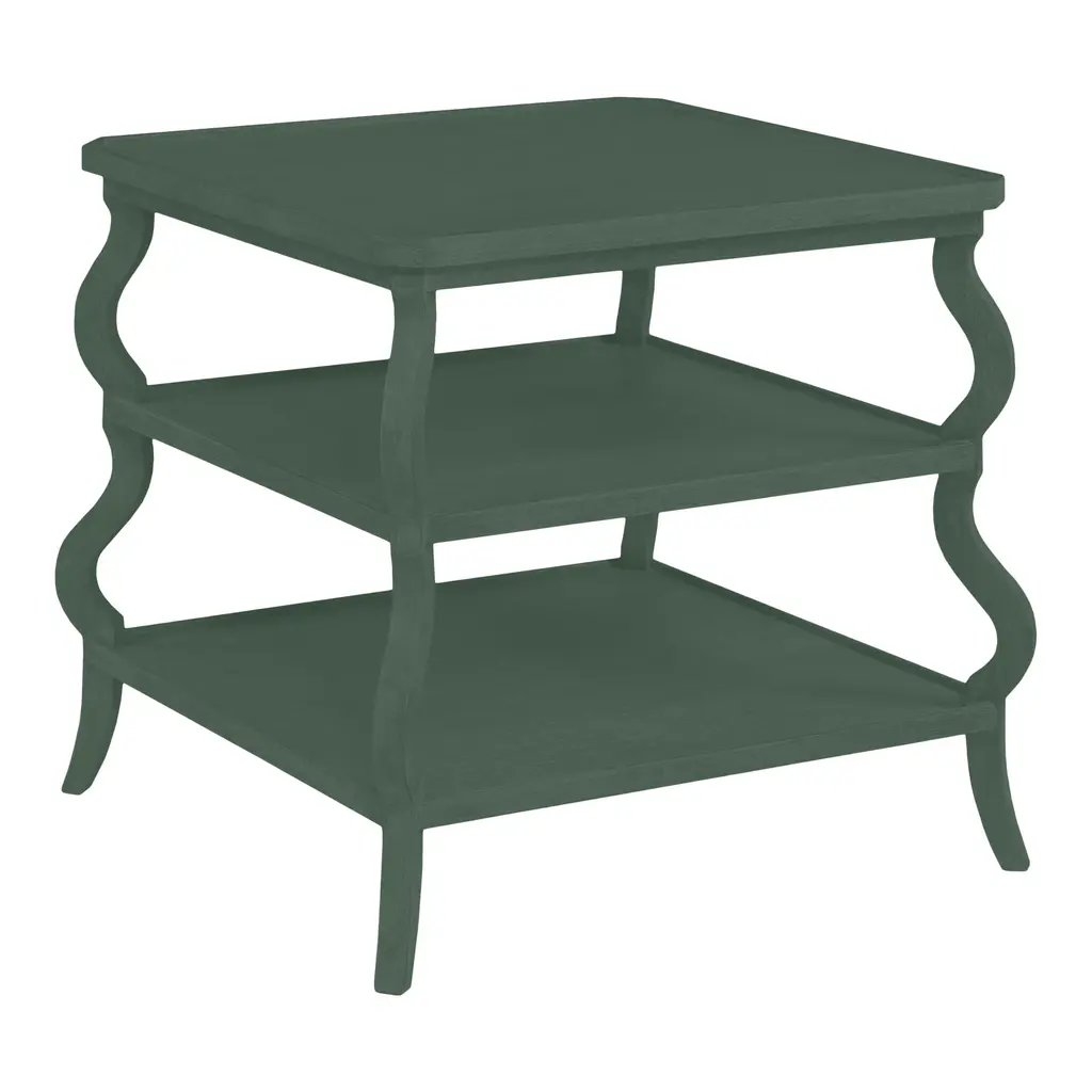 This item is custom painted to order, please allow 8-10 weeks for the item to ship. Casa Cosima presents an exclusive collection of haute bohemian furnishings inspired by the lush, layered interiors of international tastemakers’ private estancias, chateaux and palazzi. Constructed using hand planed square planked cherry top rests over four curvaceous legs. The corner posts are joined by a middle and low shelf. Finisned in a custom Bejamin Moore color.