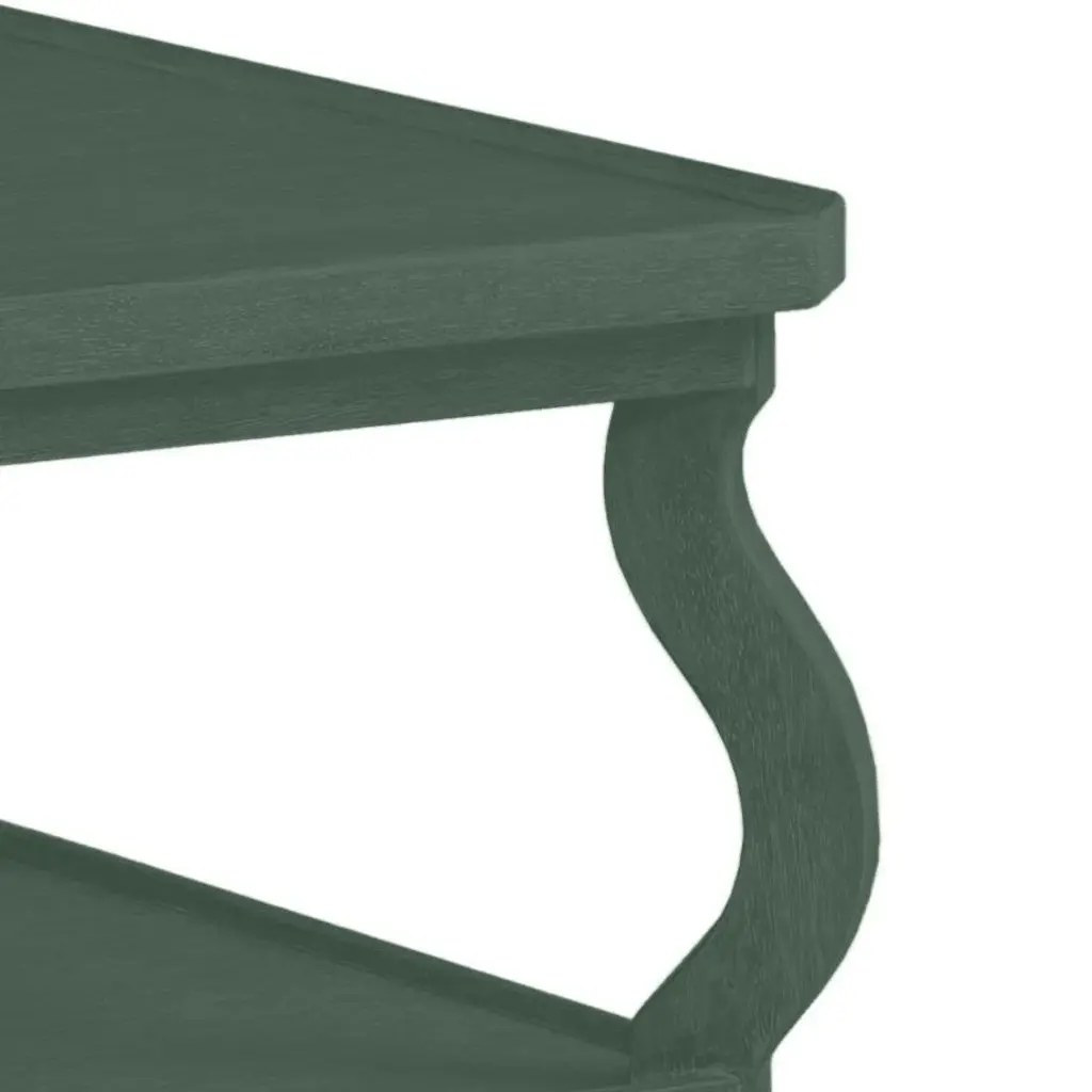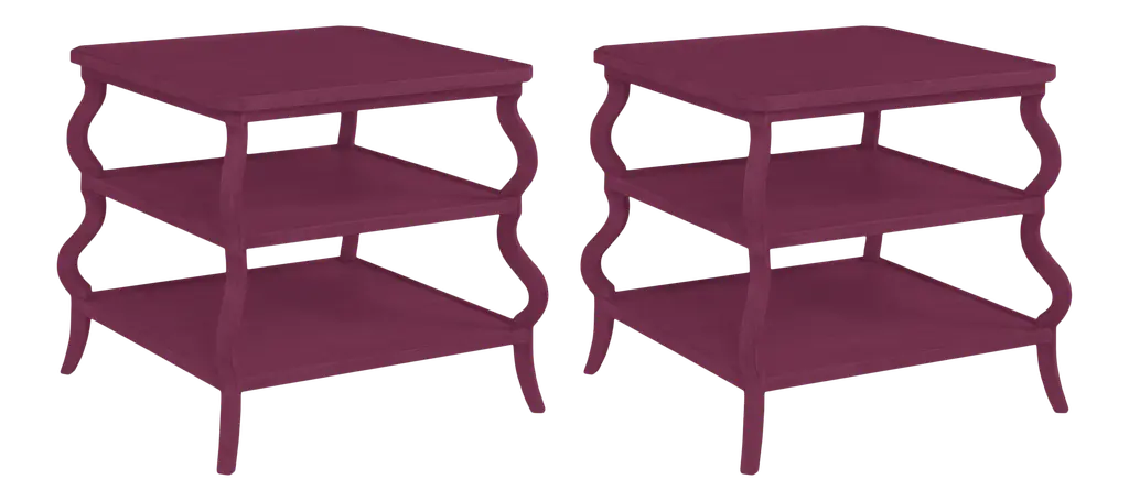 This item is custom painted to order, please allow 8-10 weeks for the item to ship. Casa Cosima presents an exclusive collection of haute bohemian furnishings inspired by the lush, layered interiors of international tastemakers’ private estancias, chateaux and palazzi. Costucted using hand planed square planked cherry top rests over four curvaceous legs. The corner posts are joined by a middle and low shelf. Finisned in a custom Benjamin Moore color. Dust with a dry towel.