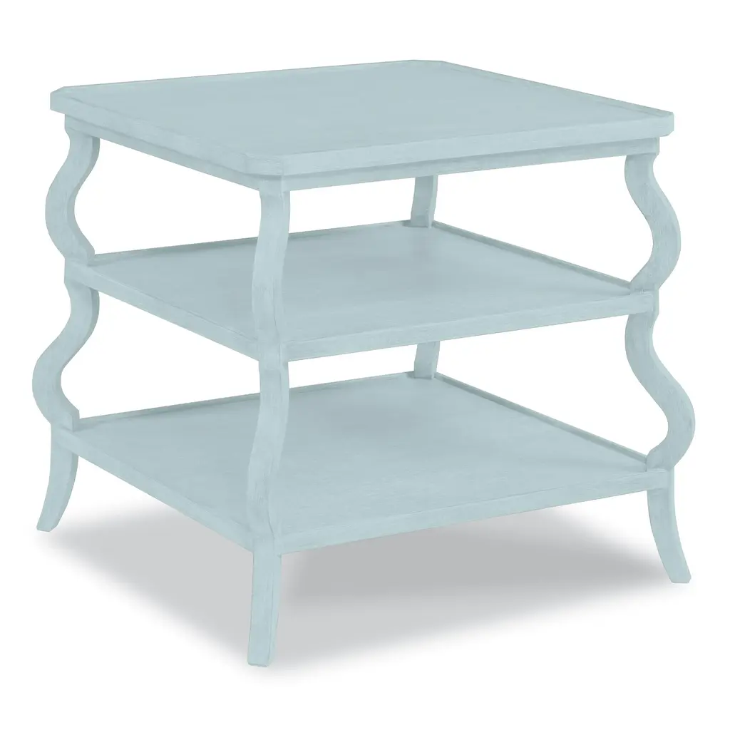 This is a made to order item with a 8-10 week lead time. The color is Benjamin Moore Palladian Blue. A hand planed square planked cherry top rests over four curvaceous legs. The corner posts are joined by a middle and low shelf.
