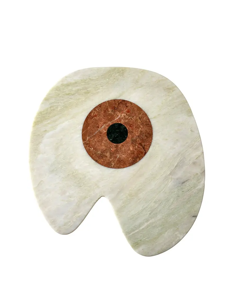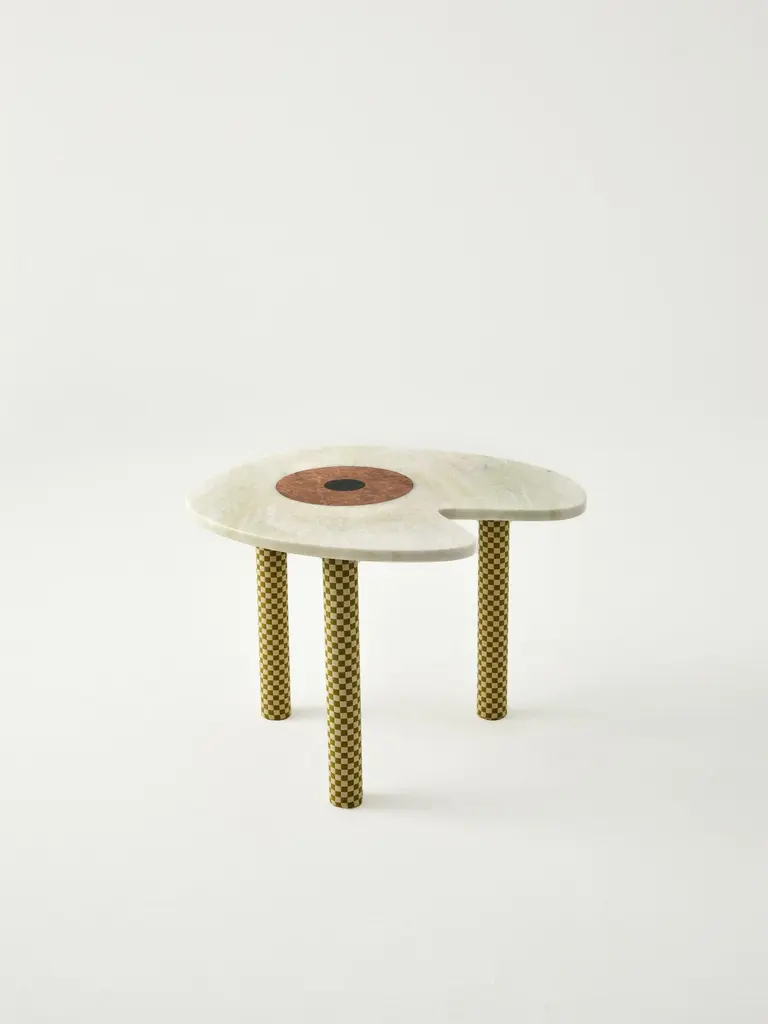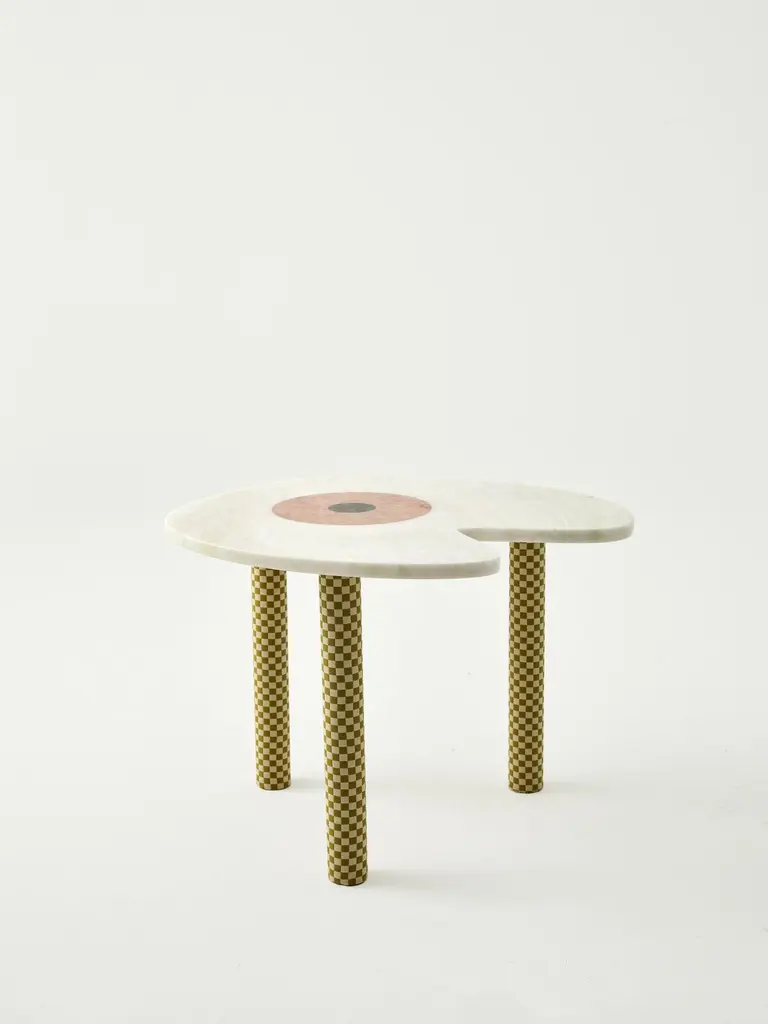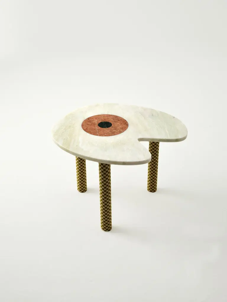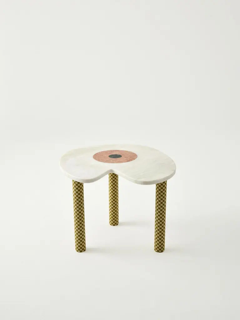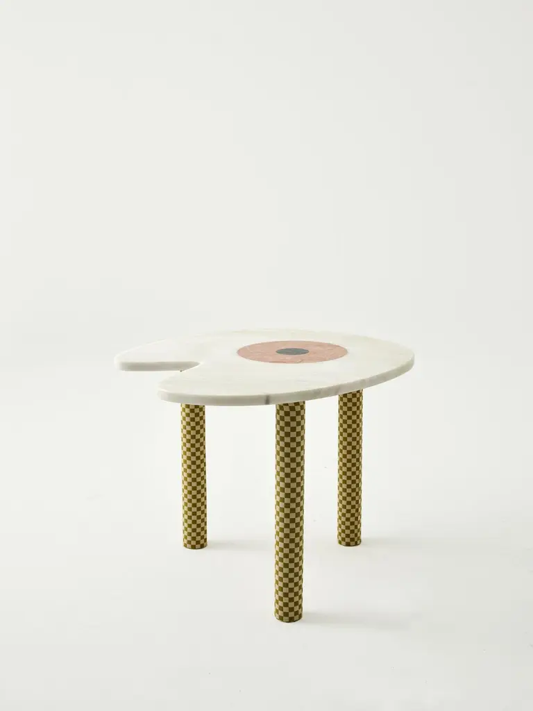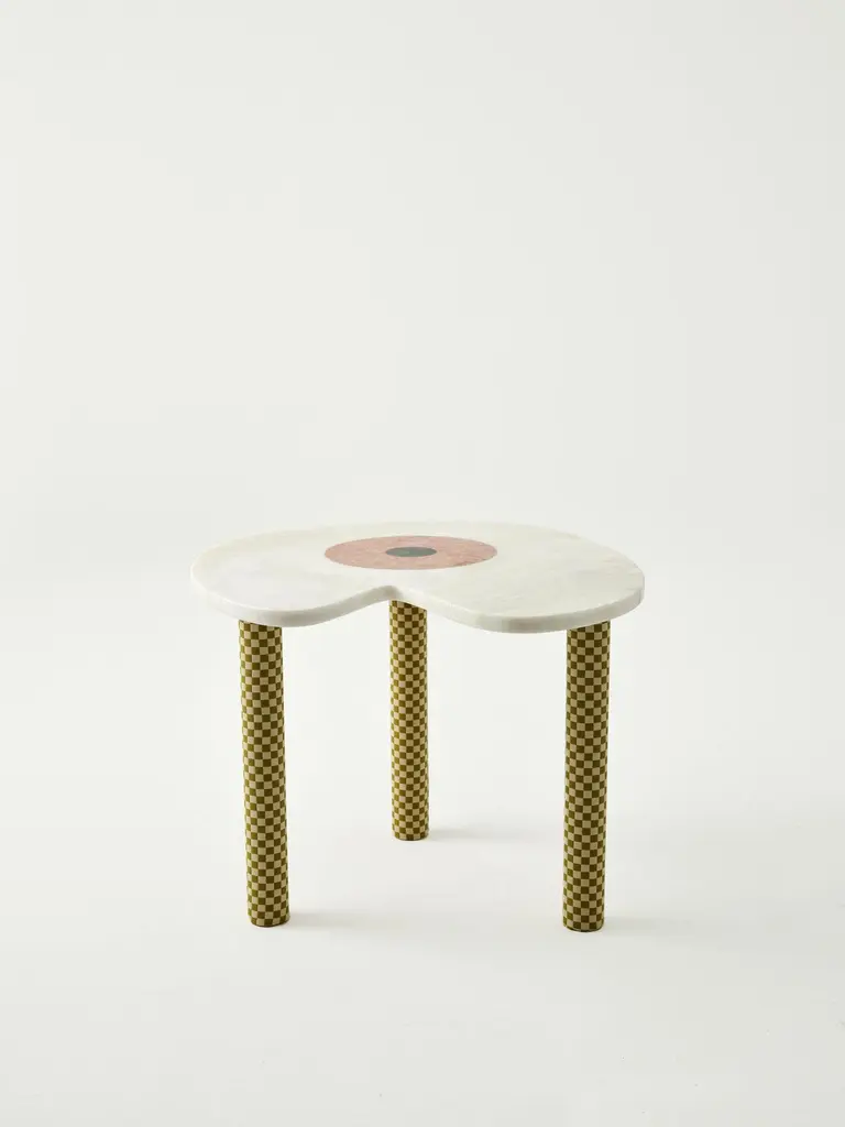 Handcrafted Abide marble side tables are the modern interpretation of the iconic evil eye symbol. The Evil Eye protection consists of an eponymous shield that protects you from the so called evil eyes and indicates spiritual protection. The colorful marble top is combined with Alexander Girard’s famous checker fabric at the bottom. In this version, light green, pink and dark green surface matches with the green and beige upholstered checkered legs.