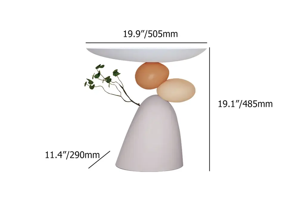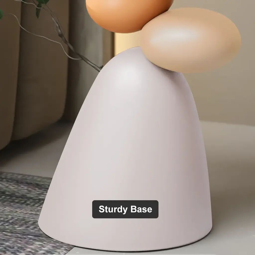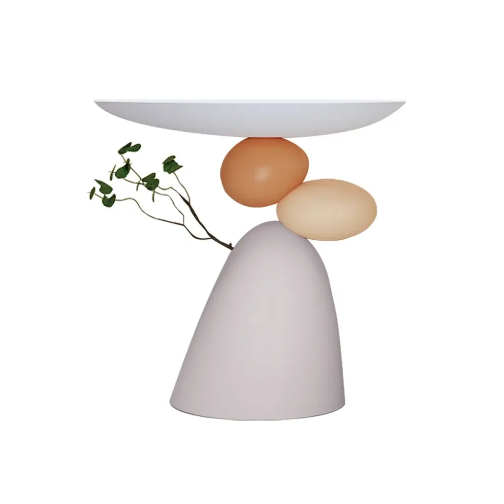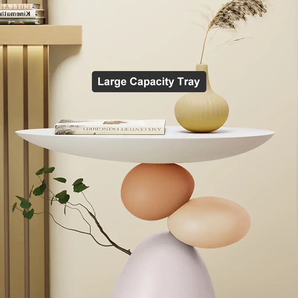 This artistic side table will add a playful yet modern touch to your space. Its unique design mimics a balancing act of soft, pebble-like shapes beneath a smooth tabletop, creating an eye-catching statement piece. Perfect for bedrooms or living spaces, it effortlessly blends art and function.