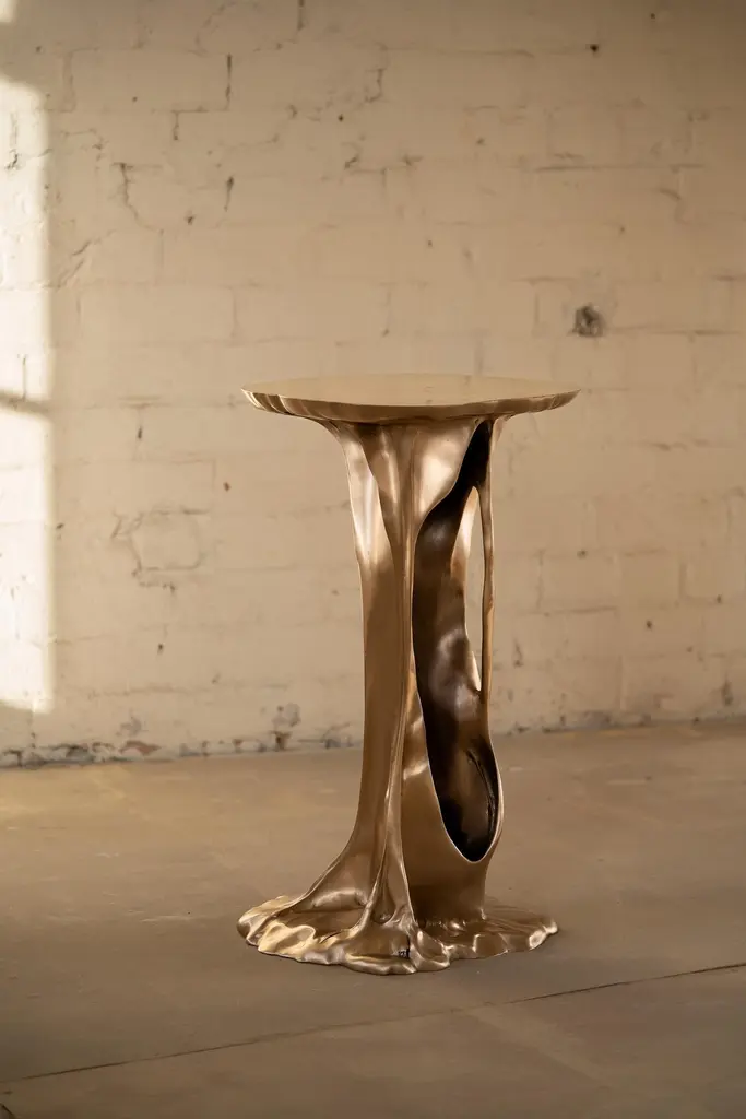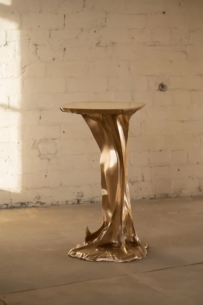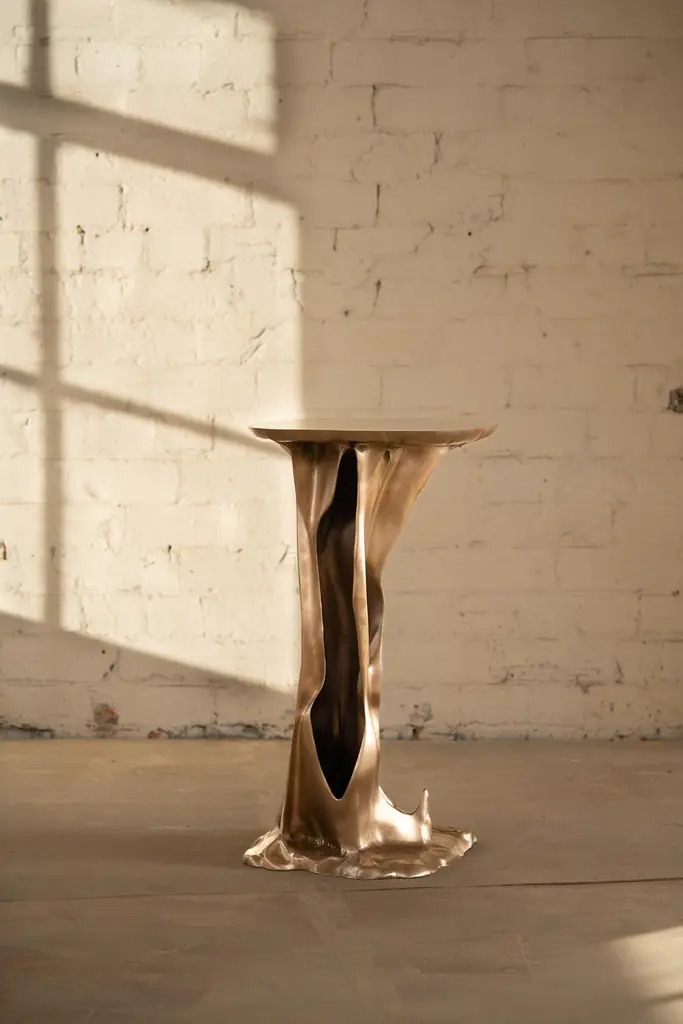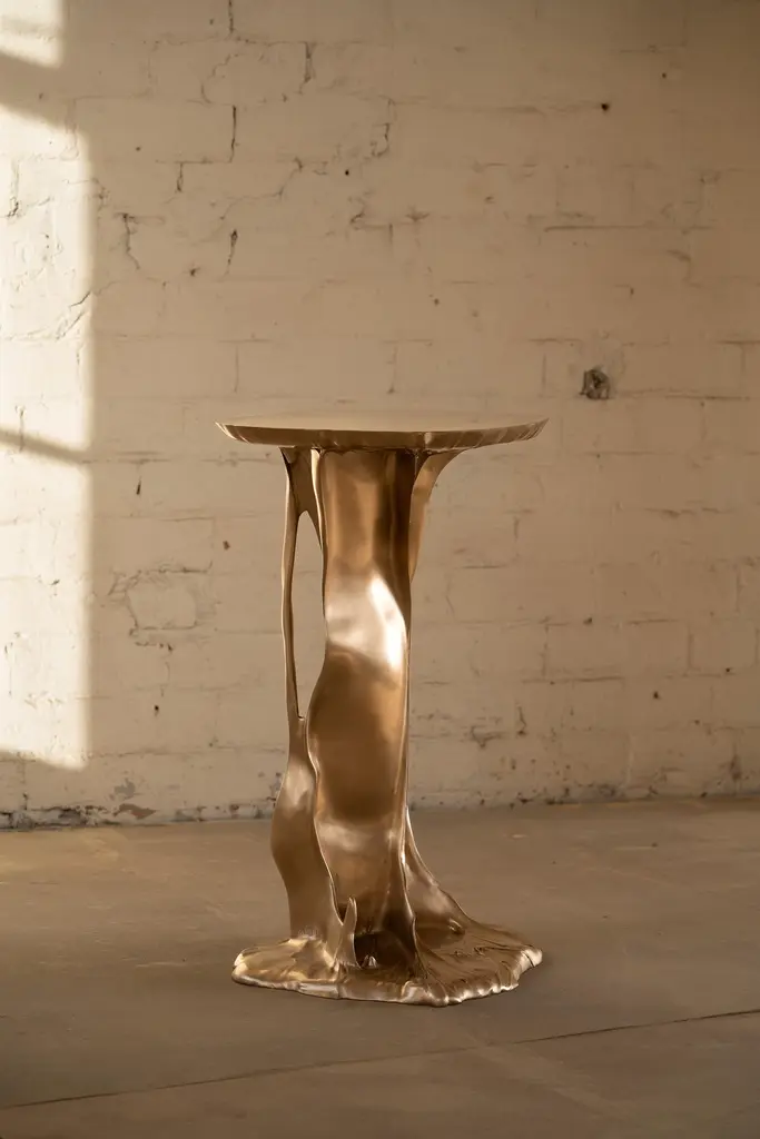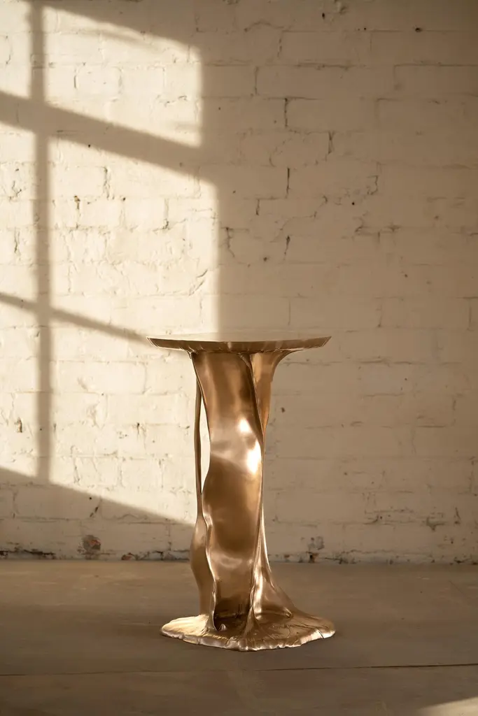 Abstraction II Side Table by Kris Lamba StudioEdition Number: 9 +2 APDimensions: W 33 x D 33 x H 70 cmMaterials: Hand burnished bronze.Weight: 60 Kg.Options: polished, patinated and burnished finishes availableIntroducing the fourth limited edition from the 'Abstraction' series—a bronze occasional table that marries contemporary innovation with refined artistry. Beginning as a molten bio-polymer, it is then stretched under precise pressure between two heated aluminum plates. Once the required height is reached the resulting form is rapidly cooled with a blend of liquid nitrogen and compressed air, capturing a unique silhouette in mid-motion. Meticulously hand-finished and subtly enhanced with an outer shell of resin-impregnated fabric, the piece is ultimately cast in bronze using the age-old lost-wax method. The piece stands as a thoughtful exploration of modern form and craft, quietly reflecting a careful dialogue between contemporary techniques and time-honored practices.Kris Lamba was born in London in 1984. He creates large and small-scale sculpture, paintings and edition based collectible design. Eschewing tradition media, he works with a variety of industrial biopolymers which Lamba manipulates whilst still molten, often at extreme temperatures. Using a combination of great force, gravity and a pioneering technique of polymer-stretching, he creates otherworldly forms; shapes that defy convention and echo the spontaneous and often violent moments of interstellar creation. Aiming to partly remove the element of ‘self’ Lamba adjusts only certain parameters: temperature, quantity, molecular weight and the applied force. Then, using custom designed machinery he pulls apart the molten material, selectively freezing and re-heating where necessary; the resulting shapes seemingly grown rather than made. After a period of consideration, the forms are refined and re-worked over a period of weeks and are either cast in bronze using the traditional ‘lost-wax’ method, or are finished in precious metals, pigment rich paints and composite resin fabrics.Creating work is an energetic process for Lamba, his pieces becoming expressions of a singularity; ideas forged though intense experimentation, later undergoing gradual stages of refinement and craftsmanship. Originally a trained classical percussionist Lamba then went on to study contemporary design. His stretched and manipulated sculptures can be seen as a rebellion against the confines of working within tradition; their spontaneous forms defying and reworking traditional artistic practice. His recent series of raw pigment sculptures go further to reinforce this point, warping the very space that they occupy. Lamba’s work has been published worldwide to widespread critical acclaim and is held in several prominent collections. He currently lives and works near Brighton, UK.