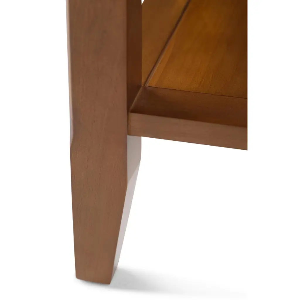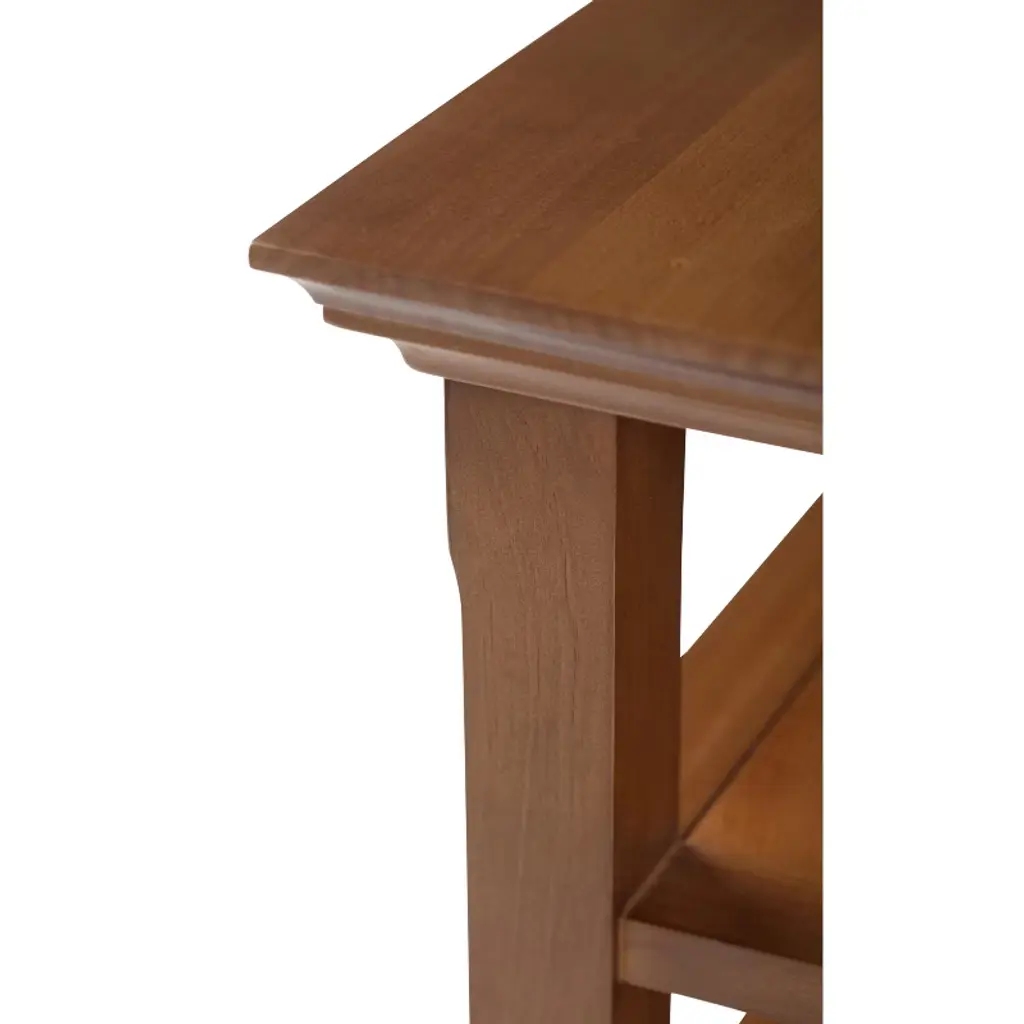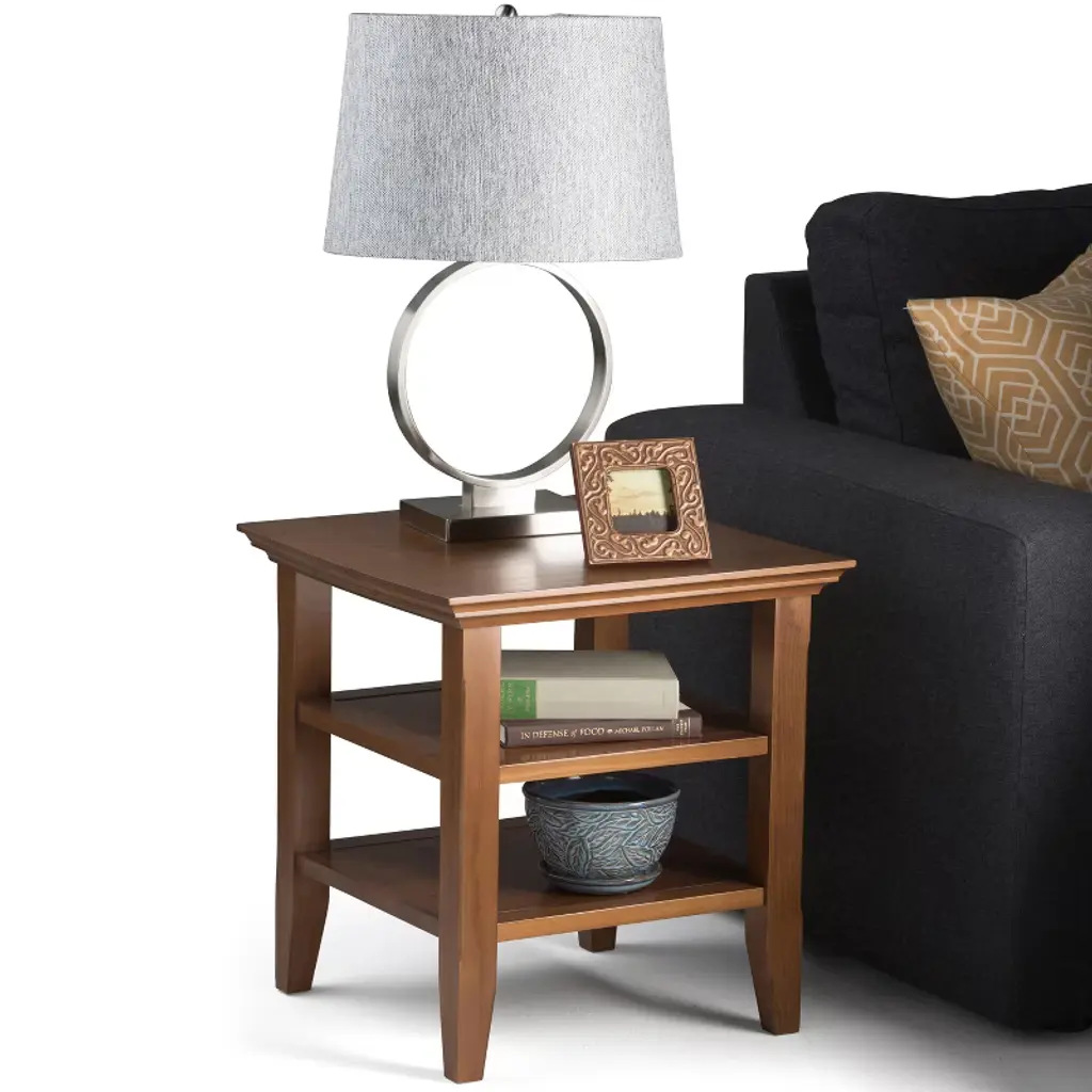 Handcrafted with care using the finest quality solid woodHand-finished with a Light Golden Brown stain and protective NC lacquer to accentuate and highlight the grain and the uniqueness of each piece of furnitureMultipurpose table can be used as an end table or side table. Looks great in your living room, great room, condo or bedroomFeatures 2 open storage shelves, designed to be simple and functionalTransitional, contemporary design includes tapered legs and molded crown edged table topAssembly Required