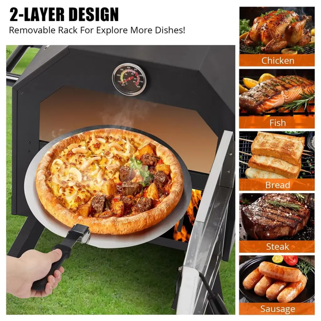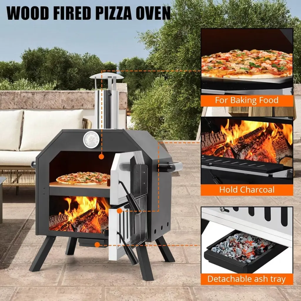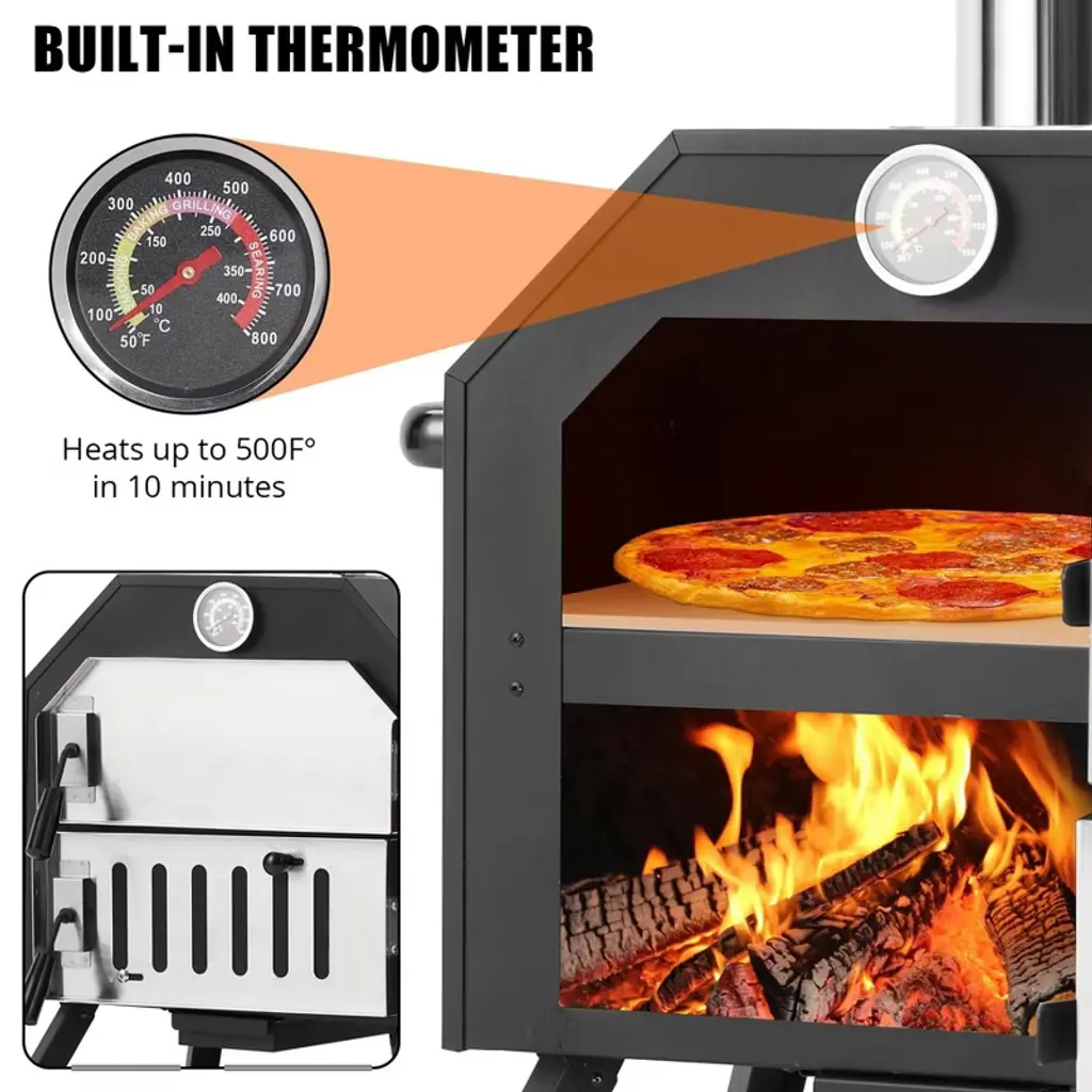Elevate your outdoor cooking experience with our Wood-Fired Pizza Oven, crafted from high-quality iron for enhanced stability and even heat distribution. Featuring a powder-coated carbon steel shell for optimal insulation, this oven offers the authentic taste of wood-fired cooking, making it perfect for pizza lovers and outdoor enthusiasts alike. High-Quality Construction: Made from durable iron, this outdoor pizza oven ensures stability and even heat distribution, featuring a powder-coated carbon steel shell for excellent insulation. Authentic Wood-Fired Flavor: Enjoy the delicious taste of wood-fired cooking, complete with a 12" pizza stone, a baking shovel, an ash collecting tray, and a waterproof cover for added convenience. Versatile Cooking Options: Perfect for patio barbecues, camping trips, and family gatherings, this oven is not just for pizzas—it can also be used to cook steaks, fish, baked corn, bread, and much more. Achieve a perfectly crispy crust with the 12-inch pizza stone. Efficient Temperature Control: Cook mouthwatering pizzas in just 6-7 minutes, reaching temperatures up to 550°F (287°C). The built-in thermometer allows for precise temperature monitoring, while the adjustable chimney and vent make it easy to manage heat and smoke. Convenient Design Features: The removable ash collector simplifies cleanup, and the four foldable legs allow for space-saving storage and easy transport. Ideal for outdoor patios, gardens, and backyards.