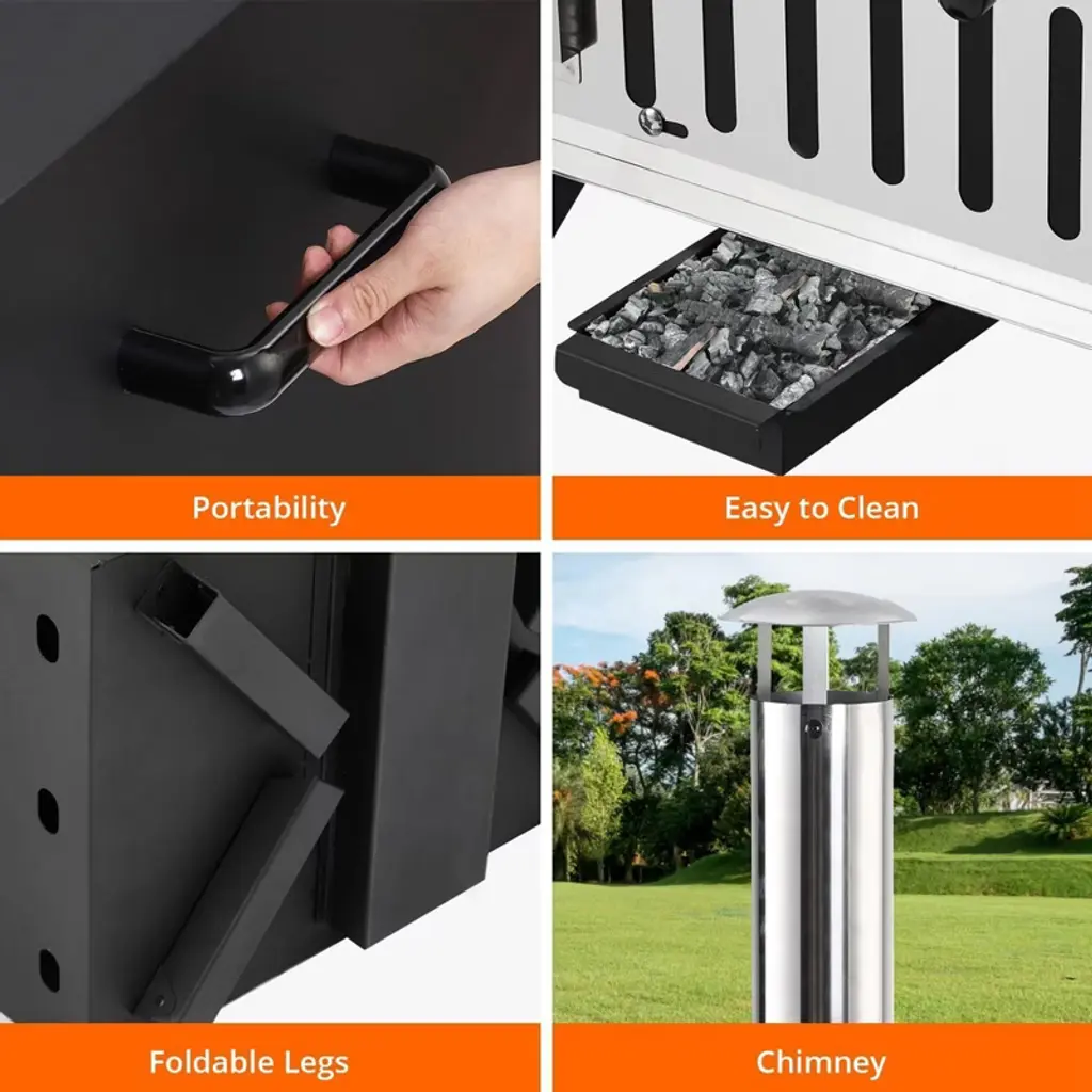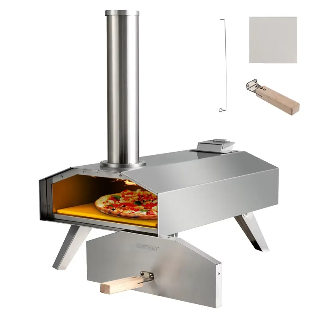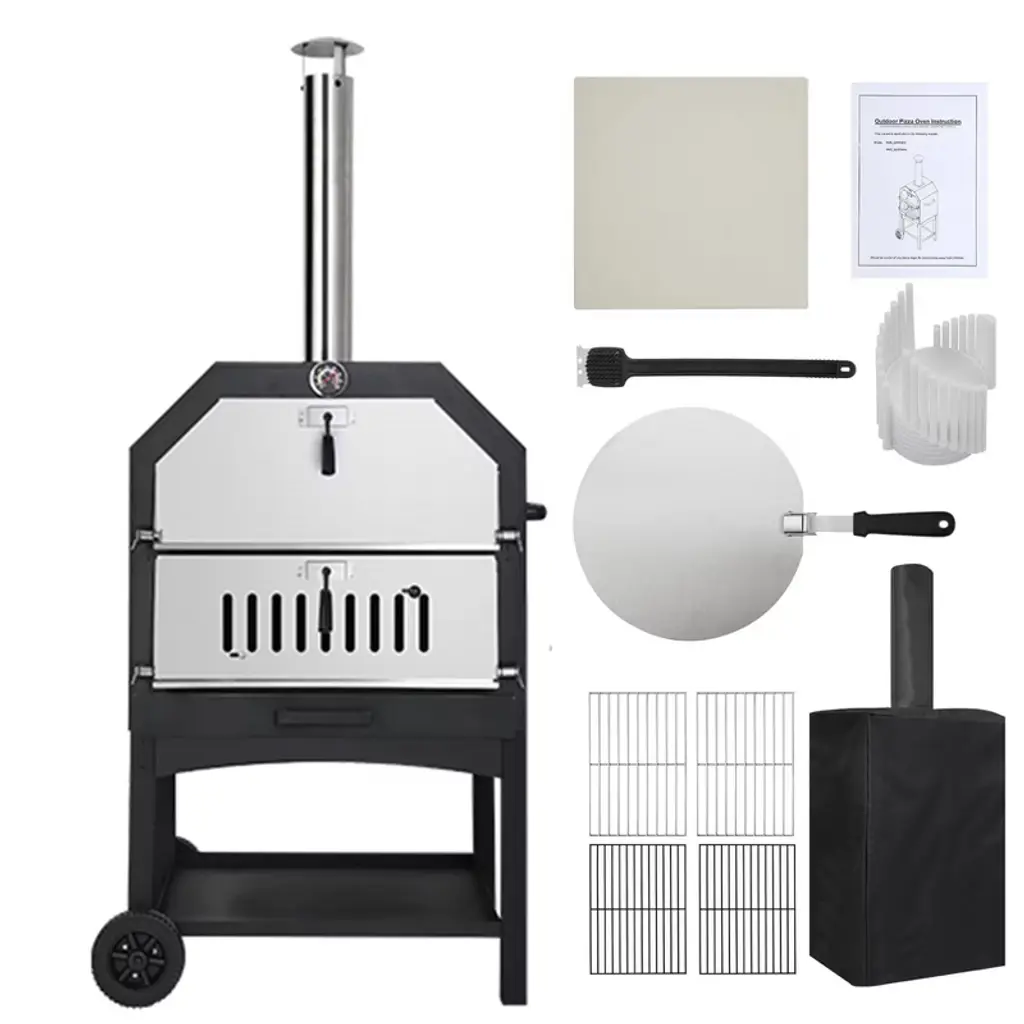 Elevate your outdoor cooking experience with our Wood-Fired Pizza Oven, crafted from high-quality iron for enhanced stability and even heat distribution. Featuring a powder-coated carbon steel shell for optimal insulation, this oven offers the authentic taste of wood-fired cooking, making it perfect for pizza lovers and outdoor enthusiasts alike. High-Quality Construction: Made from durable iron, this outdoor pizza oven ensures stability and even heat distribution, featuring a powder-coated carbon steel shell for excellent insulation. Authentic Wood-Fired Flavor: Enjoy the delicious taste of wood-fired cooking, complete with a 12" pizza stone, a baking shovel, an ash collecting tray, and a waterproof cover for added convenience. Versatile Cooking Options: Perfect for patio barbecues, camping trips, and family gatherings, this oven is not just for pizzas—it can also be used to cook steaks, fish, baked corn, bread, and much more. Achieve a perfectly crispy crust with the 12-inch pizza stone. Efficient Temperature Control: Cook mouthwatering pizzas in just 6-7 minutes, reaching temperatures up to 550°F (287°C). The built-in thermometer allows for precise temperature monitoring, while the adjustable chimney and vent make it easy to manage heat and smoke. Convenient Design Features: The removable ash collector simplifies cleanup, and the four foldable legs allow for space-saving storage and easy transport. Ideal for outdoor patios, gardens, and backyards.