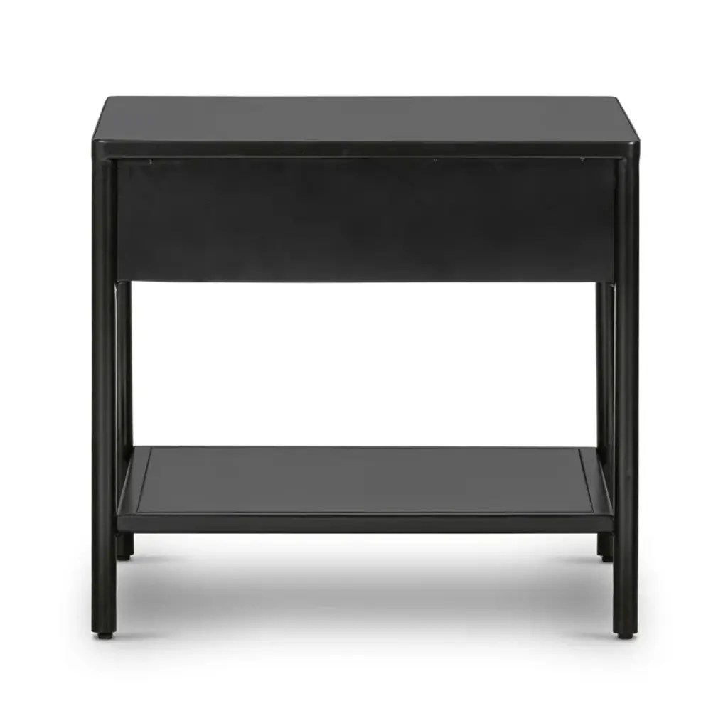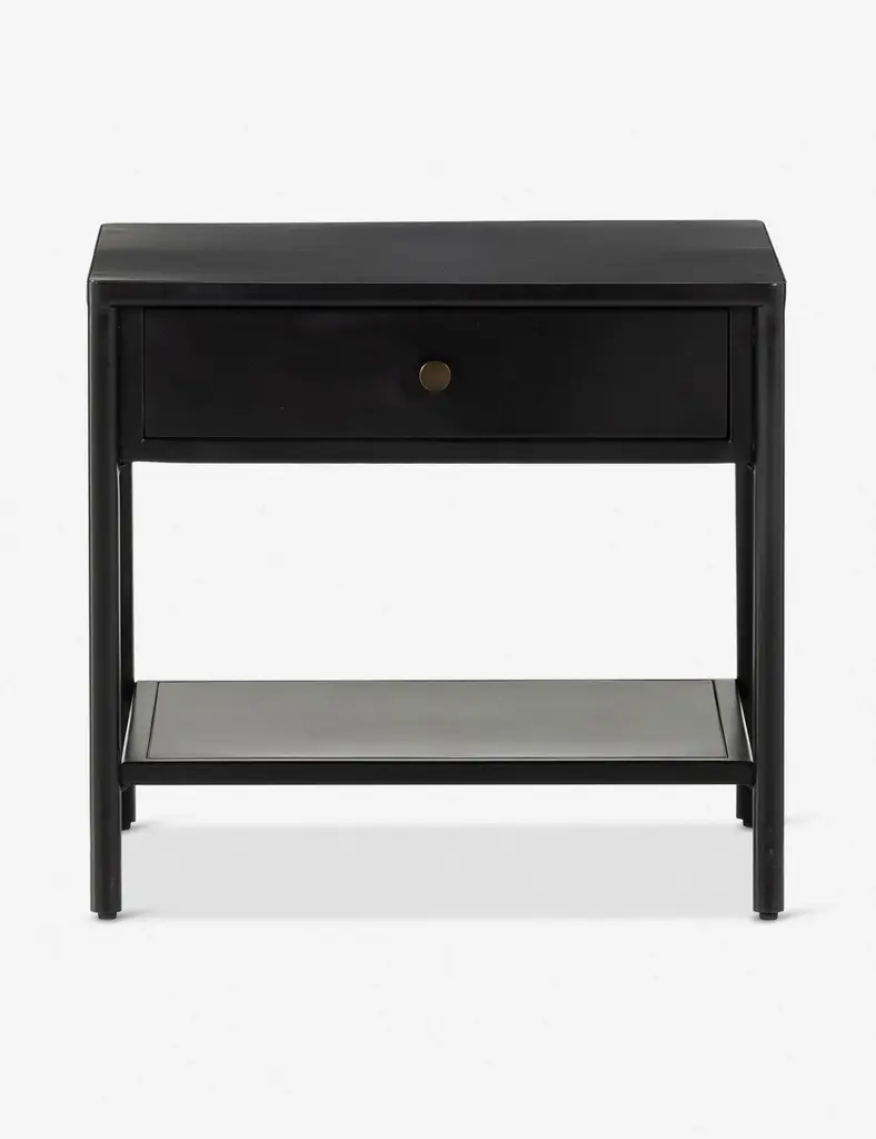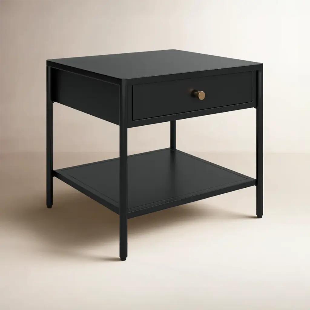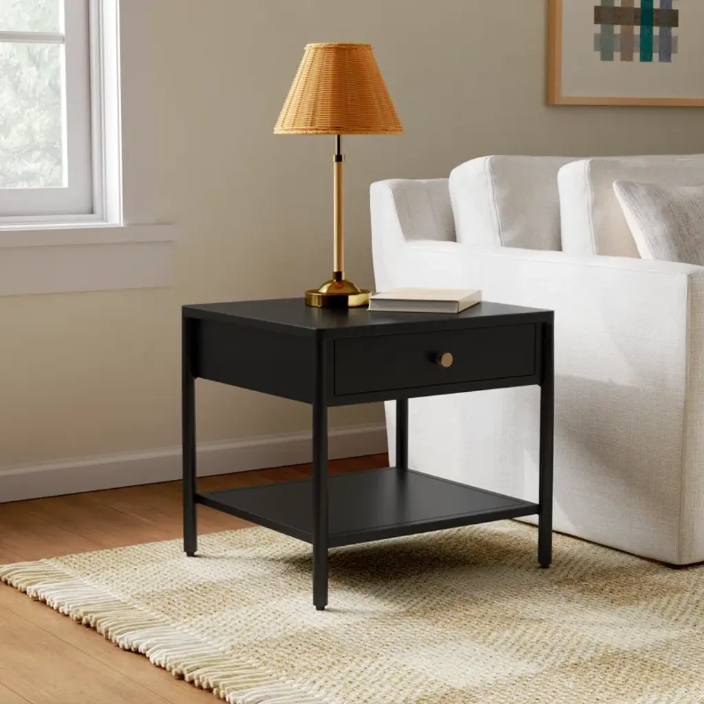 Work a softened industrial look with a simple black-finished iron end table featuring bronzed iron hardware for modernity. A single drawer and open lower shelving bring bonus storage to the living space.