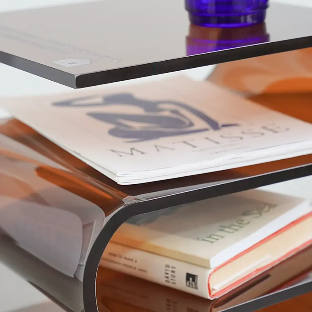 This end table made of brown acrylic has a curved shape. The compact desktop can hold coffee and snacks, This side table offers multiple storage locations for books and magazines. This side table can be used as a side table in the living room or as a nightstand in the bedroom. It can adapt to different scenes and saves space.