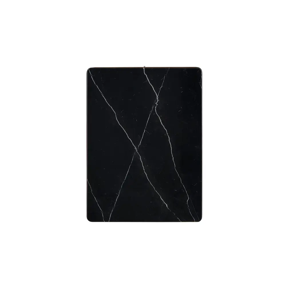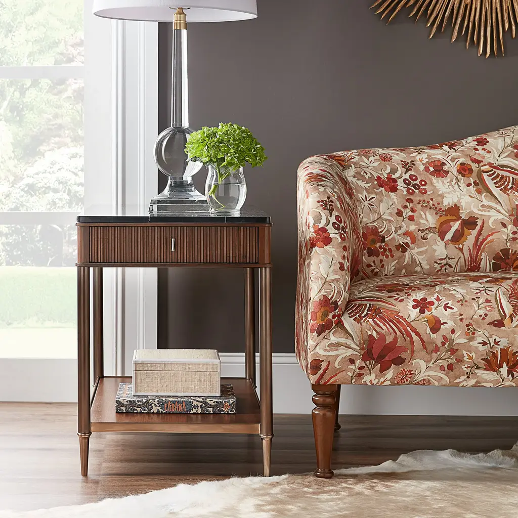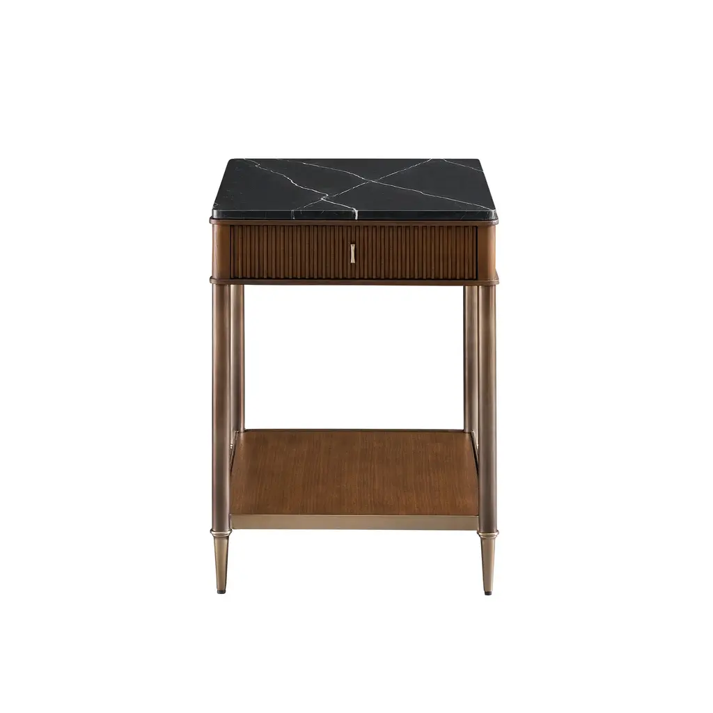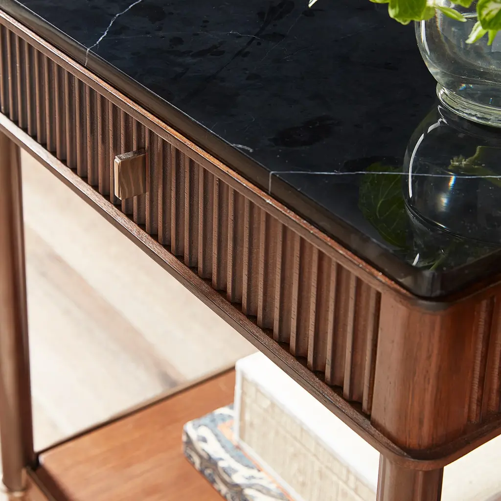 The Adam End Table is a traditionally styled piece that seamlessly blends mixed materials for a refined look. This versatile end table features reeded walnut door fronts adorned with satin brass accents, making it an elegant addition to any living room or bedroom. The walnut shelves and drawer provide ample storage space, while the Nero Marquina Marble top adds a touch of luxury. Perfect for placing next to a sofa or bed, the Adam End Table combines functionality and style, enhancing the elegance of your home decor. Ships In 4-5 Weeks One drawer, one shelf Satin Brass hardware Black Nero Marquina Marble top Beech wood and Walnut veneer Matte Black metal base with Satin Brass accents This image is for illustrative purposes only. The colors shown are accurate within the constraints of lighting, photography, and the color accuracy of your screen.