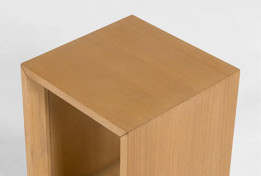 Designed and developed by Living Spaces, our Adamas end table combines innovation with traditional craftsmanship through its unique faceted construction. Like a diamond, the facets catch light and shadow in ways that add a sculptural quality to this piece. Selected for its simplicity and stability, quarter sawn oak veneer keeps the attention on the fascinating angular elements that create a cohesive sense of geometry. The dry, natural finish lends contemporary coastal character.