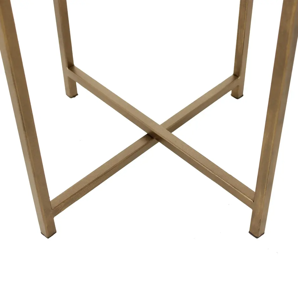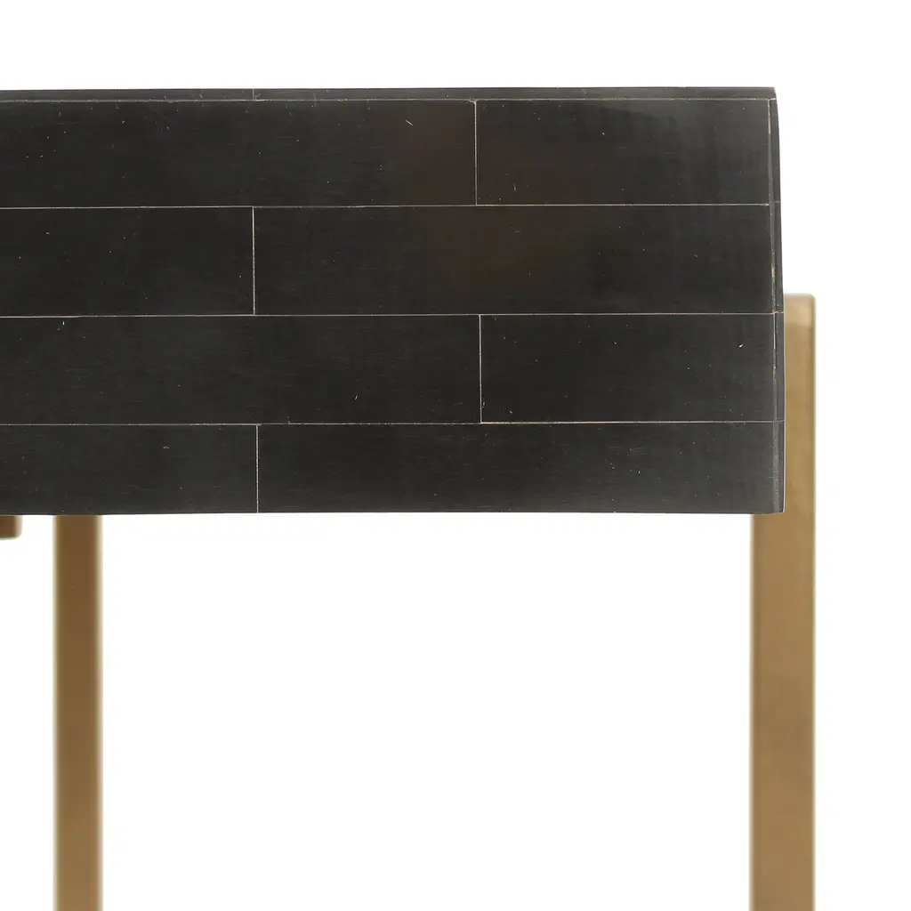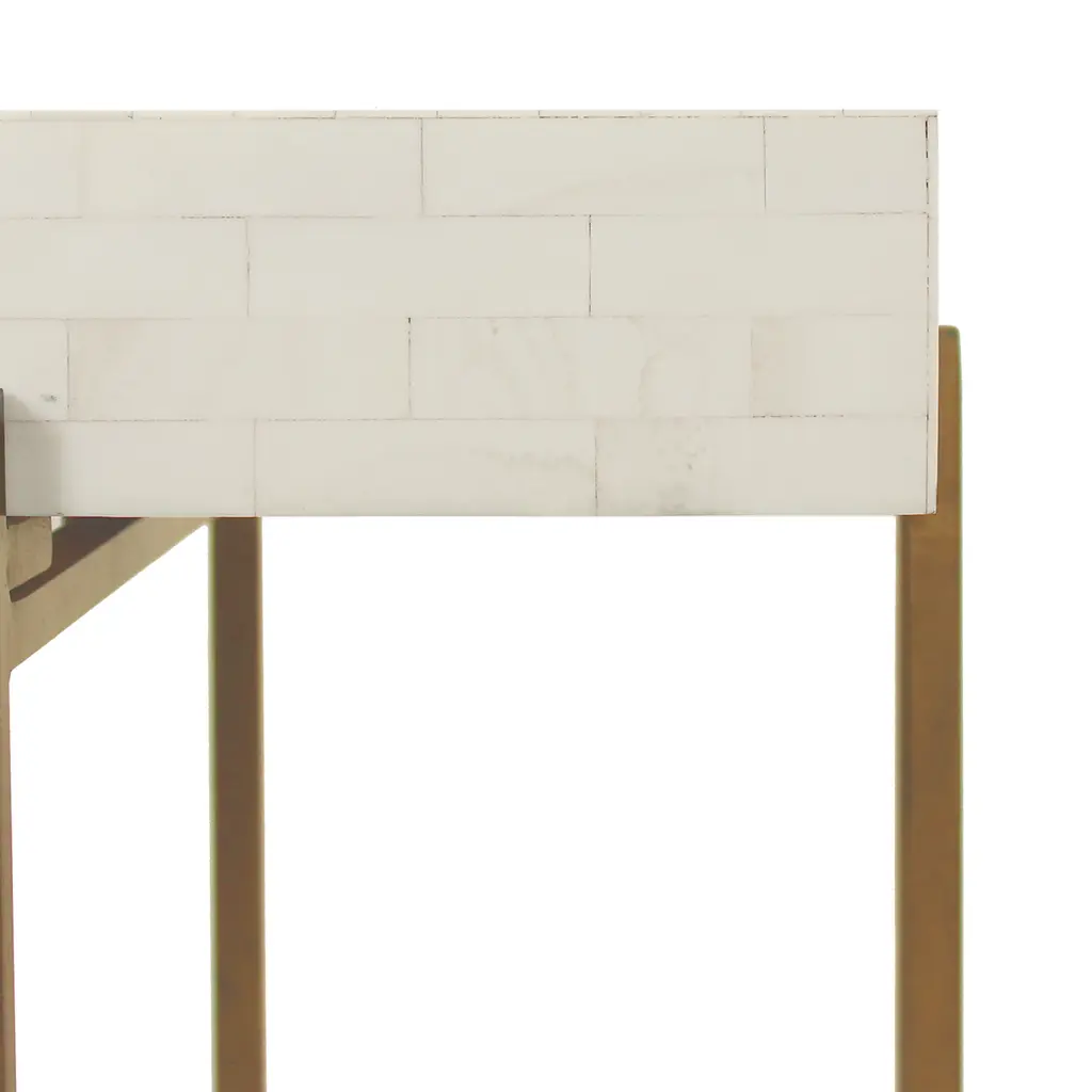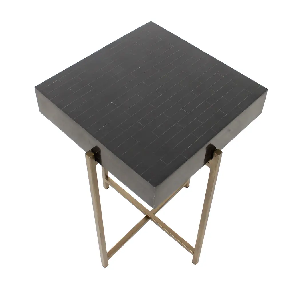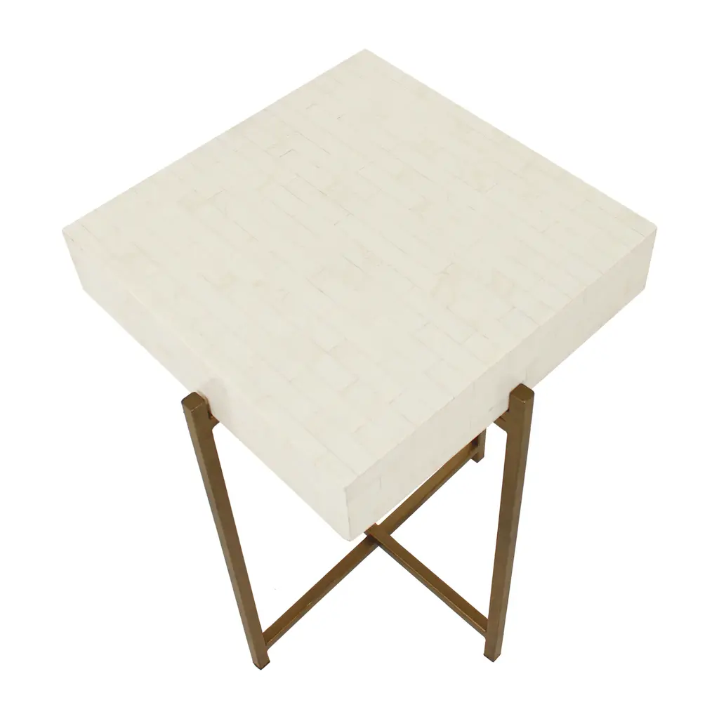 This sleek and modern accent table boasts a crossed gold metal base supporting a modern box tabletop available in either luxe white or black resin. The hand-inlaid polished resin tiles that create the tabletop surface add an artisan crafted detail to your living space. The contemporary look of this end table has a hint of 40s Art Deco style to elevate your home with a blend of simplicity, affordability and everyday luxury.