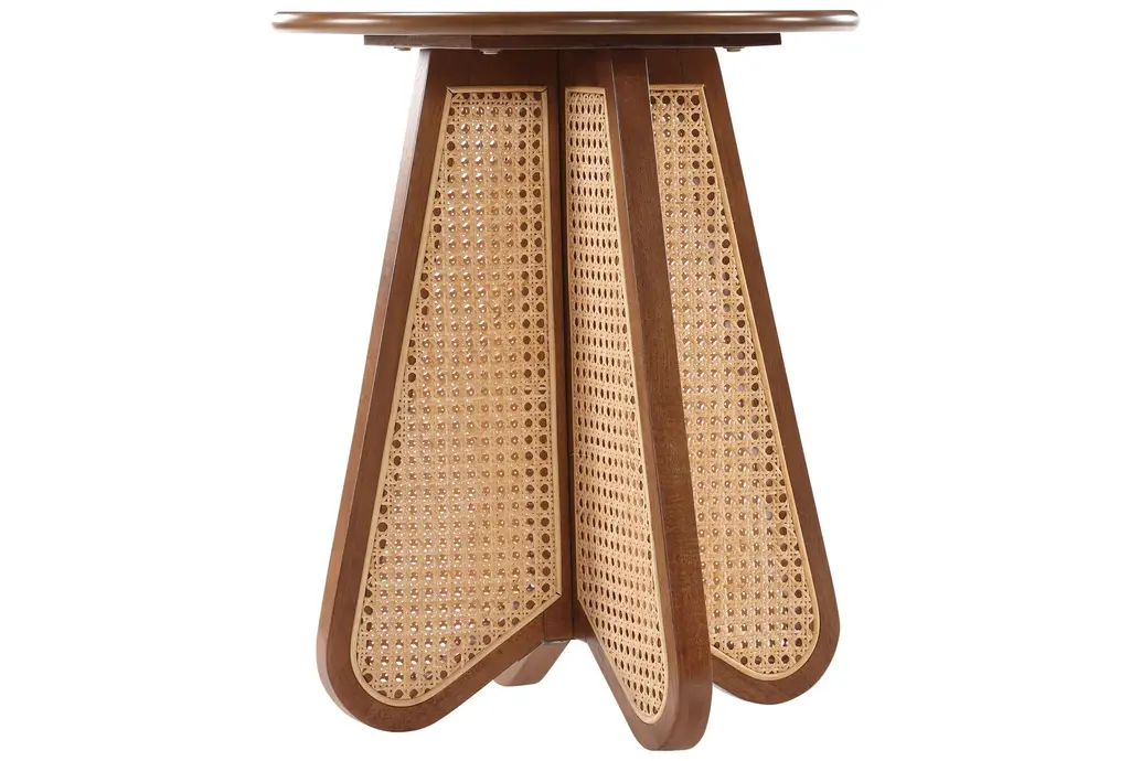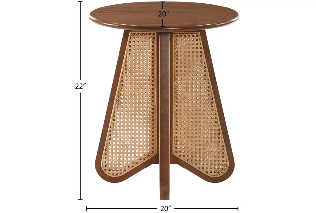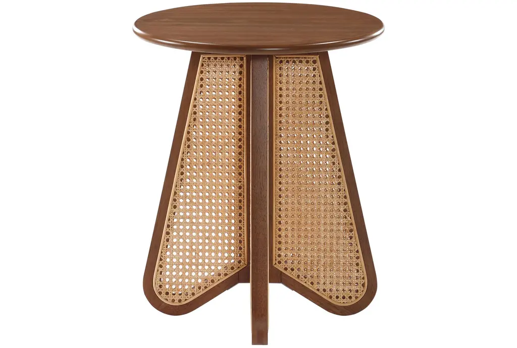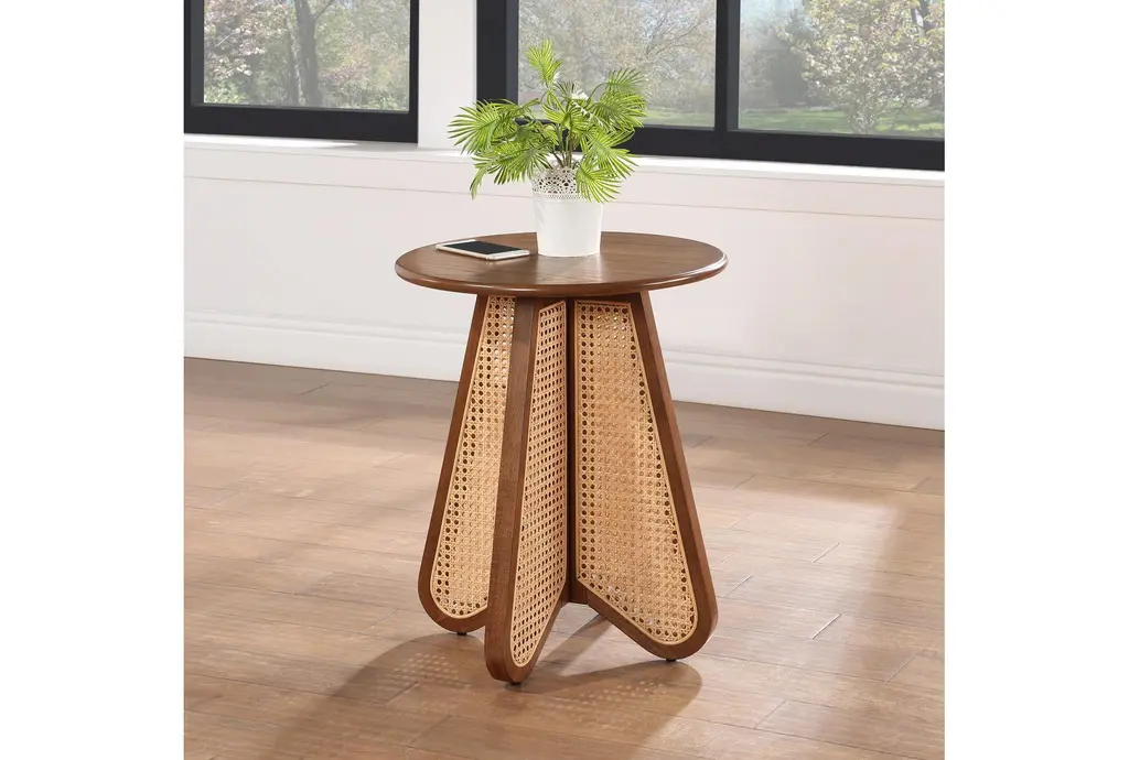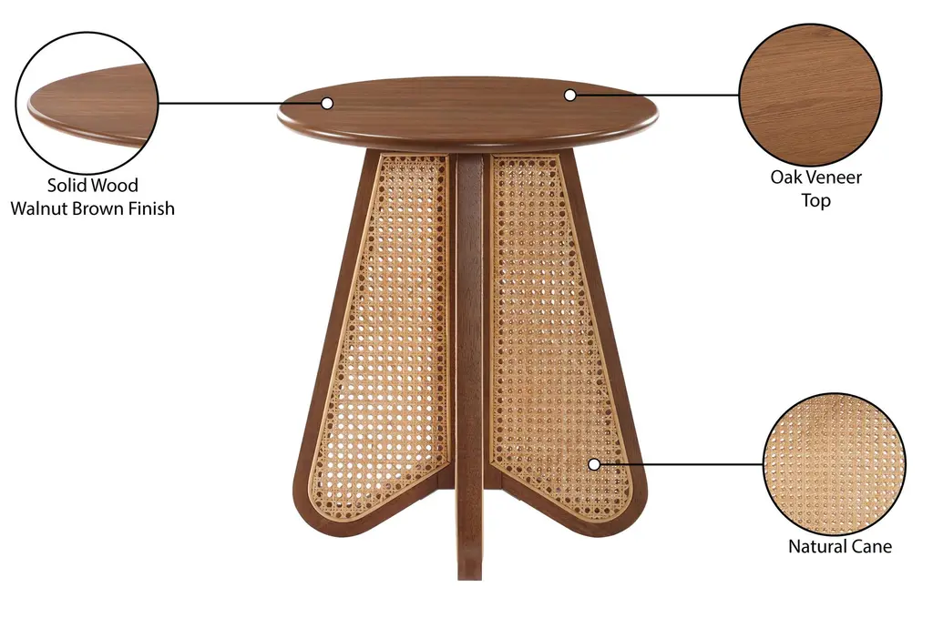 The Adeline Modern Walnut + Cane 20" Round End Table is a stylish addition to any living room. Its modern design is complemented by the rich walnut color and the combination of rubberwood, oak veneer, and cane materials. Perfect for small spaces, this round end table brings both functionality and aesthetic appeal to your home.