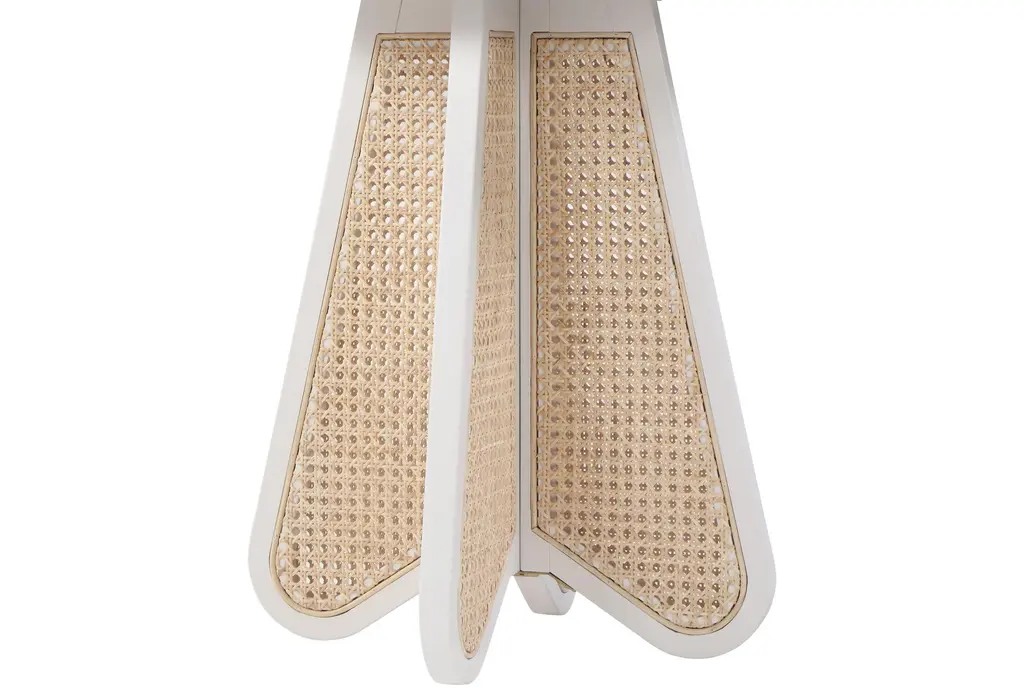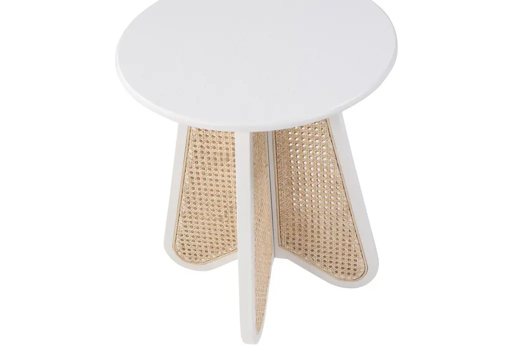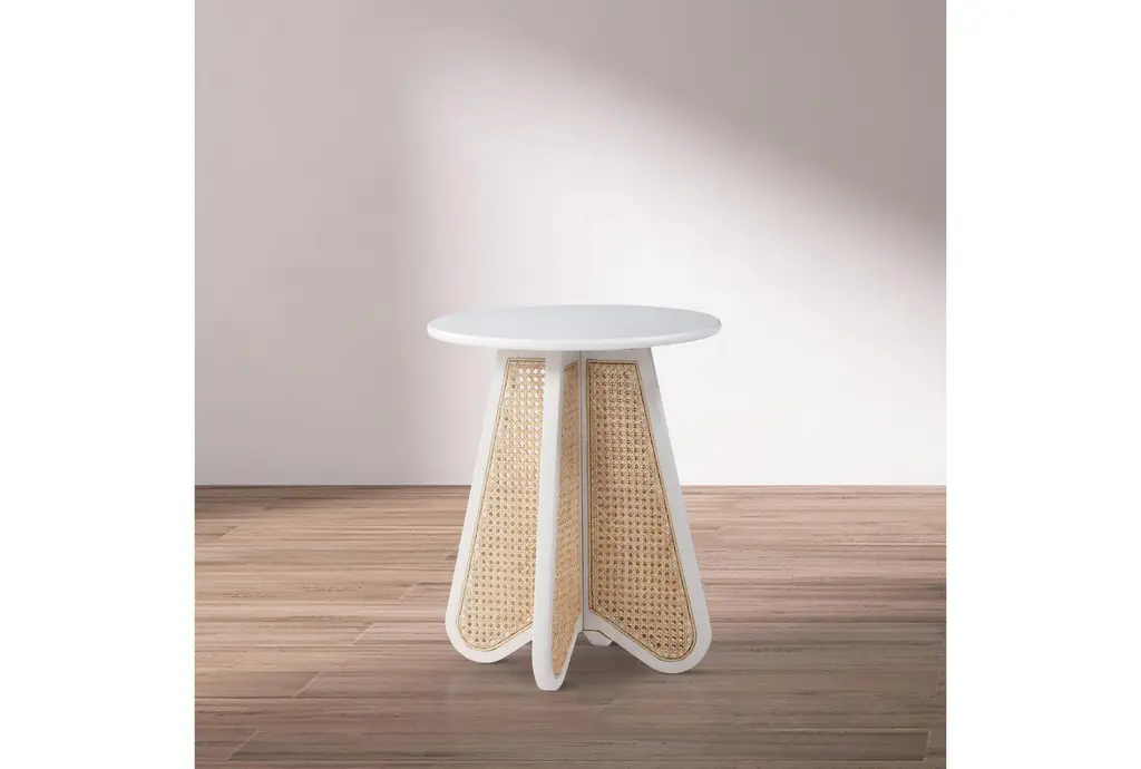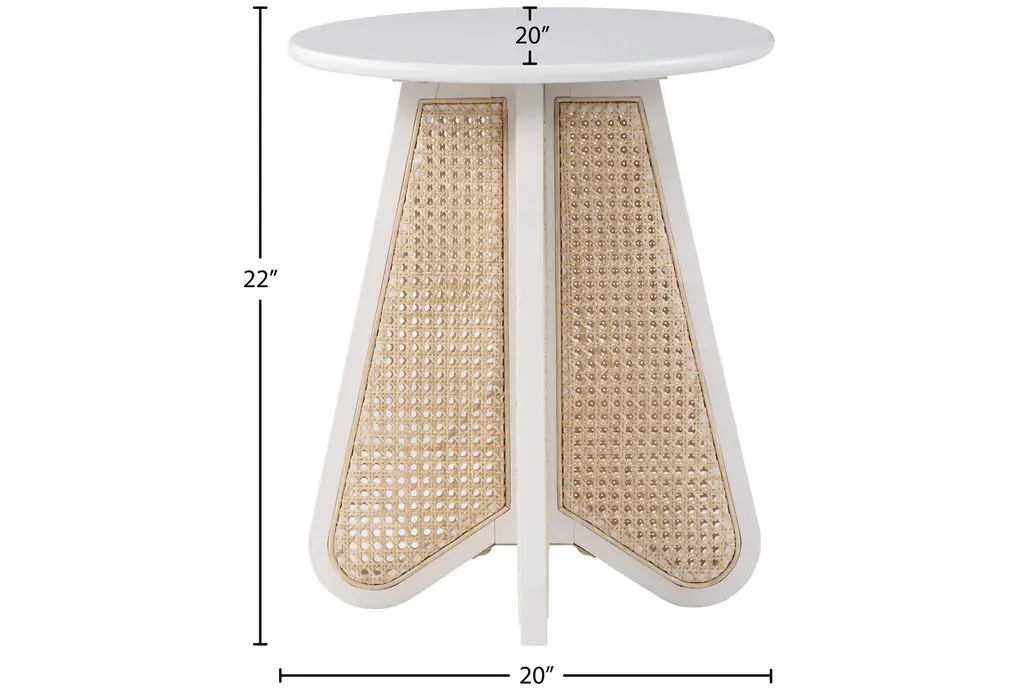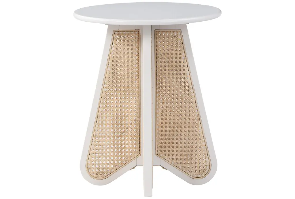 Enhance your living room with the Adeline Modern White Wood + Cane 20" Round End Table. This stylish piece combines a sleek modern design with the natural charm of wood and cane, creating a versatile addition to your home decor.