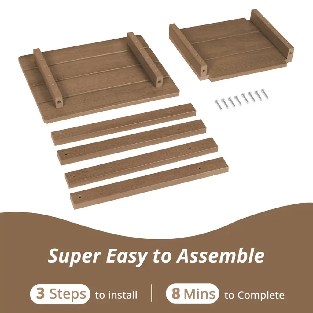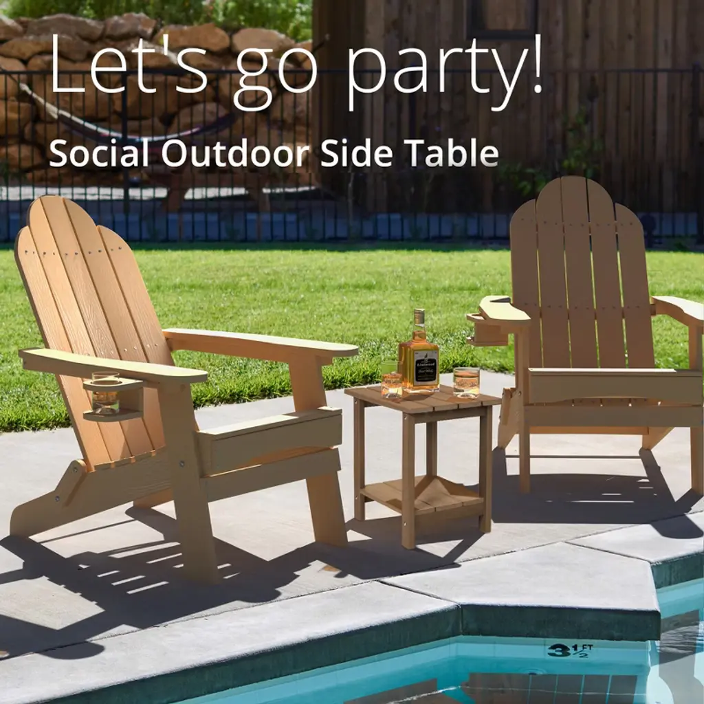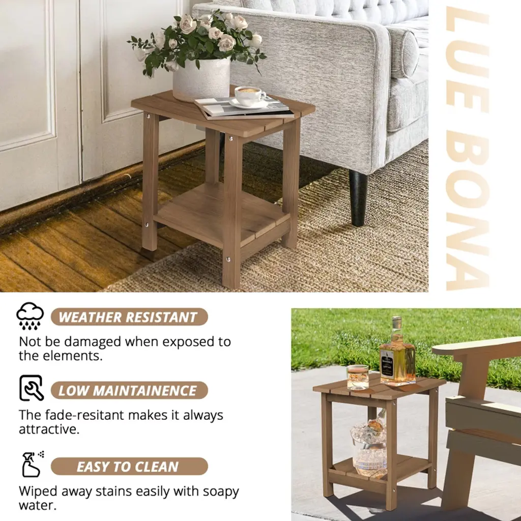 This outdoor side table is designed without any sharp edges to prevent skin injuries, making it the perfect complement to our Adirondack chair. Two-Tier Design - With its two-tier design, this table offers more storage space than standard side tables, allowing you to place items like a lamp, books, or drink coasters. The tabletop is sturdy and can support a maximum weight capacity of up to 160 lbs. Weather Resistant - Unlike HDPS lumber tables, this outdoor side table is highly weather-resistant. It remains cool under the sun, never fades, rusts, peels, or rots. The clapboard-style design ensures the table stays dry even when it rains. Its heavy weight prevents it from being blown away, even in strong winds. Indoor & Outdoor Use - Versatile in use, this table is perfect for patios, gardens, lawns, terraces, and pool areas, pairing perfectly with Adirondack chairs for parties or picnics. It¡¯s also great for indoor use in living rooms, bedrooms, kitchens, or as an office end table or plant stand. It¡¯s suitable for almost any setting. Easy Assembly - The tabletop comes fully assembled. Simply screw in 8 screws to set up the table. The installation process is quick, secure, stable, and ensures the table won¡¯t wobble or fall apart.