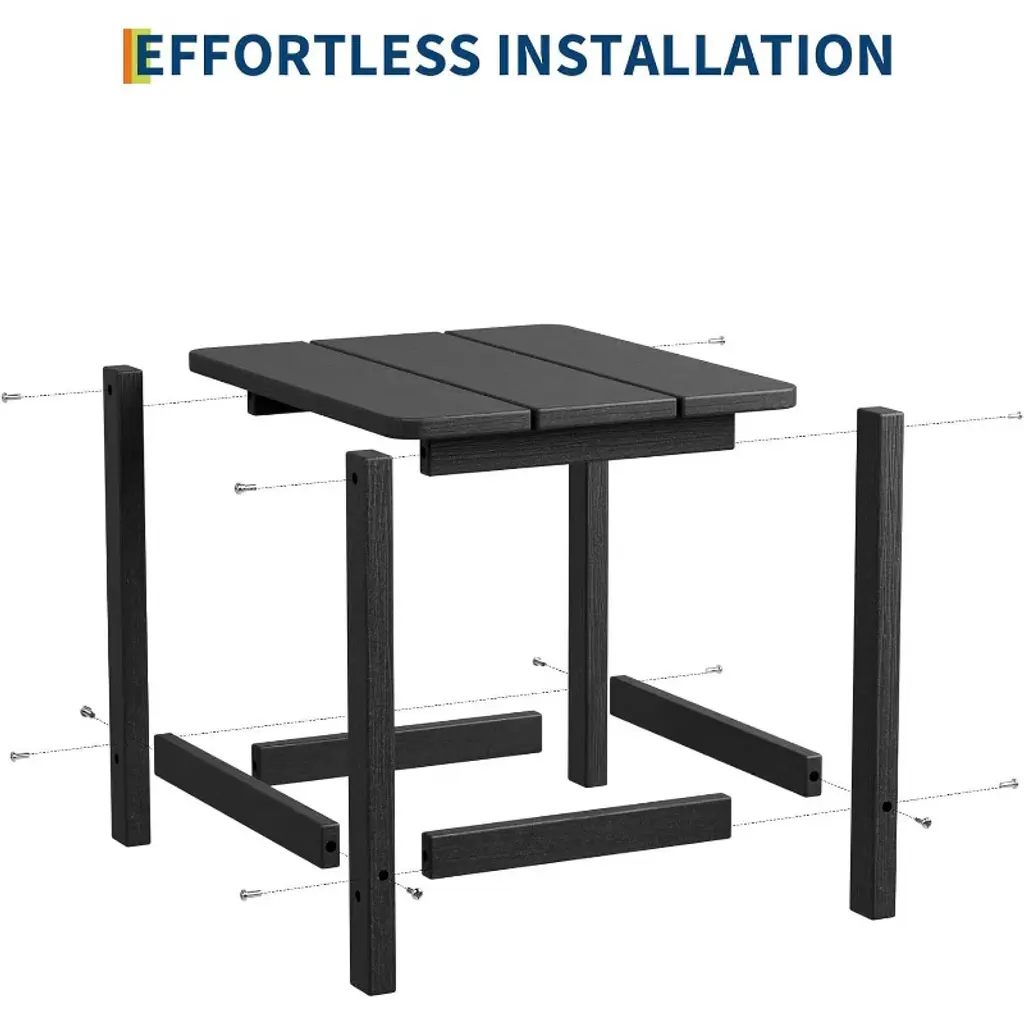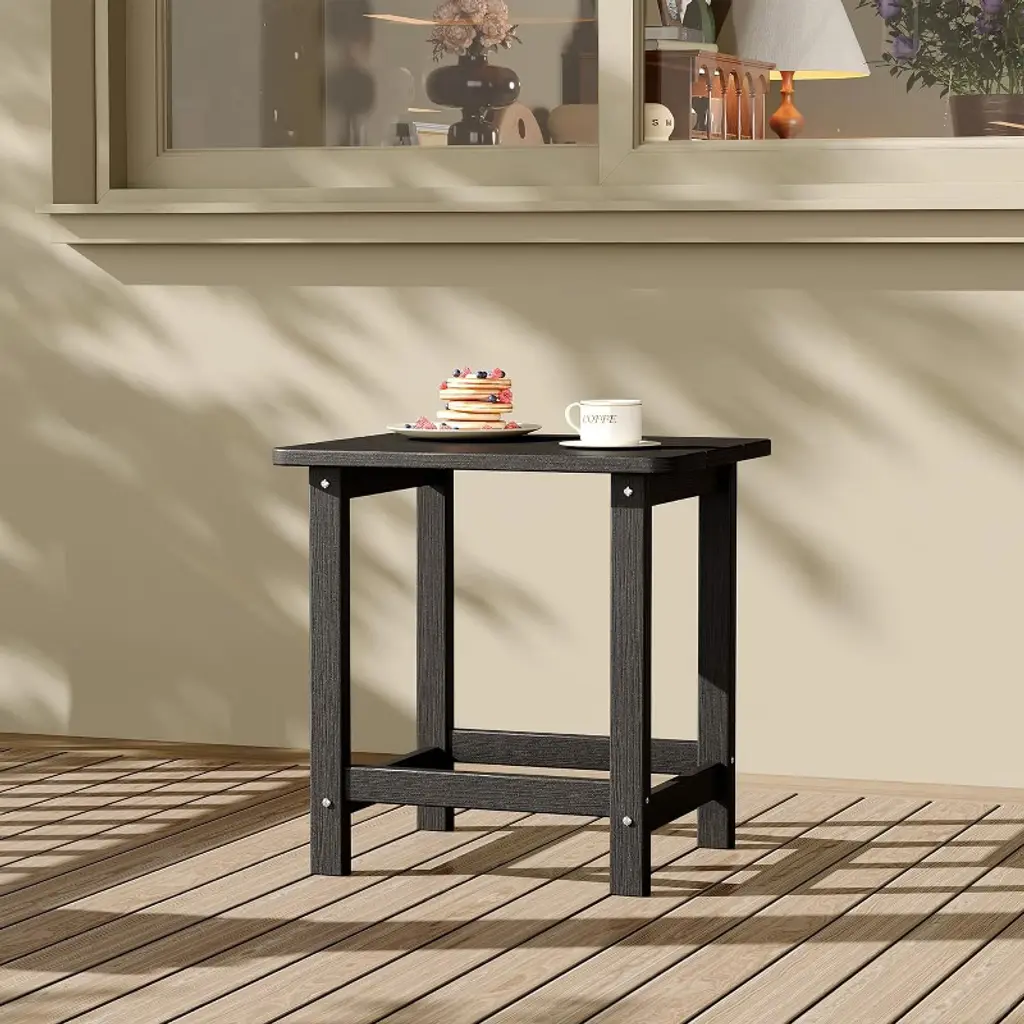 Our outdoor side tables are made of recycled plastic HDPE material with a textured grain finish and the realistic wood-like look.This material prevents warping,dents,rot,and fading,it perfectly improves the shortcomings of natural timber,which is susceptible to decay,fungus,chip,peel and crack.Designed for strength and durability,this outdoor side table supports up to 380 lbs,making it ideal for holding heavy items like drinks,books,or decor without wobbling.Its reinforced structure ensures stability in any outdoor setting—perfect for patios,gardens,or poolside use. Enjoy effortless setup with this no-tools-required side table.The intuitive design allows for fast assembly in minutes,so you can spend more time relaxing outdoors.Ideal for those who want a hassle-free,ready-to-use small patio table.