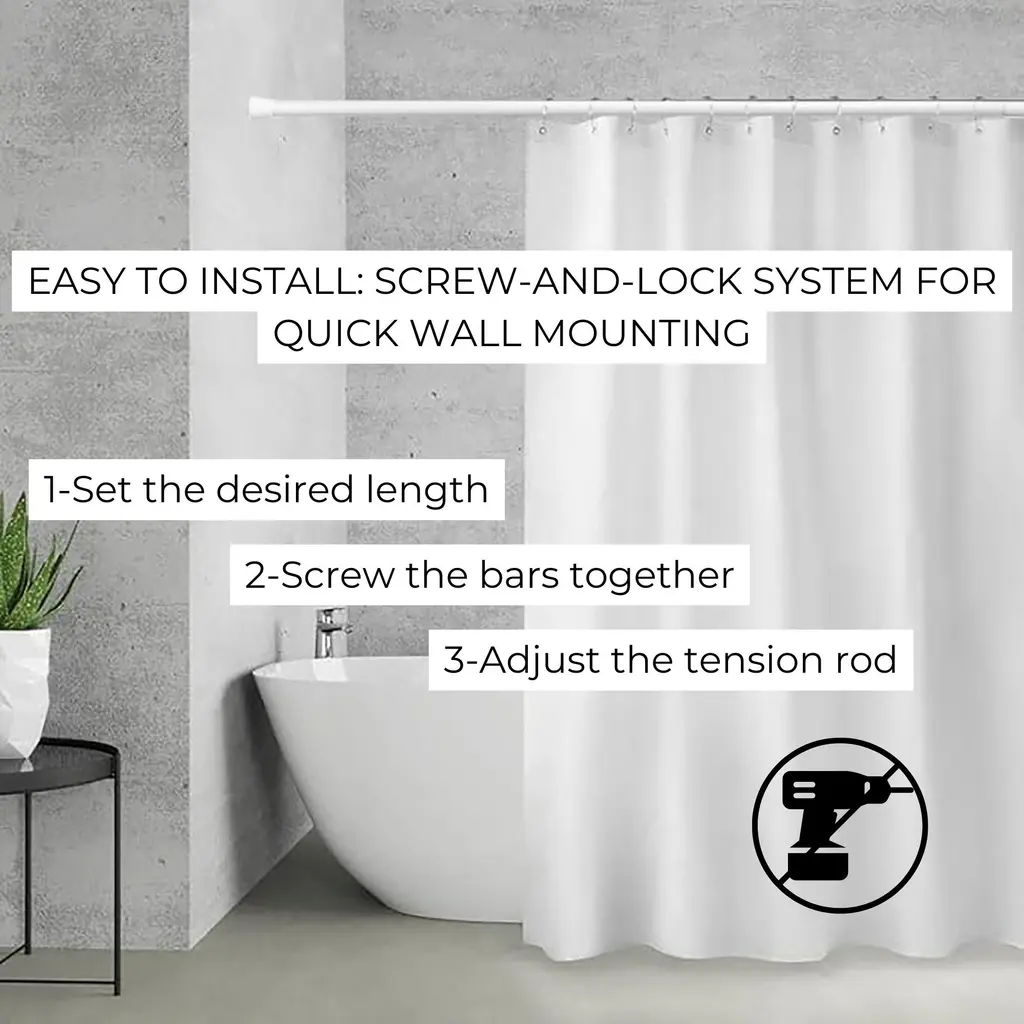 NO DRILLING REQUIRED: Easily install this tension curtain rod without tools or drilling. The spring system protects your walls from damage while ensuring a secure holdRUST-RESISTANT: Crafted from durable stainless steel, this curtain rod resists rust and corrosion, making it excellent for use in wet bathroomsEXTENSIBLE LENGTH: This adjustable tension rod extends from 41.3 to 98.4 inches with its screw-in bar design, perfect for a variety of shower or bath spaces, from standard to oversizedEASY ASSEMBLY: Features five screw-on bars and two screw-on tips, allowing you to adjust and secure the shower rod easily. Simply set the desired length and screw the bars togetherANTI-SLIP RUBBER TIPS: Equipped with rubber endings to provide a stable grip and prevent sliding, ensuring the adjustable curtain rod stays in place on smooth or textured surfacesUpgrade your bathroom with our Adjustable Shower Curtain Rod, a perfect blend of functionality and style. Designed with convenience in mind, this shower tension rod requires no drilling or tools during installation. Moreover, its rust-resistant stainless steel construction ensures long-lasting durability, even in wet conditions. Crafted for versatility, the tension shower curtain rod extends effortlessly from 41.3 to 98.4 inches. It adapts to most standard shower spaces and to oversized or custom shower spaces, such as those in larger bathrooms or walk-in showers. Additionally, the innovative spring tension mechanism keeps the rod firmly in place without slipping. For extra stability, the non-slip rubber tips on both ends provide a secure grip on any surface. For even greater ease of use, the screw-on bars allow quick, trouble-free assembly. Simply twist the bars together and adjust the length to your desired size. Furthermore, in white or black, it complements various bathroom decor styles, from modern to traditional. Not only functional, this tension shower rod is also multipurpose, perfect for hanging shower curtains, liners or light drapes. With its sturdy design and easy installation, this curtain tension rod makes redecorating simple and stress-free. Choose our extra long tension rod to enjoy a hassle-free and stylish solution for your bathroom needs.