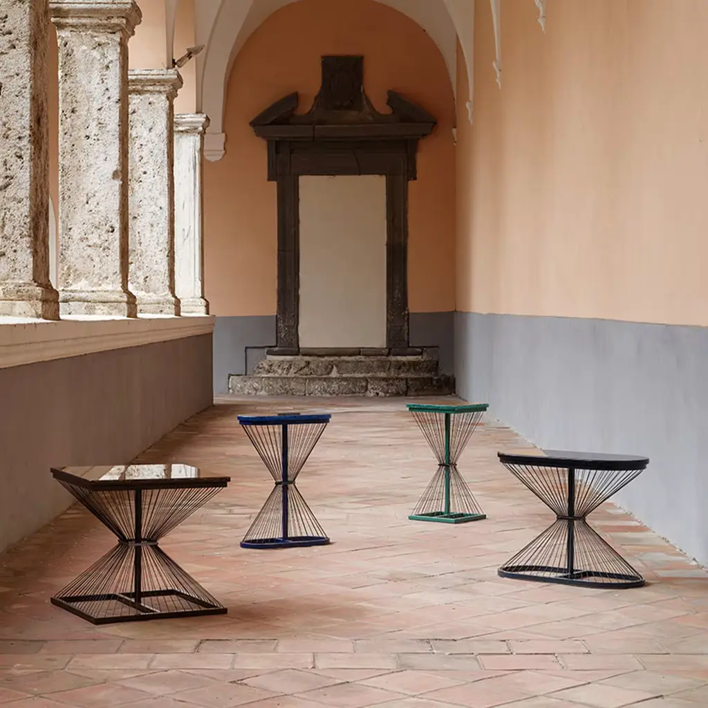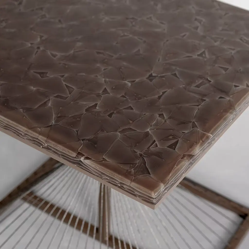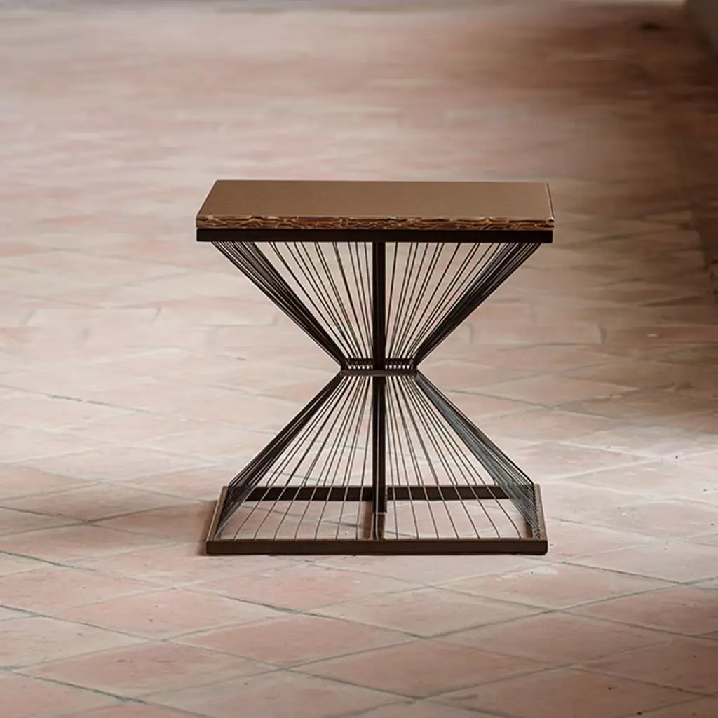 Handcrafted using environmentally friendly processes, this Art Deco-inspired design from the Aegis Collection by British designer Ziad Alonaizy is characterized by a cage-like, architectural base that can be appreciated from all sides. The brown top in 100% recycled glass rests on a metal structure in matching finish, with a black nickel-plated stainless steel base composed of thin wires hand-sewn around the perimeter and cinched at the center by a plate in an hourglass shape.