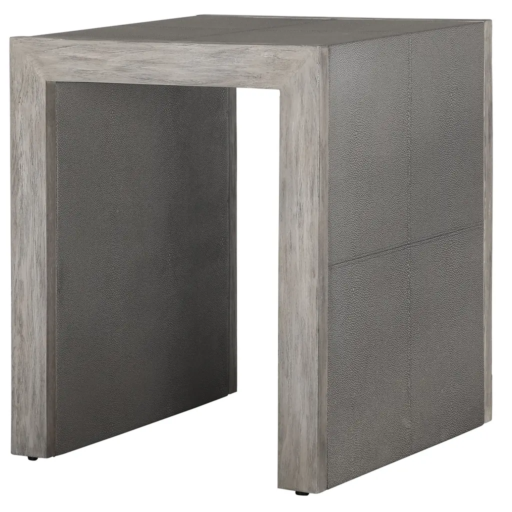 With modern elements, this transitional side table features stitched panels of light gray faux shagreen, paired with a contrasting wood finish in a aged white with gray distressed details.