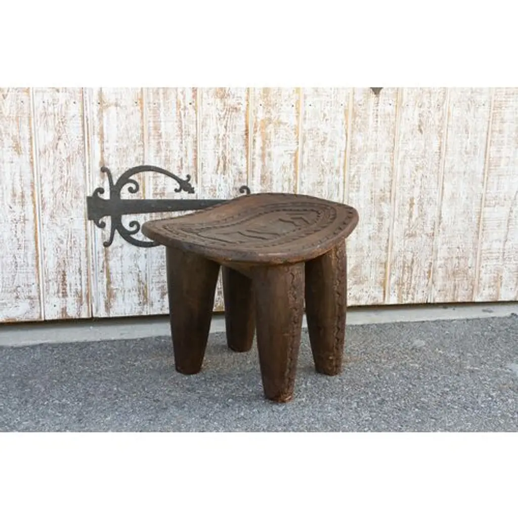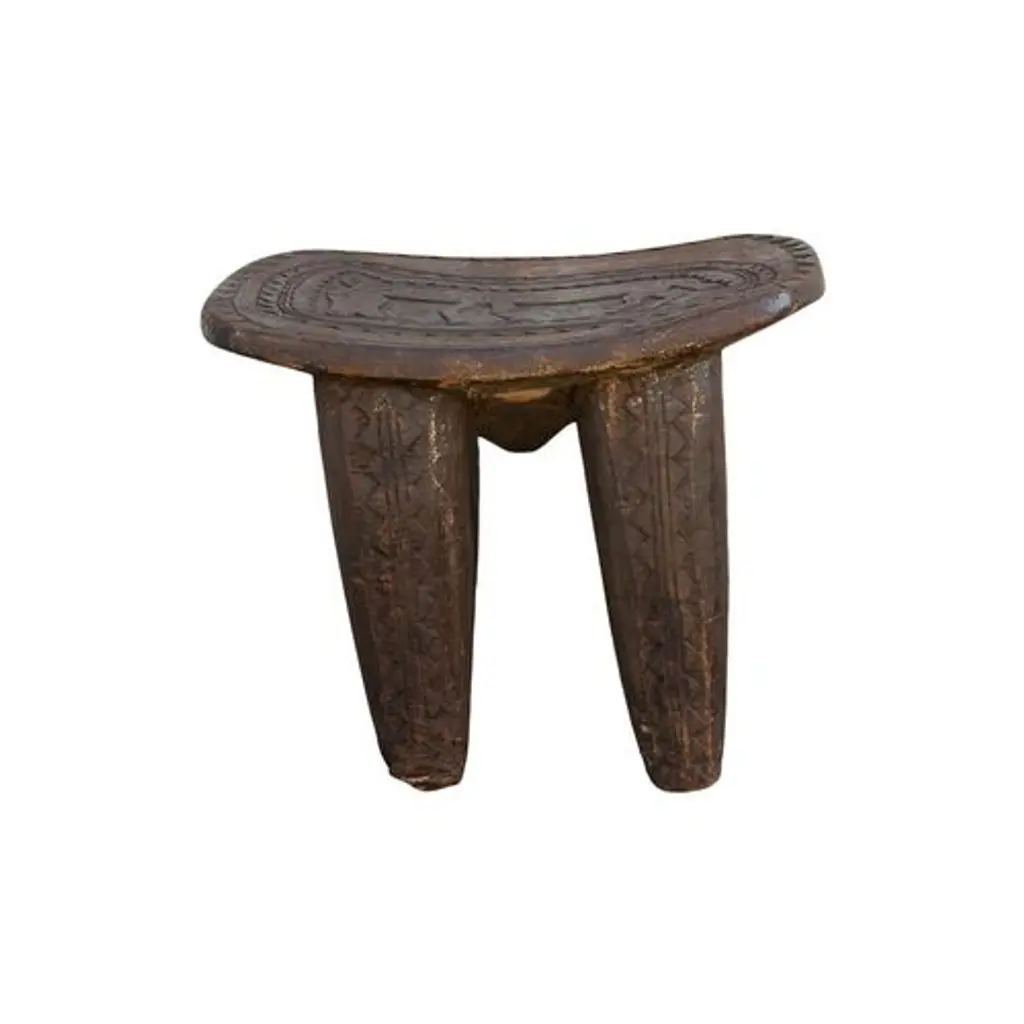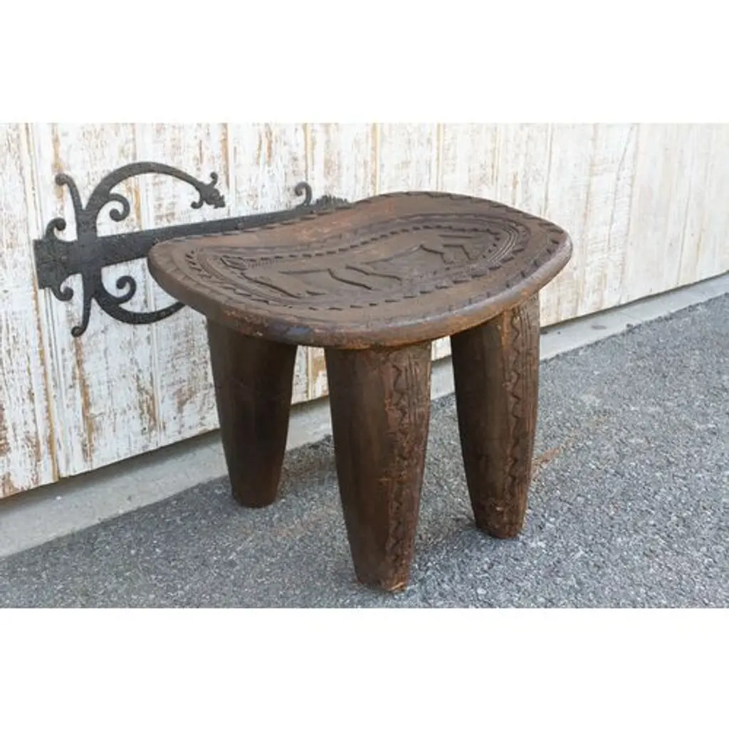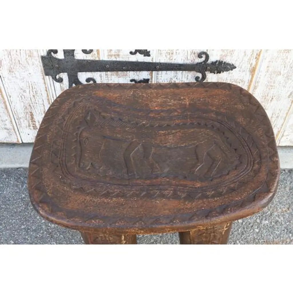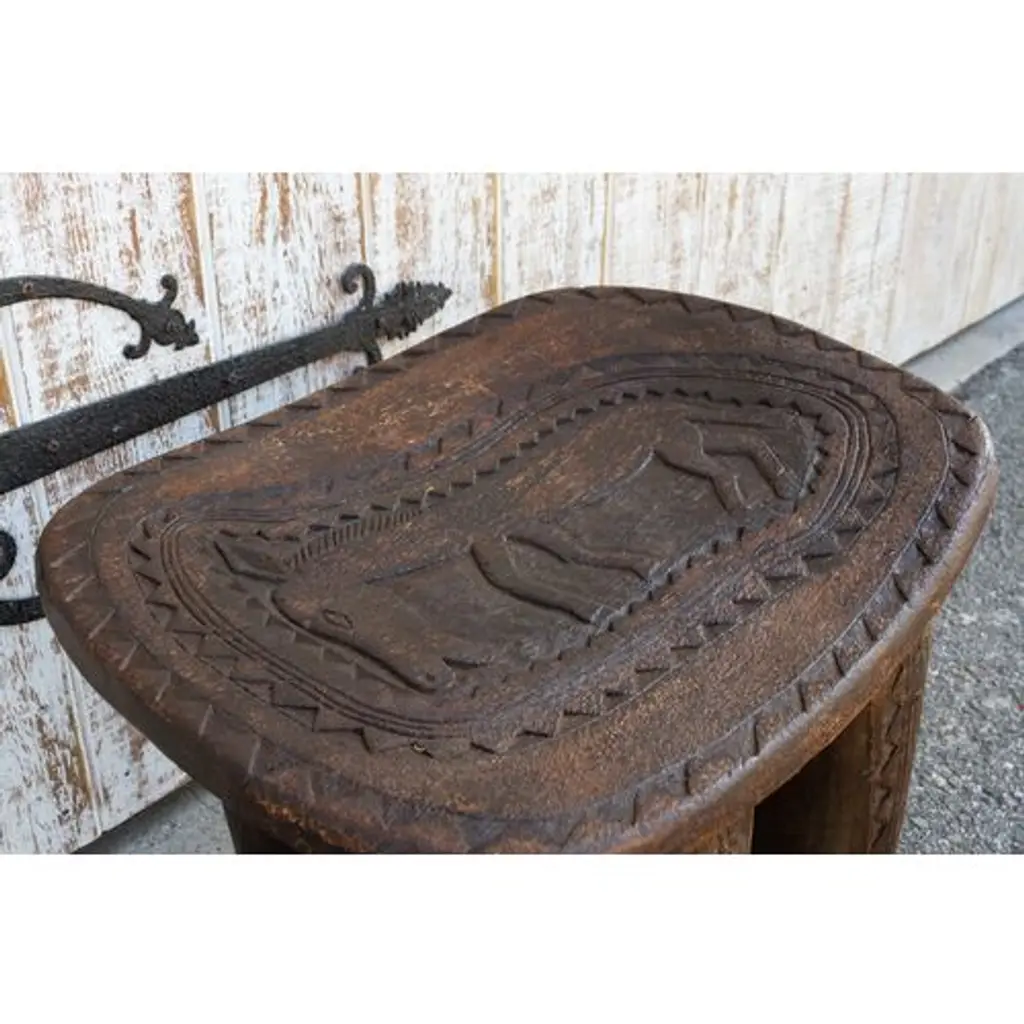 An antique tribal carved senufo table with a concave top that can be used as a side table or as a stool. It features a hand-carved donkey with a geometric tribal border all around. This antique table is carved from a single log of wood and stands on four solid tapered legs that feature carved tribal motifs. This stool has a warm dark aged worn patina.