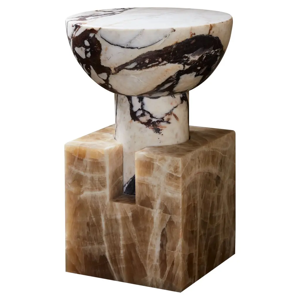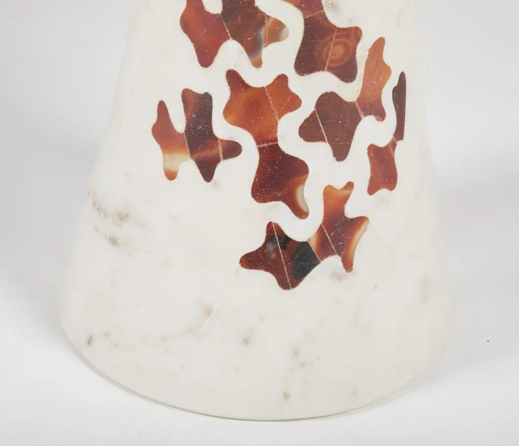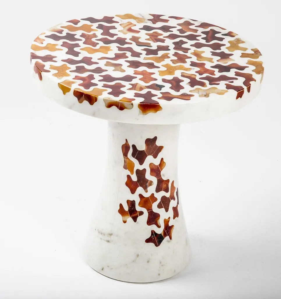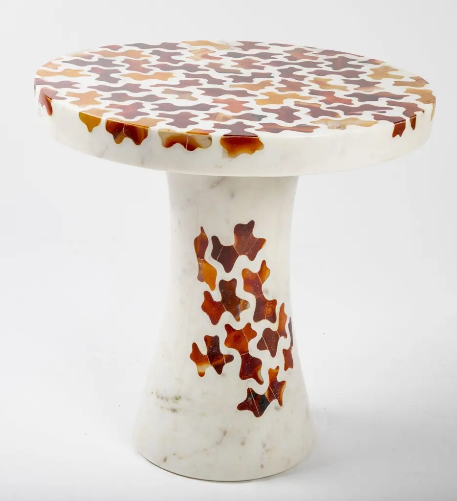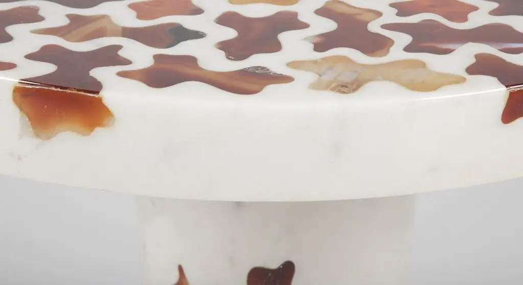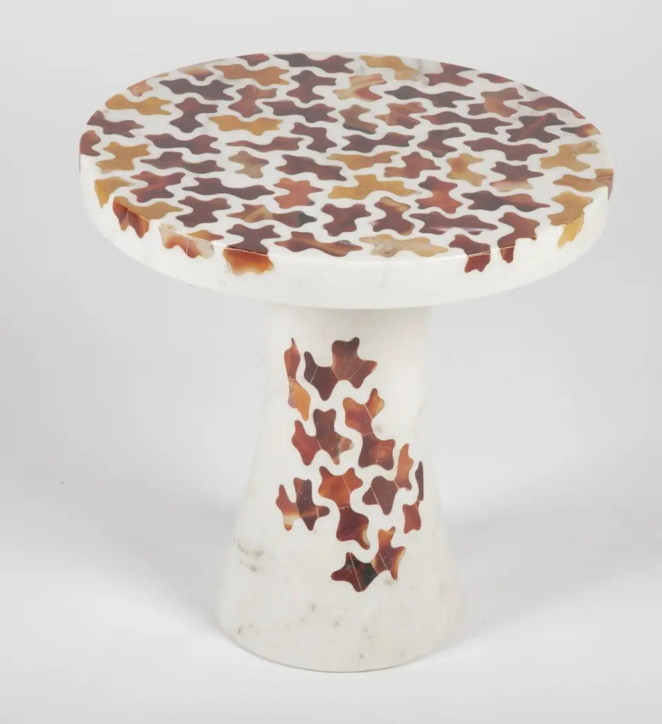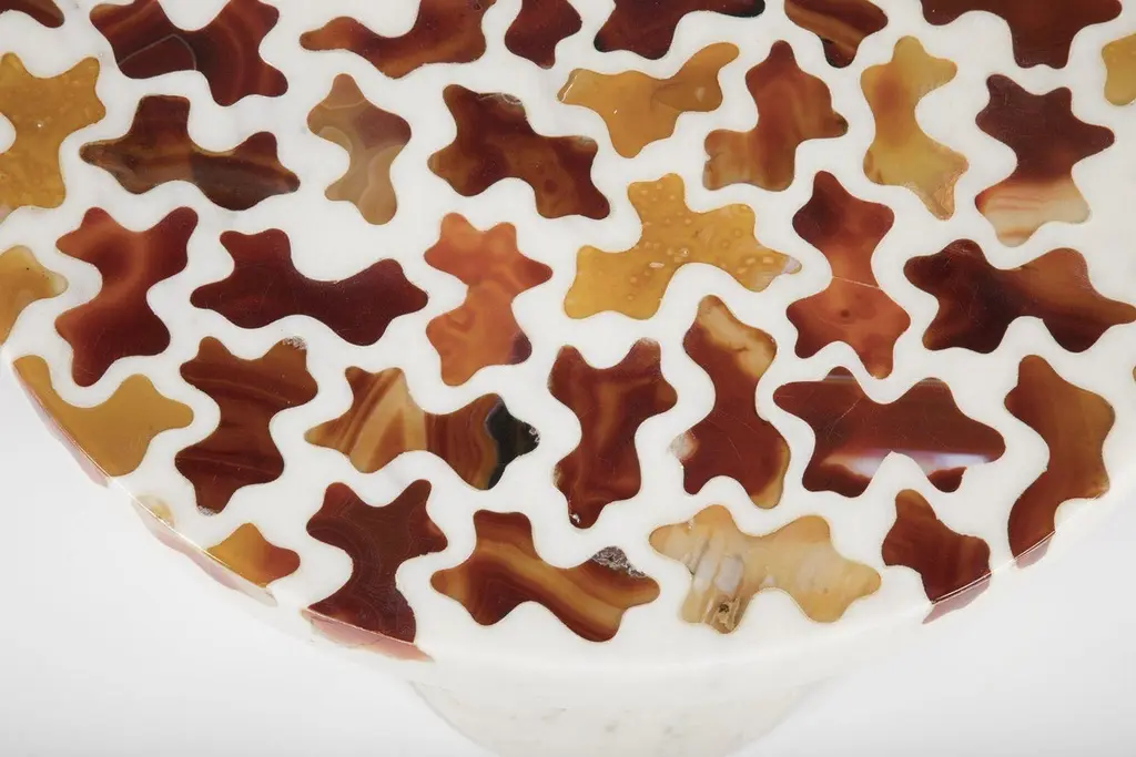 The Agate Jigsaw table is a part of the Ornamenti collection. Delicately cut rare pieces of agate are carefully inlaid into the base stone by our master craftsmen. The collection features modern designs using the Pietra Dura method originated in Florence in the 16th century.Agate Jigsaw Table in White Marble Size- 18" x 18" x 18" H.Materials - White Marble , Hand Carved, Semi matt finished.Buyer Cancellation-The cancellation charge is 25% which increases to 50% if the production is started.Prices do not include shipping from India (for custom orders) or our MN warehouse (items from stock). That will be additional.