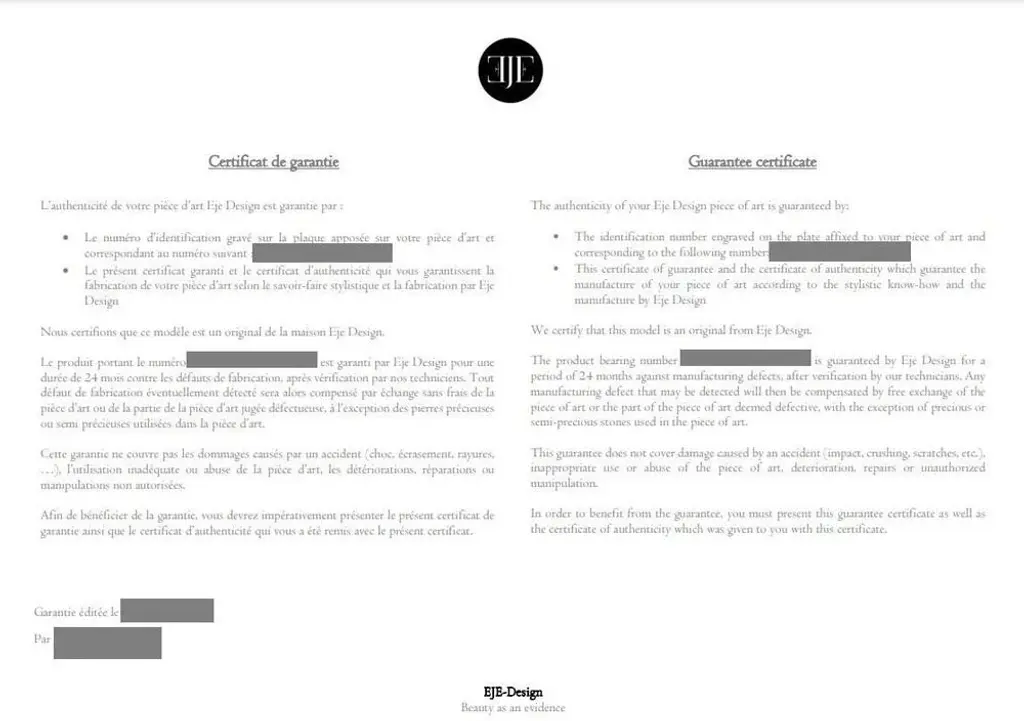 Eje-Design celebrates the architectural nature of form. This abstract and sculptural creation from Eje-Design, as refined as it is astonishing, aspires to a world of softness and originality. Both original and classic, soft and worked, it will bring a touch of creation and elegance to your interior. Dressed in its Black Diamond lacquer color developed by the Rolls Royce brand and decorated with 24 carat gold leaf, this side console will captivate you. Limited Series: 489 pieces Designer : Jaa This side table is made from a block of epoxy resin. The pattern is in 24 carat gold leaf. Dimensions : Height: 50cm Width: 46cm Depth: 28cm In a world where mass production predominates, we have chosen to focus on craftsmanship and quality. Each creation we offer is made to order by our passionate and dedicated employees, thus ensuring careful attention to every detail. For each order, a production time of approximately 3 months is expected. This may seem long, but it is a guarantee of quality. Unlike mass-produced products, our creations require time to be made with the level of care and passion that we claim. Signed by Maker,Labeled by Maker,Stamped by Maker,Imprinted by Maker,Labeled with Country of Origin,Numbered