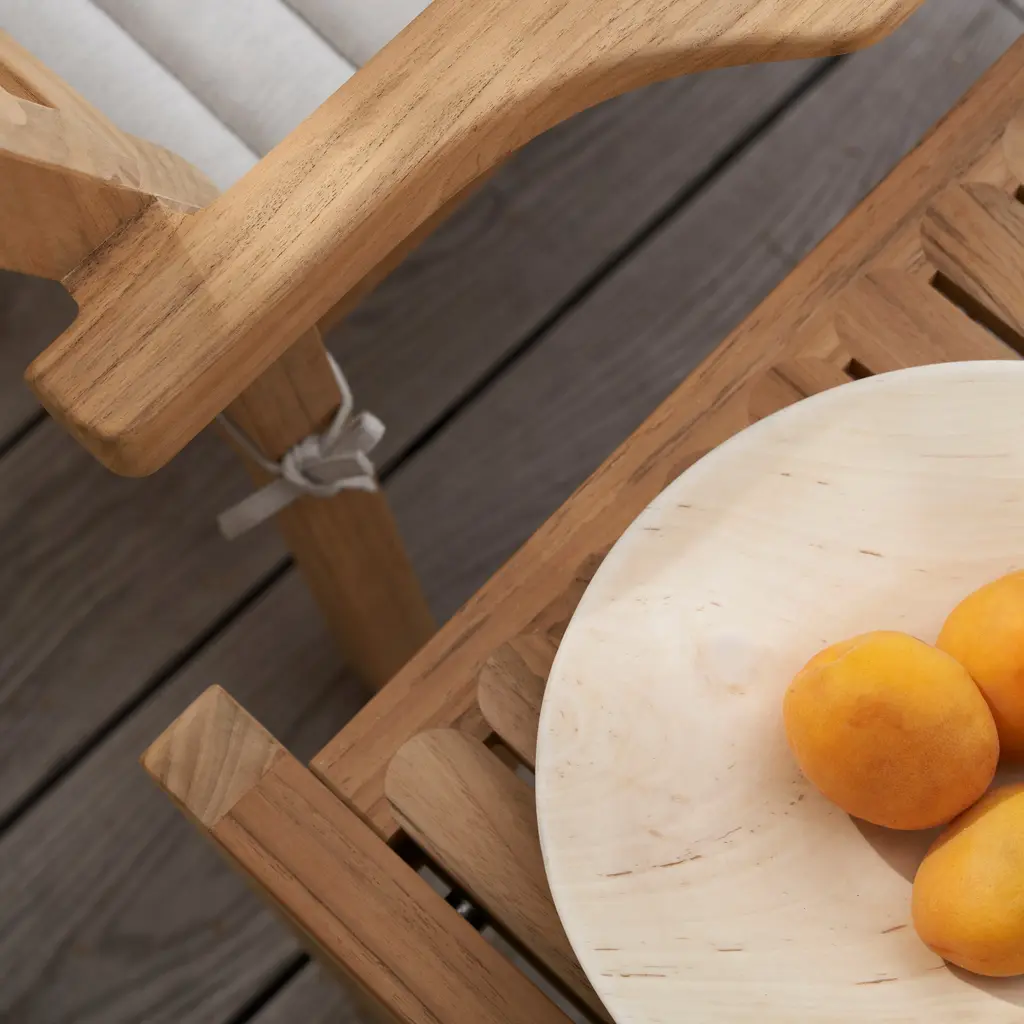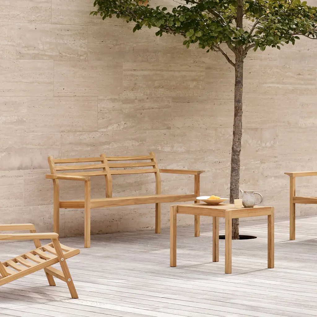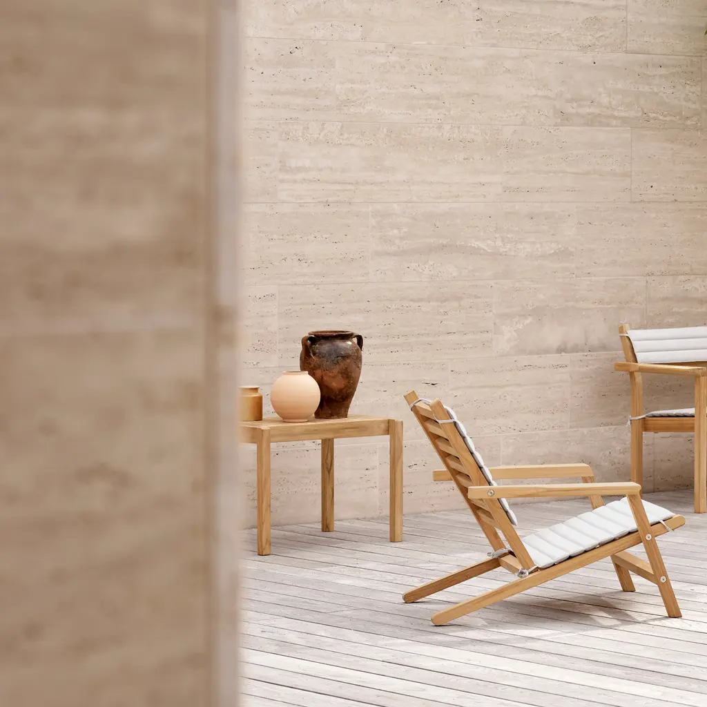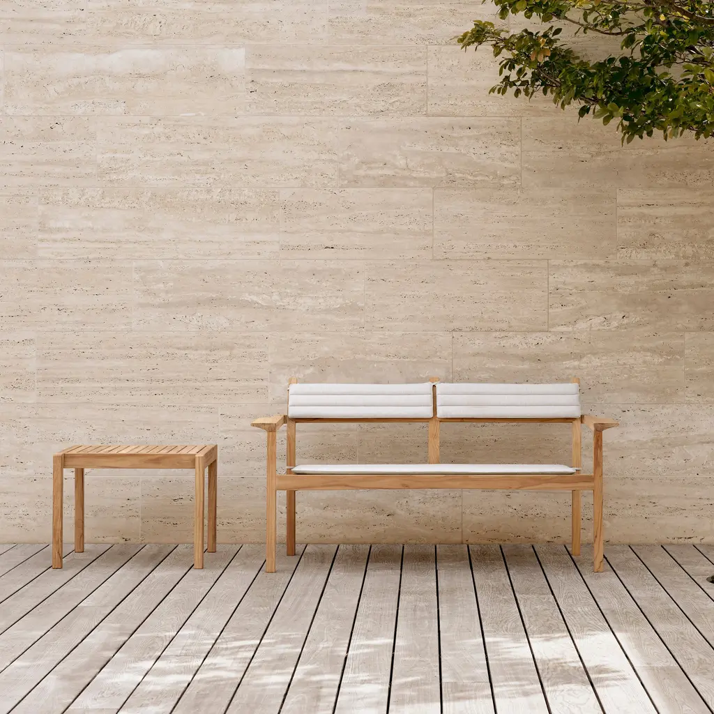 A versatile essential in designer Alfred Homann’s outdoor furniture series, this side table can be paired with a chair or even function as an extra seat. With strict lines elegantly combined with soft, rounded details, the piece is fashioned in untreated FSC-certified teak, prized for its durability and beautiful patina that develops over time. For a comfortable perch, Carl Hansen & Søn adds an optional cushion in a durable recycled and waterproof fabric in an easy neutral shade.