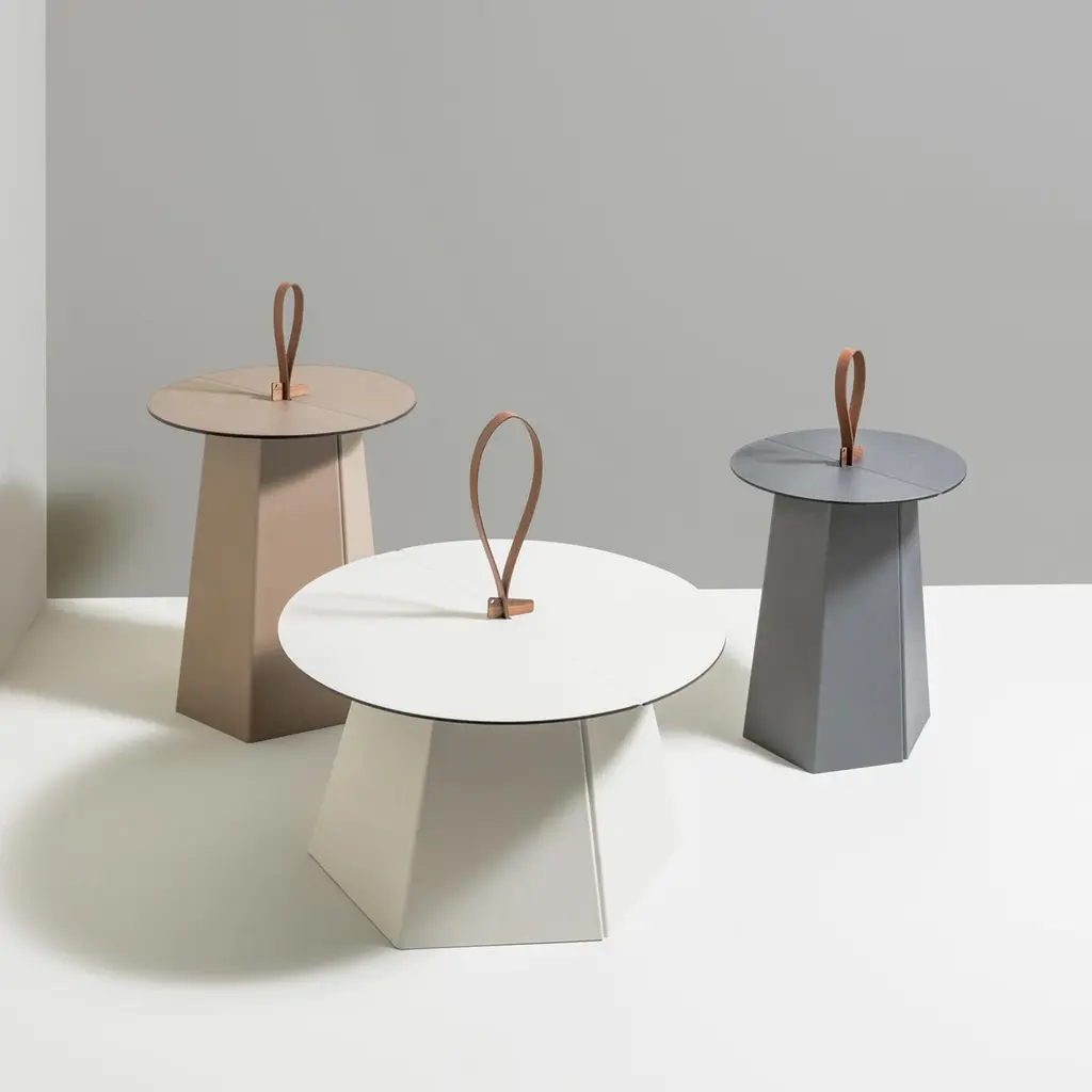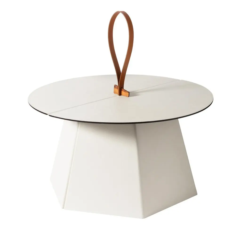 Part of the Aile collection, this side table exudes understated elegance with its soft, white leather frame and essential lines. This easy-to-use foldable design is a must-have in any home, adding surface space when needed and folded away in a simple gesture when not in use. Perfect in an entryway, living room and even bedroom, this refined design has a hexagonal base and a round top with a leather handle in the center that folds the table in one step when pulled up.
