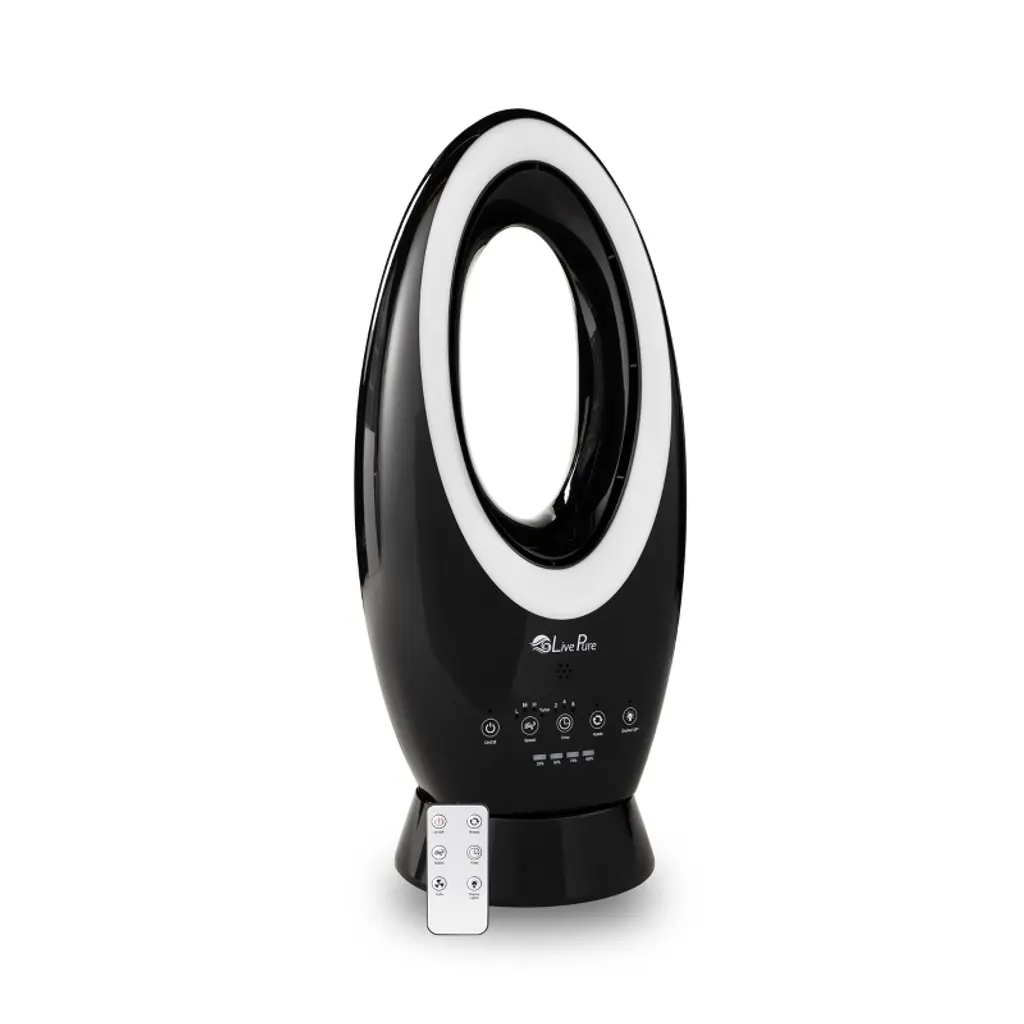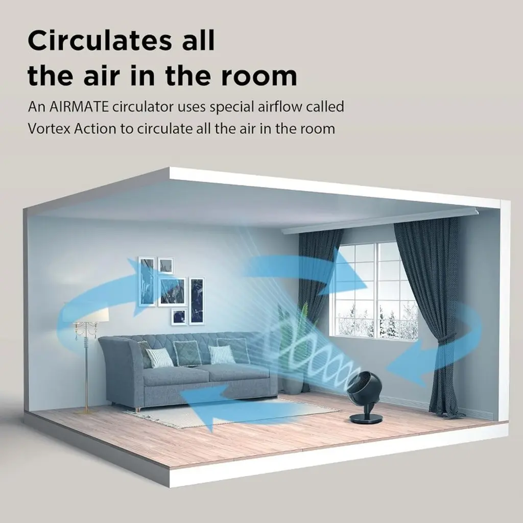 AIRMATE air circulation fan adopts aerodynamic turbine design, which can increase wind speed. It has a powerful internal circulation system, which can quickly disturb the indoor air circulation, with a swing range of 90 degrees to 120 degrees. The fan is equipped with an energy-saving DC motor to control and generate stronger airflow. This fan is larger than similar table fans, and has a larger air volume, lower energy consumption, better air disturbance effect, and higher quality. The maximum wind speed is 20 ft per second, which can cool and circulate air in a room of 850 sq ft. If you like floor fans with large air volume, this one will be a good choice for you. The fan can turn 120 degrees left and right and 90 degrees up and down. This air circulation fan comes with a remote control and 10-speed wind speed settings. The fan has a built-in 12H timer and baby soft wind mode. The AIRMATE portable fan measures 11.5 inches, making it perfect for dorms, offices, or bedside tables in your room. Its stylish and modern appearance can easily enhance the beauty of your home or office environment. Product Details: 5 black natural palm patterned ABS blades. Matte black finish.