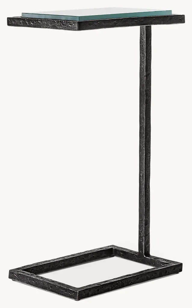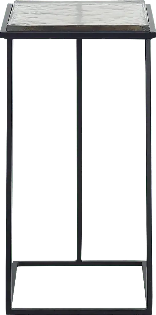 A perfect fusion of modern sophistication and sleek design, this Ajeli iron accent table will add a contemporary flair to your living space. The angled metal frame supports a thick piece of cast glass that catches and reflects light beautifully. This table serves as both a functional piece and a conversation starter.