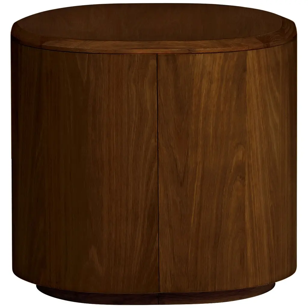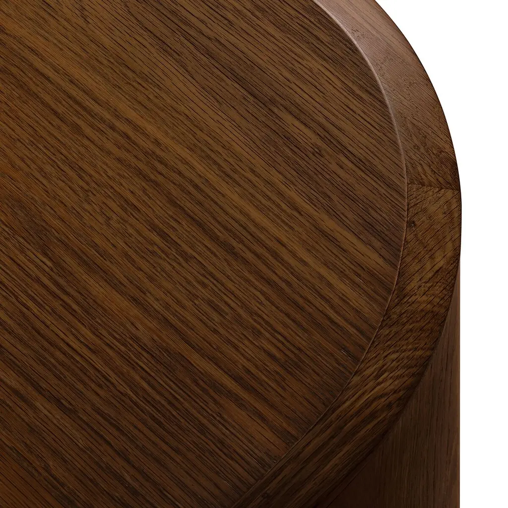 The Akio Side Tables are designed as bold island-like shapes, with a recessed plinth giving them a floating appearance. The beveled wood top highlights the tables' organic lines.