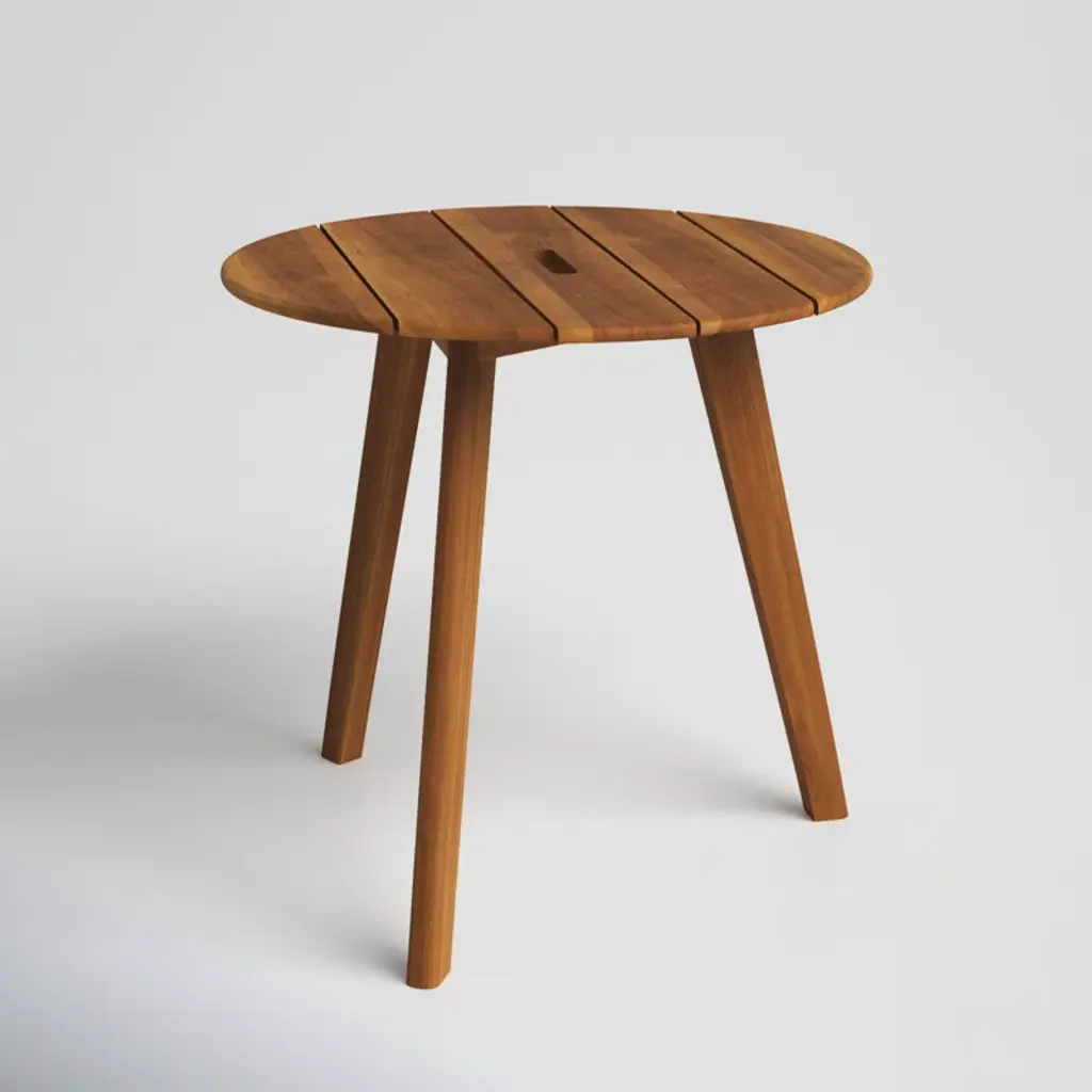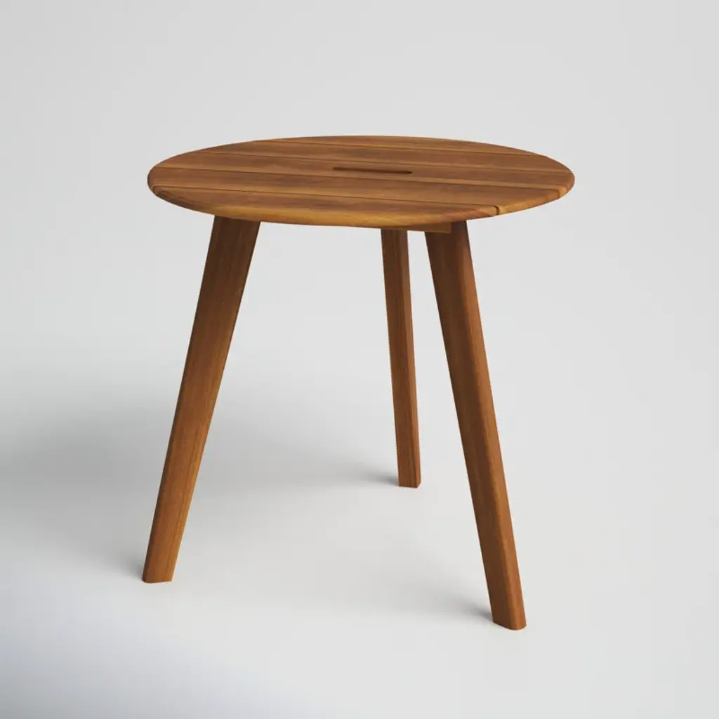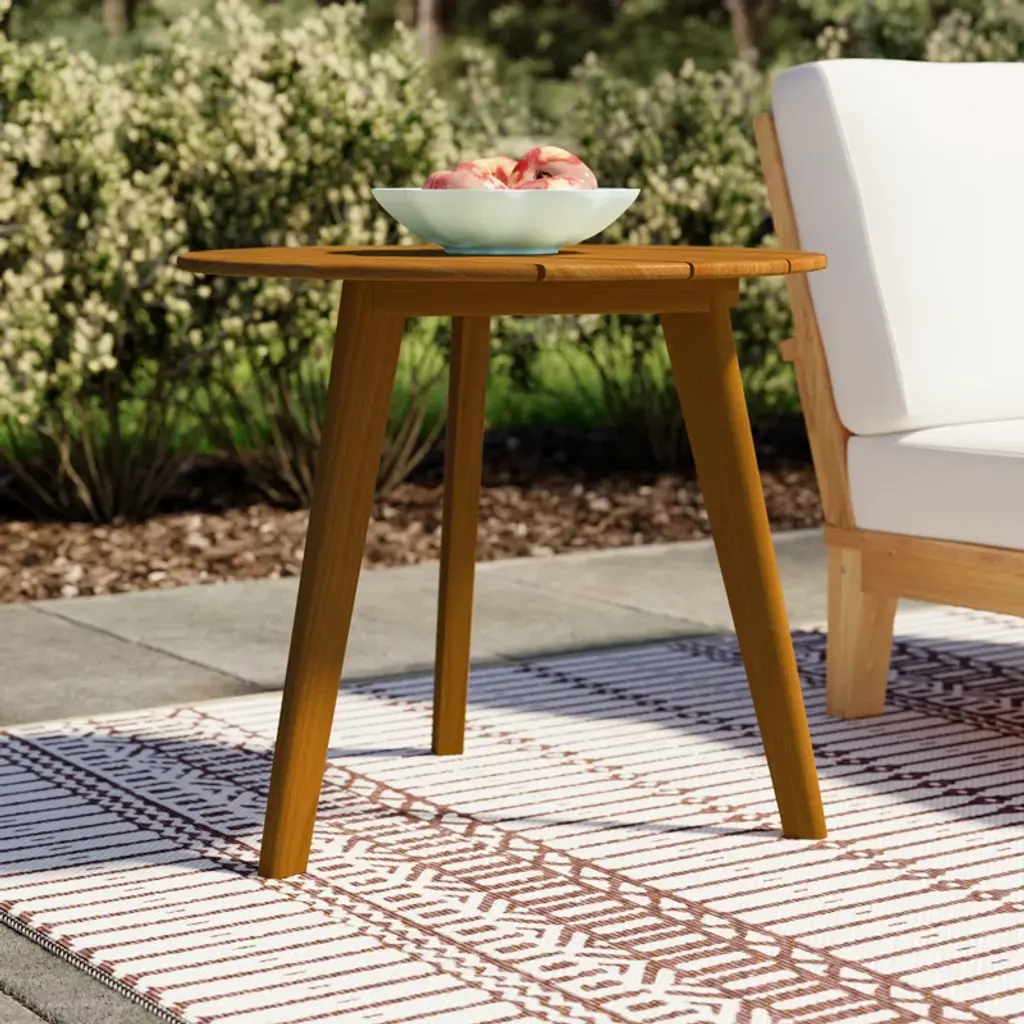 Why not bring a little California coastal sunshine to your backyard with this teak end table? It's crafted from solid teak wood with a circular, paneled tabletop and three splayed legs. Teak is a naturally resilient hardwood that weathers both sun and rain, while developing a beautiful gray patina with time. If you want to maintain its original, warm wood grain finish, you can apply teak oil each season. Plus, this side table has a handle in the tabletop, so you can move it around easily to make room for company.