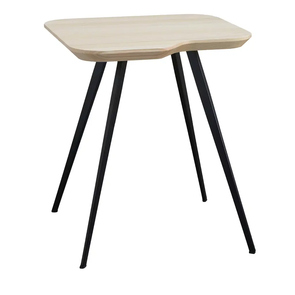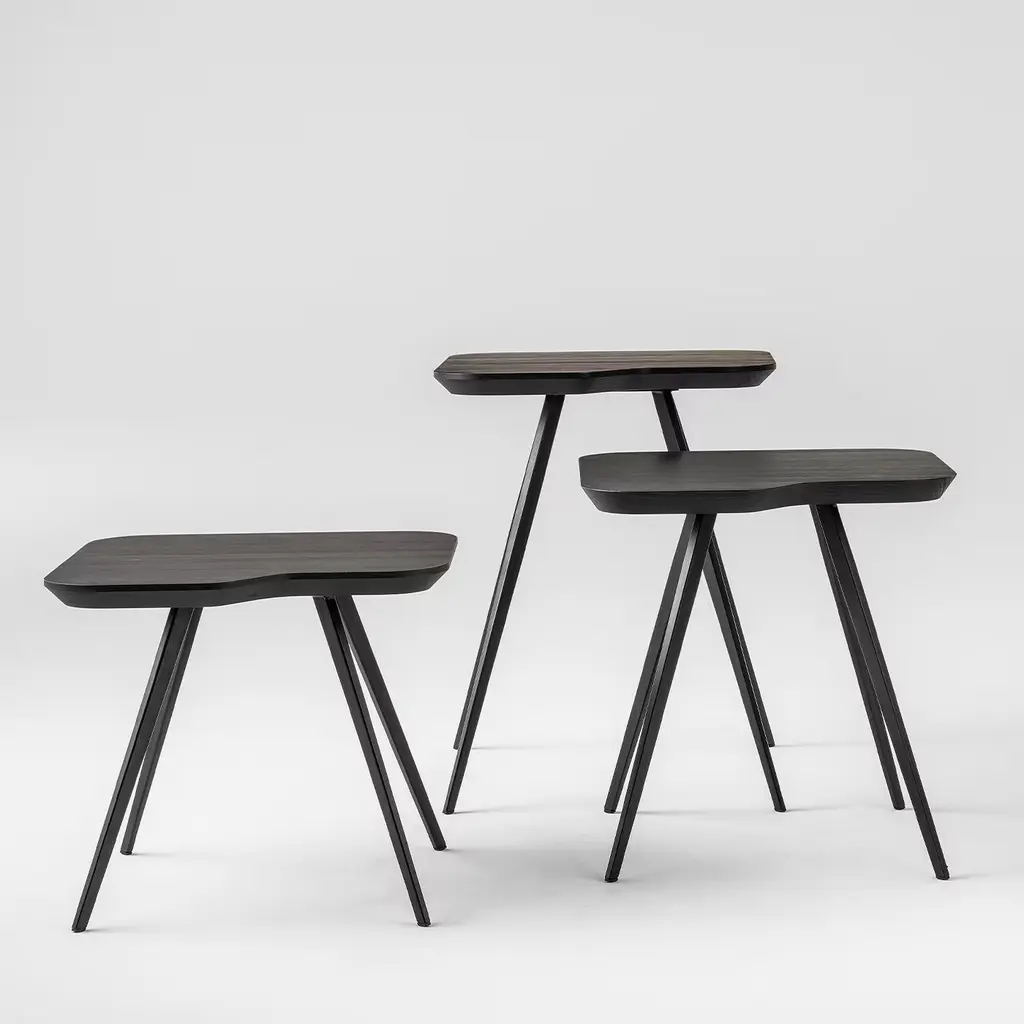 As a standalone piece or arranged with others from the series, this small table will make the most charming effect in a contemporary lounge or living room thanks to its slender silhouette and sturdy construction. Supported by four slanted, thin legs of black-finished metal, the irregularly shaped top of solid ash wood has rounded corners, beveled edges and a matching black open-pore finish. Featured in the low version, this table belongs to the Aky Small Met Collection that includes three heights and several finishes, please ask the Concierge for details.