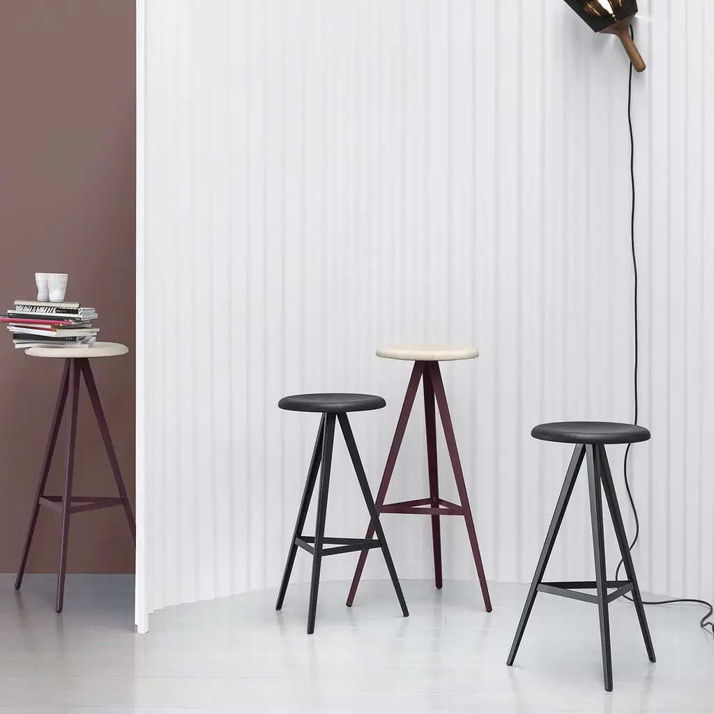 This tall side table is a clean and essential design of Nordic inspiration, created by Emilio Nanni for the Aky Collection of side and coffee tables. Resting on a tripod of sharp and slim, slanted legs fashioned of black-lacquered metal, it features a thin round top in black slate. It will best complement a contemporary interior of minimalist inspiration.