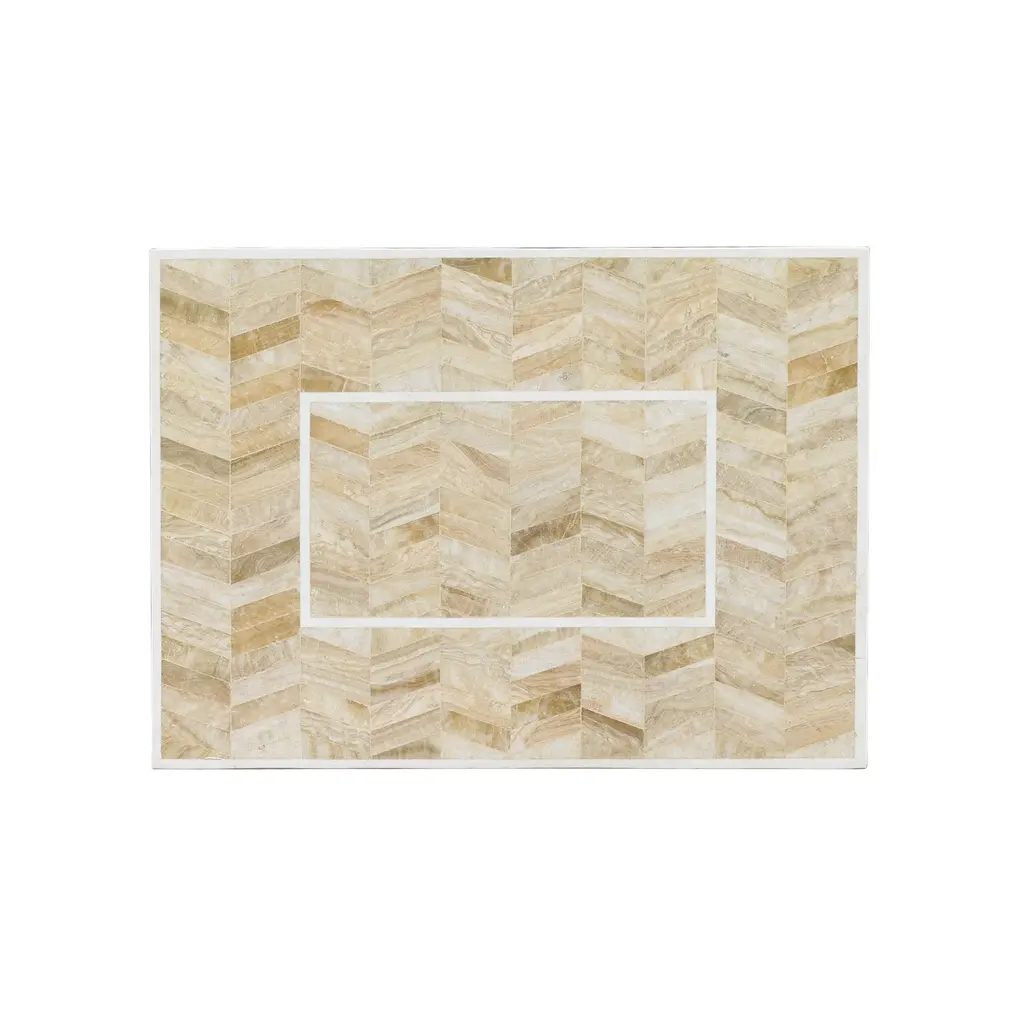 Classic Parson's style table with a lower shelf, fully inlaid with crystal stone in a herringbone pattern. The top is further accented with a bone border treatment and and incised box pattern adding further artistic detail. Ships In 4-5 Weeks Bone border on top Herringbone crystal stone design This image is for illustrative purposes only. The colors shown are accurate within the constraints of lighting, photography, and the color accuracy of your screen.