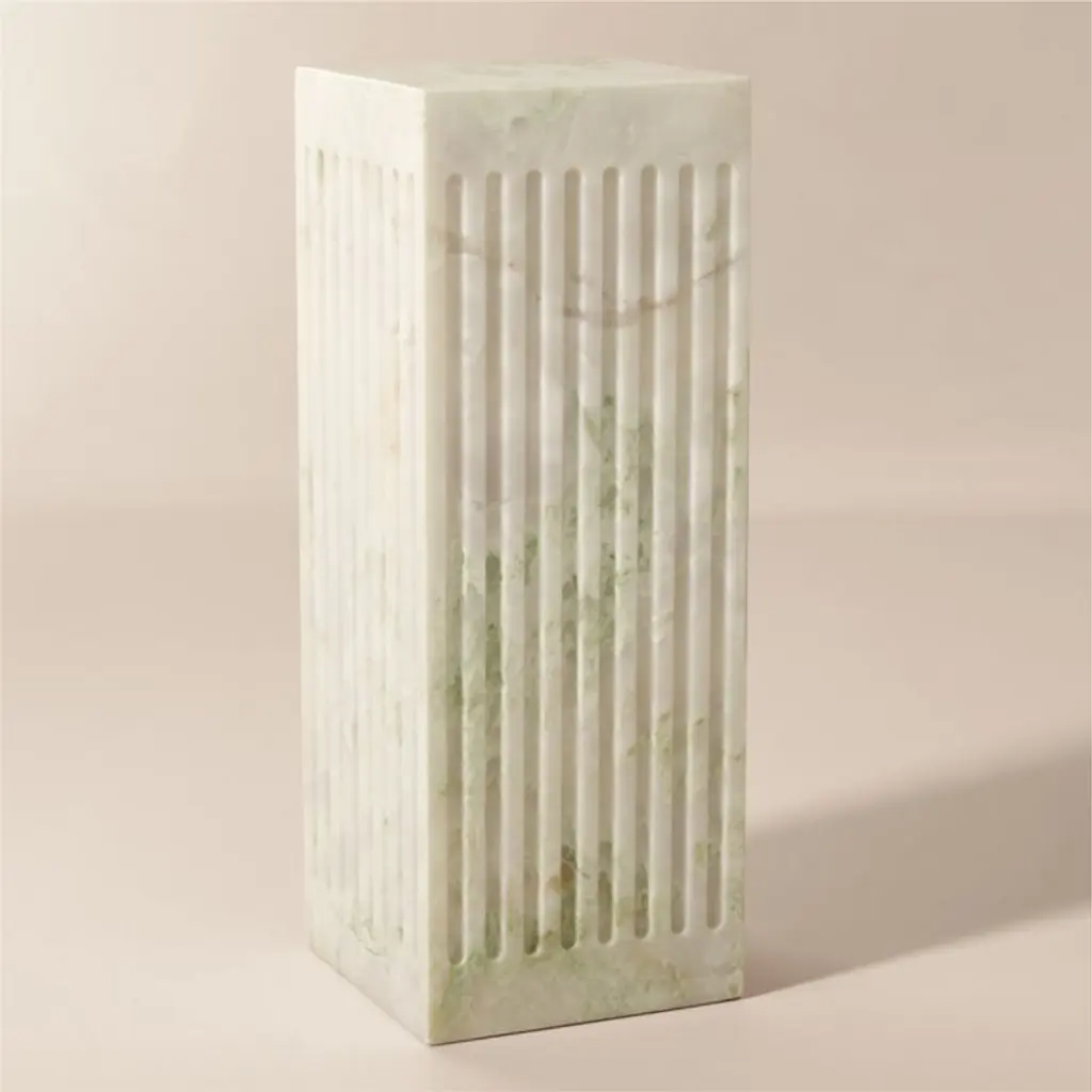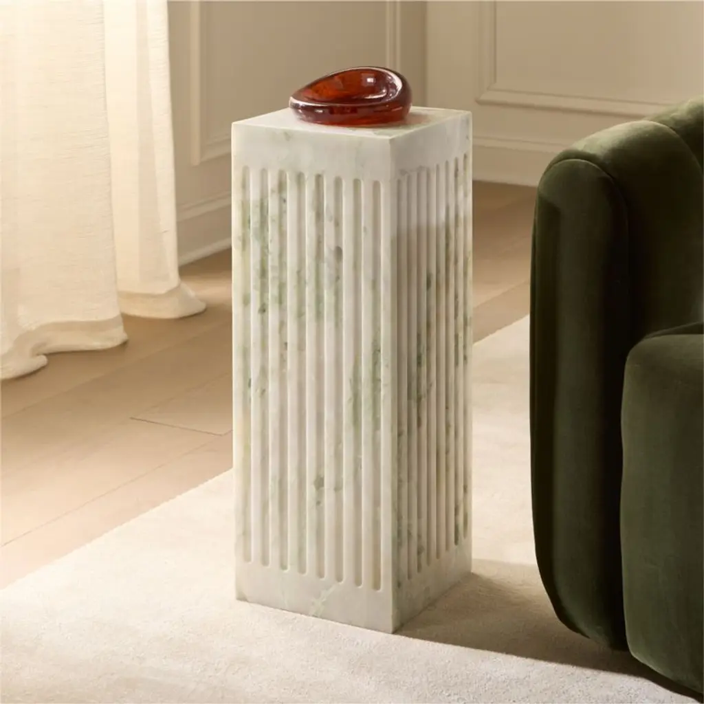 Modern side table by NYC-based designer David Aguirre is defined by fluted lady onyx marble with rich streaks of green and pink that make each piece unique. The marble is honed for a satiny, smooth finish. CB2 exclusive.
